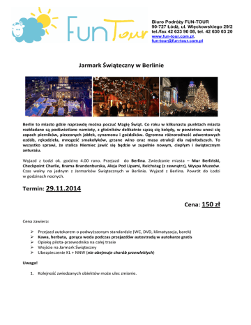 Biuro Podróży FUN-TOUR 90-727 Łódź, ul. Więckowskiego 29/2 tel./fax 42 633 90 08, tel. 42 630 03 20 www.fun-tour.com.pl, [email protected] Jarmark Świąteczny w Berlinie Berlin to miasto gdzie naprawdę można poczuć Magię Świąt. Co roku w kilkunastu punktach miasta rozkładane są podświetlane namioty, z głośników delikatnie sączą się kolędy, w powietrzu unosi się zapach pierników, pieczonych jabłek, cynamonu i goździków. Ogromna różnorodność adwentowych ozdób, rękodzieła, mnogość smakołyków, grzane wino oraz masa atrakcji dla najmłodszych. To wszystko sprawi, że stolica Niemiec jawić się będzie w zupełnie nowym, ciepłym i świątecznym anturażu. Wyjazd z Łodzi ok. godziny 4.00 rano. Przejazd do Berlina. Zwiedzanie miasta – Mur Berliński, Checkpoint Charlie, Brama Brandenburska, Aleja Pod Lipami, Reichstag (z zewnątrz), Wyspa Muzeów. Czas wolny na jednym z Jarmarków Świątecznych w Berlinie. Wyjazd z Berlina. Powrót do Łodzi w godzinach nocnych. Termin: 29.11.2014 Cena: 150 zł Cena zawiera: Przejazd autokarem o podwyższonym standardzie (WC, DVD, klimatyzacja, barek) Kawa, herbata, gorąca woda podczas przejazdów autostradą w autokarze gratis Opiekę pilota-przewodnika na całej trasie Wejście na Jarmark Świąteczny Ubezpieczenie KL + NNW (nie obejmuje chorób przewlekłych) Uwaga! 1. Kolejność zwiedzanych obiektów może ulec zmianie.