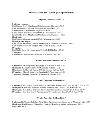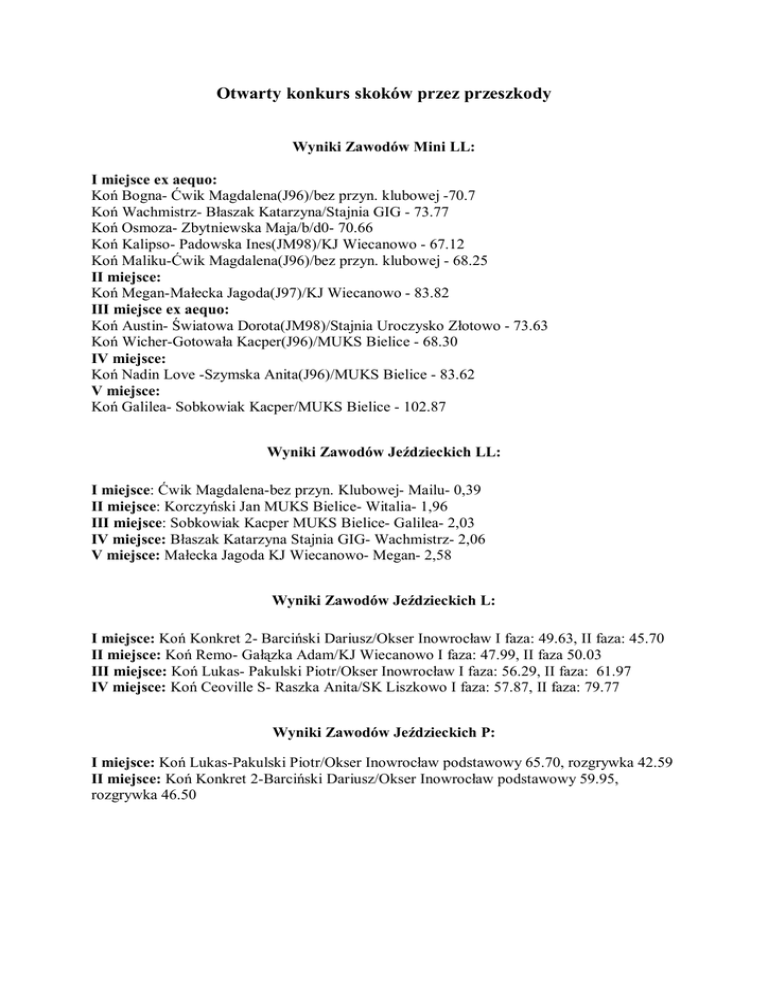 Otwarty konkurs skoków przez przeszkody Wyniki Zawodów Mini LL: I miejsce ex aequo: Koń Bogna- Ćwik Magdalena(J96)/bez przyn. klubowej -70.7 Koń Wachmistrz- Błaszak Katarzyna/Stajnia GIG - 73.77 Koń Osmoza- Zbytniewska Maja/b/d0- 70.66 Koń Kalipso- Padowska Ines(JM98)/KJ Wiecanowo - 67.12 Koń Maliku-Ćwik Magdalena(J96)/bez przyn. klubowej - 68.25 II miejsce: Koń Megan-Małecka Jagoda(J97)/KJ Wiecanowo - 83.82 III miejsce ex aequo: Koń Austin- Światowa Dorota(JM98)/Stajnia Uroczysko Złotowo - 73.63 Koń Wicher-Gotowała Kacper(J96)/MUKS Bielice - 68.30 IV miejsce: Koń Nadin Love -Szymska Anita(J96)/MUKS Bielice - 83.62 V miejsce: Koń Galilea- Sobkowiak Kacper/MUKS Bielice - 102.87 Wyniki Zawodów Jeździeckich LL: I miejsce: Ćwik Magdalena-bez przyn. Klubowej- Mailu- 0,39 II miejsce: Korczyński Jan MUKS Bielice- Witalia- 1,96 III miejsce: Sobkowiak Kacper MUKS Bielice- Galilea- 2,03 IV miejsce: Błaszak Katarzyna Stajnia GIG- Wachmistrz- 2,06 V miejsce: Małecka Jagoda KJ Wiecanowo- Megan- 2,58 Wyniki Zawodów Jeździeckich L: I miejsce: Koń Konkret 2- Barciński Dariusz/Okser Inowrocław I faza: 49.63, II faza: 45.70 II miejsce: Koń Remo- Gałązka Adam/KJ Wiecanowo I faza: 47.99, II faza 50.03 III miejsce: Koń Lukas- Pakulski Piotr/Okser Inowrocław I faza: 56.29, II faza: 61.97 IV miejsce: Koń Ceoville S- Raszka Anita/SK Liszkowo I faza: 57.87, II faza: 79.77 Wyniki Zawodów Jeździeckich P: I miejsce: Koń Lukas-Pakulski Piotr/Okser Inowrocław podstawowy 65.70, rozgrywka 42.59 II miejsce: Koń Konkret 2-Barciński Dariusz/Okser Inowrocław podstawowy 59.95, rozgrywka 46.50