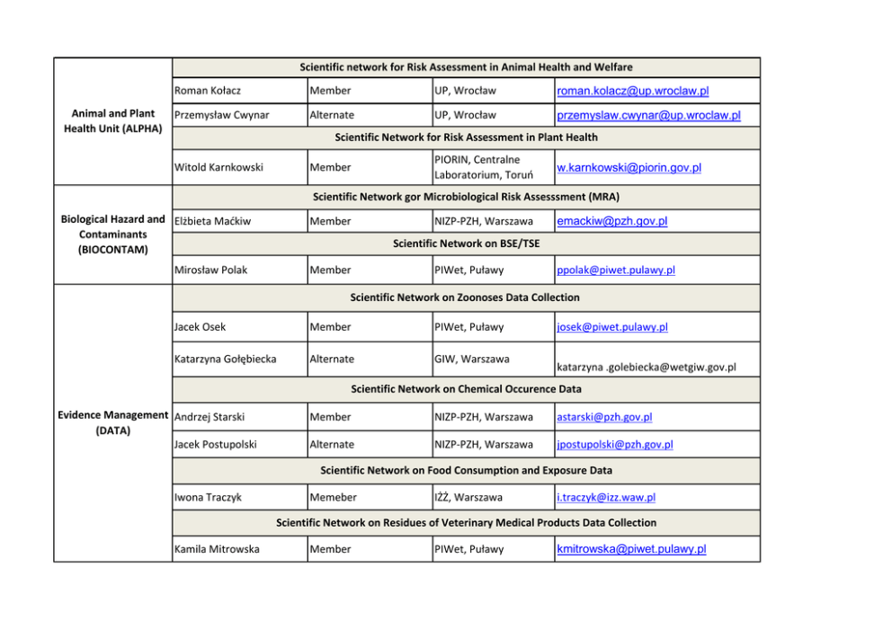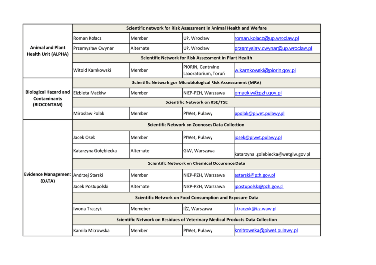 Scientific network for Risk Assessment in Animal Health and Welfare Animal and Plant Health Unit (ALPHA) Roman Kołacz Member UP, Wrocław [email protected] Przemysław Cwynar Alternate UP, Wrocław [email protected] Scientific Network for Risk Assessment in Plant Health Witold Karnkowski PIORIN, Centralne Laboratorium, Toruń Member [email protected] Scientific Network gor Microbiological Risk Assesssment (MRA) Biological Hazard and Elżbieta Maćkiw Contaminants (BIOCONTAM) Member NIZP-PZH, Warszawa [email protected] Scientific Network on BSE/TSE Mirosław Polak Member PIWet, Puławy [email protected] Scientific Network on Zoonoses Data Collection Jacek Osek Member PIWet, Puławy Katarzyna Gołębiecka Alternate GIW, Warszawa [email protected] katarzyna [email protected] Scientific Network on Chemical Occurence Data Evidence Management Andrzej Starski (DATA) Jacek Postupolski Member NIZP-PZH, Warszawa [email protected] Alternate NIZP-PZH, Warszawa [email protected] Scientific Network on Food Consumption and Exposure Data Iwona Traczyk Memeber IŻŻ, Warszawa [email protected] Scientific Network on Residues of Veterinary Medical Products Data Collection Kamila Mitrowska Member PIWet, Puławy [email protected] Scientific Network on Food Ingredients and Packaging Food Ingredients and Packaging (FIP) Marzena Pawlicka Member NIZP-PZH, Warszawa [email protected] Scientific Network for Risk Assessment of GMOs (Environmental Risk Assessment) Zbigniew Dąbrowski Member SGGW, Warszawa [email protected] GMO Scientific Network for Risk Assessment of GMOs (Food and Feed) Sławomir Sowa Member IHAR Radzików [email protected] Scientific Network of Pesticide Steering Committee Pesticides Robert Bańkowski Alternate NIZP-PZH, Warszawa [email protected] Scientific Network on Pesticide Monitoring (MRL) Bożena Morzycka Member WSSE, Warszawa [email protected] Scientific Network on Emerging Risks Exchange (EREN) Scientific Committee & Emerging Risks (SCER) Jan K. Ludwicki Member NIZP-PZH, Warszawa [email protected] Scientific Network for Risk Assessment of Nanotechnologies in Food and Feed Wojciech Wąsowicz Member Instytut Medycyny Pracy, Łódź [email protected]