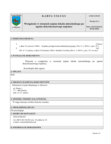 Urząd Miejski K A R TA U S Ł U G I GNiE-GM-02 Wersja Nr 2 w Złotowie Wstąpienie w stosunek najmu lokalu mieszkalnego po zgonie dotychczasowego najemcy Data zatwierdzenia: 01.02.2016 1. PODSTAWA PRAWNA 1. Ustawa z dnia 14 czerwca 1960 r. - Kodeks postępowania administracyjnego ( Dz. U. z 2016 r., poz. 23 ), 2. Art. 691 § 1-3 ustawy z dnia 23 kwietnia 1964 r. Kodeks Cywilny (Dz.U. z 2014 r., poz. 121 ze zm.) 2. WYMAGANE DOKUMENTY . Wniosek o wstąpienie w stosunek najmu lokalu mieszkalnego po zgonie dotychczasowego najemcy. . Kserokopia aktu zgonu. 3. OPŁATY Brak 4. MIEJSCE ZŁOŻENIA DOKUMENTÓW Sekretariat Urzędu Miejskiego w Złotowie al. Piasta 1 77 – 400 Złotów pok. nr 13, parter. 5. SPOSÓB I TERMIN ZAŁATWIENIA W ciągu miesiąca od dnia złożenia wniosku. 6. TRYB ODWOŁAWCZY Nie przysługuje. 7. OSOBY DO KONTAKTU Sylwia Muzioł tel. (067) 263 26 40 wew. 41 pokój nr 14 e-mail: [email protected] 8. INFORMACJE DODATKOWE Strona 1/2 Urząd Miejski K A R TA U S Ł U G I GNiE-GM-02 Wersja Nr 2 w Złotowie Wstąpienie w stosunek najmu lokalu mieszkalnego po zgonie dotychczasowego najemcy Data zatwierdzenia: 01.02.2016 W razie śmierci najemcy lokalu mieszkalnego w stosunek najmu wstępują: małżonek, niebędący współnajemcą lokalu, dzieci najemcy i jego współmałżonka, inne osoby, wobec których najemca był obowiązany do świadczeń alimentacyjnych, oraz osoba, która pozostawała faktycznie we wspólnym pożyciu z najemcą. Osoby te mogą wstąpić w stosunek najmu lokalu mieszkalnego, jeżeli stale zamieszkiwały z najemcą w tym lokalu do chwili jego śmierci. 9. WZORY WNIOSKÓW Wniosek o wstąpienie w stosunek najmu lokalu mieszkalnego po zgonie dotychczasowego najemcy. Imię i nazwisko Data Opracował Sylwia Muzioł 01.02.2016 Zatwierdził Małgorzata Chołodowska 01.02.2016 Osoba odpowiedzialna za aktualizację karty Sylwia Muzioł Strona 2/2