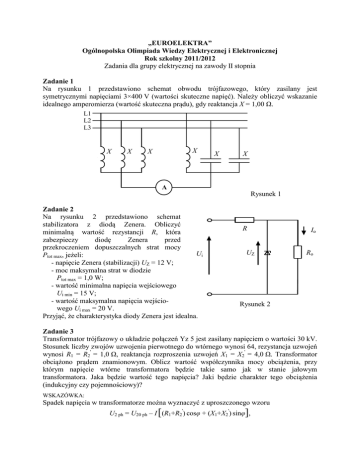 „EUROELEKTRA” Ogólnopolska Olimpiada Wiedzy Elektrycznej i Elektronicznej Rok szkolny 2011/2012 Zadania dla grupy elektrycznej na zawody II stopnia Zadanie 1 Na rysunku 1 przedstawiono schemat obwodu trójfazowego, który zasilany jest symetrycznymi napięciami 3×400 V (wartości skuteczne napięć). Należy obliczyć wskazanie idealnego amperomierza (wartość skuteczna prądu), gdy reaktancja X = 1,00 Ω. R L1 SL2 TL3 X X X X X X X X X X X X A Rysunek 1 Zadanie 2 Na rysunku 2 przedstawiono schemat stabilizatora z diodą Zenera. Obliczyć minimalną wartość rezystancji R, która zabezpieczy diodę Zenera przed przekroczeniem dopuszczalnych strat mocy Uii U Ptot max, jeżeli: - napięcie Zenera (stabilizacji) UZ = 12 V; - moc maksymalna strat w diodzie Ptot max = 1,0 W; - wartość minimalna napięcia wejściowego Ui min = 15 V; - wartość maksymalna napięcia wejściowego Ui max = 20 V. Przyjąć, że charakterystyka diody Zenera jest idealna. R R UZz U II0o R Ro0 Rysunek 2 Zadanie 3 Transformator trójfazowy o układzie połączeń Yz 5 jest zasilany napięciem o wartości 30 kV. Stosunek liczby zwojów uzwojenia pierwotnego do wtórnego wynosi 64, rezystancja uzwojeń wynosi R1 = R2' = 1,0 Ω, reaktancja rozproszenia uzwojeń X1 = X2' = 4,0 Ω. Transformator obciążono prądem znamionowym. Oblicz wartość współczynnika mocy obciążenia, przy którym napięcie wtórne transformatora będzie takie samo jak w stanie jałowym transformatora. Jaka będzie wartość tego napięcia? Jaki będzie charakter tego obciążenia (indukcyjny czy pojemnościowy)? WSKAZÓWKA: Spadek napięcia w transformatorze można wyznaczyć z uproszczonego wzoru U2 ph = U20 ph – I [(R1+R2') cosφ + (X1+X2') sinφ], w którym obliczona wartość spadku napięcia odnosi się do napięcia fazowego transformatora (oznaczonego dolnym indeksem „ph”), prąd I oznacza prąd fazowy strony wtórnej transformatora, a φ to kąt fazowy obciążenia. Zadanie 4 Na rysunku 3 przedstawiono schemat układu napędowego z silnikiem prądu stałego zasilanego z akumulatora za pośrednictwem przekształtnika impulsowego prądu stałego, czyli tak zwanego choppera. Obliczyć wartość średnią prądu ItIt silnika It oraz wartość średnią napięcia na zaciskach PWM silnika Ut w stanie ustalonym, jeżeli: - napięcie akumulatora U = 48 V; RRt t=1Ω U - siła elektromotoryczna silnika Et = 24 V; E=48V E t=24V E t - rezystancja twornika Rt = 1,0 Ω; - współczynnik wypełnienia impulsów d = ti/Ti = 0,6; - okres impulsowania Ti = 10 ms (fi = 100 Hz). Przyjąć, że w obwodzie przekształtnika nie ma elementów indukcyjnych, a indukcyjność twornika silnika można zaniedbać ze względu na stosunkowo małą częstotliwość impulsowania fi = 100 Hz. Założyć Rysunek 3 również, że siła elektromotoryczna silnika jest stała. Zadanie 5 Idealny wzmacniacz operacyjny pracuje w układzie przedstawionym na rysunku 4. Dane elementów układu są następujące: R1= 10 kΩ, R2= 10 kΩ, XC = 10 kΩ. Prąd źródła prądowego opisuje zależność i(t) = 1,0 cosωt [mA], natomiast napięcie źródła napięciowego zależność u(t) = 10 sinωt [V]. Oblicz wartość skuteczną prądu płynącego przez kondensator przyłączony do wyjścia wzmacniacza operacyjnego. Rysunek 4 Zadanie 6 Silnik indukcyjny klatkowy o następujących danych znamionowych: - napięcie znamionowe Un = 400 V, - prąd znamionowy In = 10 A, - moc znamionowa Pn = 6 kW, - przeciążalność znamionowa λn = Mmax/Mn = 2,7, - znamionowy moment rozruchowy Mr = 1,4Mn, ma uzwojenia stojana połączone w trójkąt. Silnik został obciążony momentem oporowym o wartości zależnej od prędkości obrotowej wirnika opisanej następującym wyrażeniem Mop = 0,4Mn(1+0,8ω/ωs), w którym: ω – prędkość kątowa wirnika silnika, ωs – synchroniczna prędkość kątowa silnika. Postanowiono dokonać rozruchu tego silnika za pomocą przełącznika gwiazda-trójkąt. Czy silnik ruszy i osiągnie ustaloną prędkość obrotową? Jak zmieni się początkowy prąd rozruchowy pobrany z sieci zasilającej przy rozruchu za pomocą przełącznika gwiazda-trójkąt w porównaniu z początkowym prądem rozruchowym silnika połączonego w trójkąt? Opracowali: dr inż. P. Jankowski (zad. 1) – Akademia Morska Gdynia dr inż. A. Gill (zad. 2, 4) – Akademia Morska Gdynia dr inż. R. Kostyszyn (zad. 3, 6) – Akademia Morska Gdynia dr inż. M. Miszewski (zad. 4, 5) – PS PESA Bydgoszcz SA Zatwierdził: Przewodniczący Rady Naukowej Olimpiady dr hab. inż. Andrzej Borys, prof. nadzw. UTP Sprawdził: dr inż. Sławomir Cieślik UTP Bydgoszcz