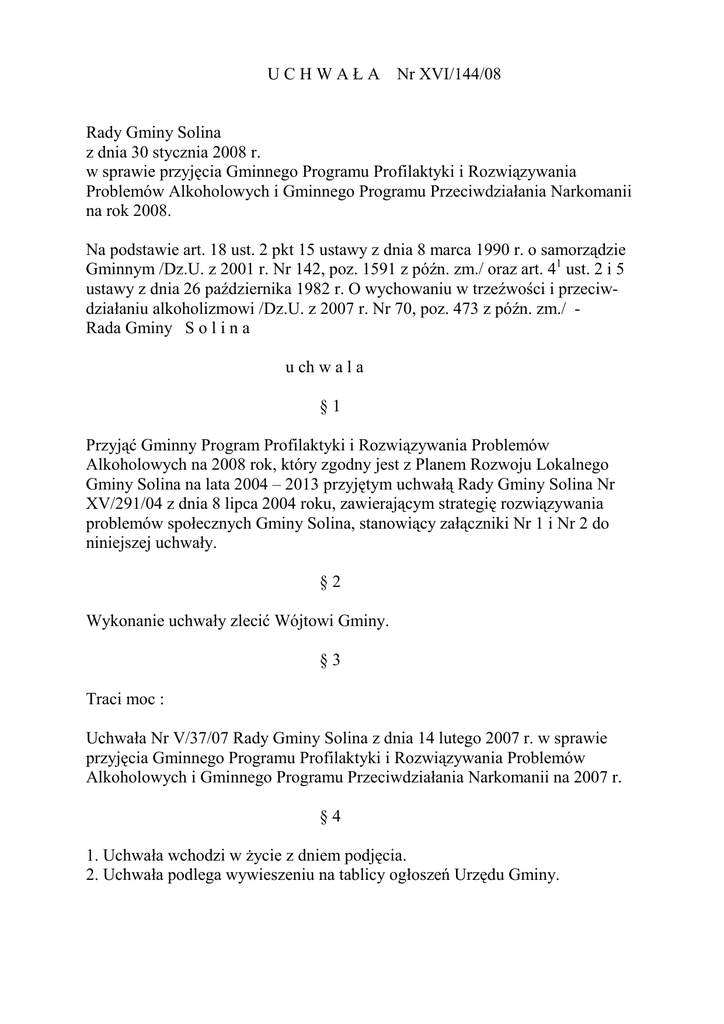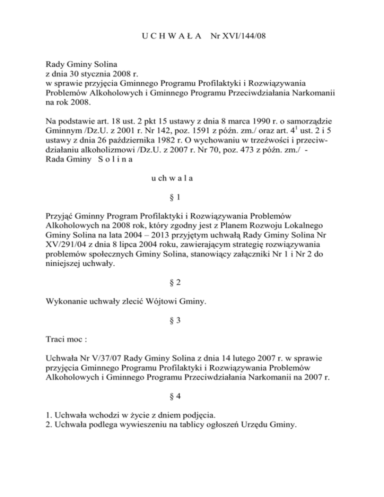U C H W A Ł A Nr XVI/144/08 Rady Gminy Solina z dnia 30 stycznia 2008 r. w sprawie przyjęcia Gminnego Programu Profilaktyki i Rozwiązywania Problemów Alkoholowych i Gminnego Programu Przeciwdziałania Narkomanii na rok 2008. Na podstawie art. 18 ust. 2 pkt 15 ustawy z dnia 8 marca 1990 r. o samorządzie Gminnym /Dz.U. z 2001 r. Nr 142, poz. 1591 z późn. zm./ oraz art. 41 ust. 2 i 5 ustawy z dnia 26 października 1982 r. O wychowaniu w trzeźwości i przeciwdziałaniu alkoholizmowi /Dz.U. z 2007 r. Nr 70, poz. 473 z późn. zm./ Rada Gminy S o l i n a u ch w a l a §1 Przyjąć Gminny Program Profilaktyki i Rozwiązywania Problemów Alkoholowych na 2008 rok, który zgodny jest z Planem Rozwoju Lokalnego Gminy Solina na lata 2004 – 2013 przyjętym uchwałą Rady Gminy Solina Nr XV/291/04 z dnia 8 lipca 2004 roku, zawierającym strategię rozwiązywania problemów społecznych Gminy Solina, stanowiący załączniki Nr 1 i Nr 2 do niniejszej uchwały. §2 Wykonanie uchwały zlecić Wójtowi Gminy. §3 Traci moc : Uchwała Nr V/37/07 Rady Gminy Solina z dnia 14 lutego 2007 r. w sprawie przyjęcia Gminnego Programu Profilaktyki i Rozwiązywania Problemów Alkoholowych i Gminnego Programu Przeciwdziałania Narkomanii na 2007 r. §4 1. Uchwała wchodzi w Ŝycie z dniem podjęcia. 2. Uchwała podlega wywieszeniu na tablicy ogłoszeń Urzędu Gminy. 1 Załącznik Nr 1 do uchwały nr XVI/144/08 Rady Gminy Solina z dnia 30 stycznia 2008 r. PROGRAM PROFILAKTYKI I ROZWIĄZYWANIA PROBLEMÓW ALKOHOLOWYCH NA 2008 ROK Program Profilaktyki i Rozwiązywania Problemów Alkoholowych ma na celu prowadzenie działań profilaktyczno- leczniczych zmierzających do poprawy zdrowia publicznego społeczności Gminy Solina oraz kształtowania właściwej polityki wobec alkoholu. Jeziora Myczkowieckie i Solińskie utworzone przez zapory wodne stanowią na terenie Gminy Solina główną atrakcję turystyczną. Miejscowości Myczkowce, Bóbrka, Solina, Polańczyk, Wołkowyja, Bukowiec, Werlas i Zawóz połoŜone nad ich brzegami stały się popularnymi ośrodkami turystycznymi w kraju i za granicą. Na tą popularność wpływają walory krajobrazowe terenu, łączące piękne akweny z malowniczymi pasmami górskimi. Rozbudowana nad ich brzegami baza sanatoryjno- wypoczynkowa, ośrodki campingowe, pola namiotowe i znajdujące się w ich pobliŜu gospodarstwa agroturystyczne oraz przystanie wodne i kąpieliska sprzyjają rozwojowi róŜnych form turystyki i wypoczynku, ale równieŜ powstawaniu coraz bogatszej bazy handlowo-gastronomicznej działającej nie tylko w letnim sezonie turystycznym na terenie Gminy Solina. Ludność stała Gminy Solina liczy 5350 mieszkańców, a w letnim sezonie turystycznym w m-cach lipiec i sierpień wzrasta o 6500 stałych i 4000 sezonowych miejsc noclegowych. 1. Na terenie Gminy Solina są 3 Niepubliczne Ośr. Zdrowia /Wołkowyja, Polańczyk i Solina/, w których lekarze rodzinni prowadzą praktykę lekarską, Komisariat Policji w Polańczyku , a w letnim sezonie dodatkowo działa Sezonowy Posterunek w Solinie, są 3 Zespoły Szkół (podstawowa i gimnazjum) w m-ciach : Wołkowyja, Myczków i Bóbrka 3 szkoły podstawowe w m-ciach : Zawóz, Berezka i w Myczkowcach, Punkt Filialny w Bukowcu, do których uczęszcza łącznie 670 uczniów. Na terenie Gminy Solina działają 53 placówki handlowe, 36 zakładów i barów gastronomicznych oraz 34 punktów gastronomicznych szybkiej obsługi. W 16 miejscowościach Gminy sprzedaŜ napojów alkoholowych prowadzi 119 punktów, w tym 30 placówek handlowych i 90 kawiarni, zakładów i barów gastronomicznych. Limit zezwoleń ustalony przez Radę Gminy Solina na sprzedaŜ napojów alkoholowych powyŜej 4,5% zawartości alkoholu(wódka, wino) do spoŜycia poza miejscem sprzedaŜy w sklepach wynosi 27 punktów oraz limit zezwoleń na sprzedaŜ 2 i podawanie napojów alkoholowych powyŜej 4,5% zawartości alkoholu (wino , wódka) w gastronomii Rada Gminy Solina ustaliła na 65 punktów . Na terenie Gminy, szczególnie w miejscowościach : Myczkowce, Solina, Polańczyk i Wołkowyja zwłaszcza w letnim sezonie turystycznym występuje nasilenie zjawisk zakłócania spokoju i porządku publicznego związanych, między innymi, równieŜ ze sprzedaŜą, podawaniem i konsumpcją alkoholu. Poza letnim sezonem najczęściej tego typu wykroczenia, w coraz mniejszym nasileniu, występują w m-ci Polańczyk, bowiem ta miejscowość powoli staje się zaląŜkiem infrastruktury miejskiej (siedziba Urzędu i jednostek pomocniczych, ośrodki sanatoryjno- wypoczynkowe, bloki mieszkalne, bogata baza handlowogastronomiczna i kulturalno-rozrywkowa). Zadanie 1 Zwiększanie dostępności pomocy terapeutycznej i rehabilitacyjnej dla osób uzaleŜnionych od alkoholu. 1.1. Zapewnienie kaŜdemu pacjentowi i jego rodzinie moŜliwości bezpłatnego korzystania z usług Ośrodka Profilaktyki i Terapii UzaleŜnień oraz usług Poradni Odwykowej w Lesku zajmujących się diagnozą i terapią problemów uzaleŜnienia i współuzaleŜnienia, 1.2. Podjęcie starań o utworzenie i naleŜyte funkcjonowanie Punktu Konsultacyjnego dla osób z problemami alkoholowymi na bazie GOPS Polańczyk lub Niepubl. Ośrodka Zdrowia, który byłby otwarty minimum 2 razy w tygodniu (czwartek, piątek w godzinach 1400 do 1600 ). DyŜur pełnić moŜe np. pracownik GOPS, lekarz lub pedagog, 1.3. Uruchomienie i naleŜyte funkcjonowanie na terenie Gminy Solina w m-ci Polańczyk Telefonu Zaufania dla ofiar przemocy w rodzinie (GOPS, Komisariat Policji lub Niepubl. Ośr. Zdrowia), 1.4. Stała współpraca z Poradnią Leczenia UzaleŜnień oraz Poradnią Odwykową w Lesku. Wydatki dotyczyć będą otworzenia i naleŜytego funkcjonowania Punktu Konsultacyjnego, to jest opłacanie dyŜurów 2 razy w tygodniu w godzinach popołudniowych, uruchomienie i funkcjonowanie Telefonu Zaufania dla ofiar przemocy w rodzinie, to jest zapłaty za pełnienie dyŜurów przez specjalistów: lekarz, psycholog terapeuta, pe