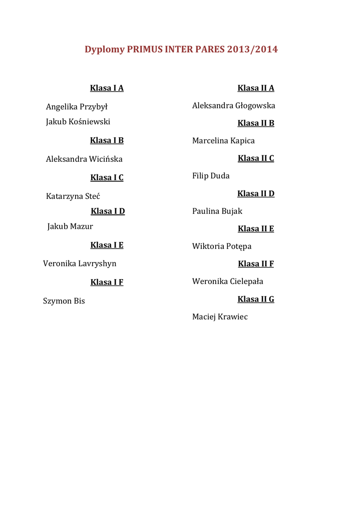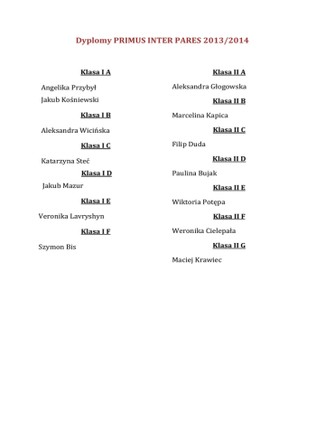 Dyplomy PRIMUS INTER PARES 2013/2014 Klasa II A Klasa I A Angelika Przybył Aleksandra Głogowska Jakub Kośniewski Klasa I B Klasa II B Marcelina Kapica Klasa II C Aleksandra Wicińska Klasa I C Katarzyna Steć Klasa I D Jakub Mazur Klasa I E Veronika Lavryshyn Klasa I F Szymon Bis Filip Duda Klasa II D Paulina Bujak Klasa II E Wiktoria Potępa Klasa II F Weronika Cielepała Klasa II G Maciej Krawiec