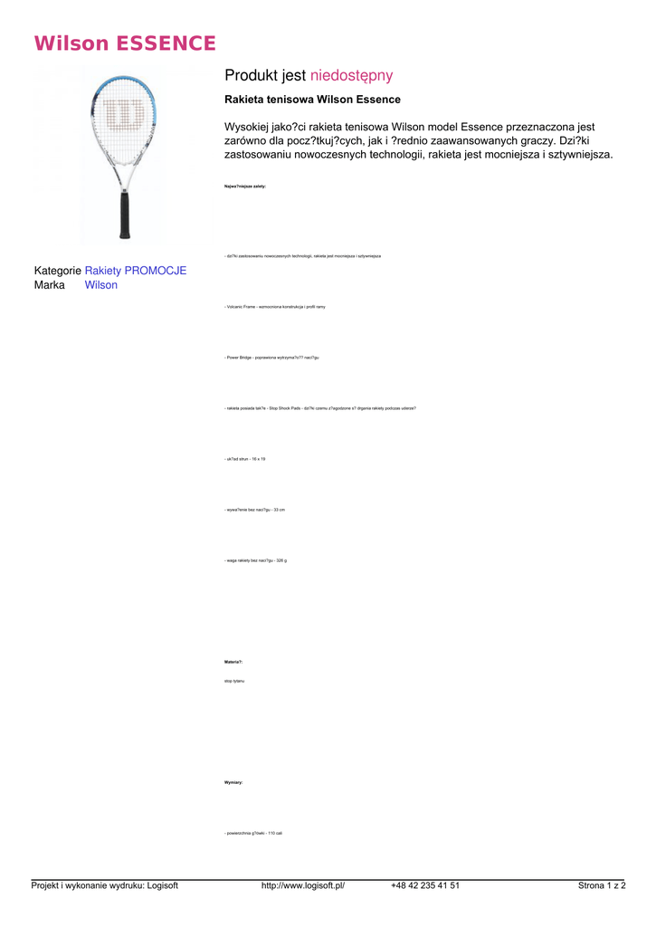 Wilson ESSENCE Produkt jest niedostępny Rakieta tenisowa Wilson Essence Wysokiej jako?ci rakieta tenisowa Wilson model Essence przeznaczona jest zarówno dla pocz?tkuj?cych, jak i ?rednio zaawansowanych graczy. Dzi?ki zastosowaniu nowoczesnych technologii, rakieta jest mocniejsza i sztywniejsza. Najwa?niejsze zalety: - dzi?ki zastosowaniu nowoczesnych technologii, rakieta jest mocniejsza i sztywniejsza Kategorie Rakiety PROMOCJE Marka Wilson - Volcanic Frame - wzmocniona konstrukcja i profil ramy - Power Bridge - poprawiona wytrzyma?o?? naci?gu - rakieta posiada tak?e - Stop Shock Pads - dzi?ki czemu z?agodzone s? drgania rakiety podczas uderze? - uk?ad strun - 16 x 19 - wywa?enie bez naci?gu - 33 cm - waga rakiety bez naci?gu - 326 g Materia?: stop tytanu Wymiary: - powierzchnia g?ówki - 110 cali Projekt i wykonanie wydruku: Logisoft - d?ugo?? rakiety - 27 cali (68,5 cm) http://www.logisoft.pl/ +48 42 235 41 51 Strona 1 z 2 Wersja produktu Projekt i wykonanie wydruku: Logisoft Powered by TCPDF (www.tcpdf.org) Cena http://www.logisoft.pl/ +48 42 235 41 51 Strona 2 z 2