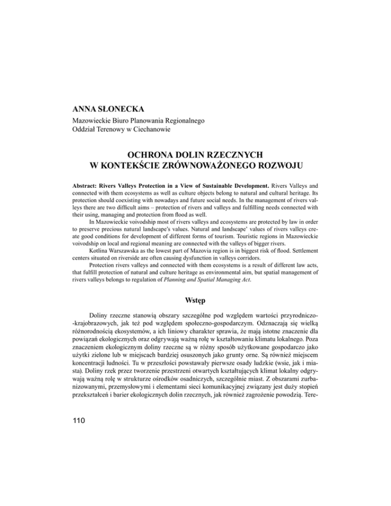 ANNA SŁONECKA Mazowieckie Biuro Planowania Regionalnego Oddział Terenowy w Ciechanowie OCHRONA DOLIN RZECZNYCH W KONTEKŚCIE ZRÓWNOWAŻONEGO ROZWOJU Abstract: Rivers Valleys Protection in a View of Sustainable Development. Rivers Valleys and connected with them ecosystems as well as culture objects belong to natural and cultural heritage. Its protection should coexisting with nowadays and future social needs. In the management of rivers valleys there are two difficult aims – protection of rivers and valleys and fulfilling needs connected with their using, managing and protection from flood as well. In Mazowieckie voivodship most of rivers valleys and ecosystems are protected by law in order to preserve precious natural landscape’s values. Natural and landscape’ values of rivers valleys create good conditions for development of different forms of tourism. Touristic regions in Mazowieckie voivodship on local and regional meaning are connected with the valleys of bigger rivers. Kotlina Warszawska as the lowest part of Mazovia region is in biggest risk of flood. Settlement centers situated on riverside are often causing dysfunction in valleys corridors. Protection rivers valleys and connected with them ecosystems is a result of different law acts, that fulfill protection of natural and culture heritage as environmental aim, but spatial management of rivers valleys belongs to regulation of Planning and Spatial Managing Act. Wstęp Doliny rzeczne stanowią obszary szczególne pod względem wartości przyrodniczo-krajobrazowych, jak też pod względem społeczno-gospodarczym. Odznaczają się wielką różnorodnością ekosystemów, a ich liniowy charakter sprawia, że mają istotne znaczenie dla powiązań ekologicznych oraz odgrywają ważną rolę w kształtowaniu klimatu lokalnego. Poza znaczeniem ekologicznym doliny rzeczne są w różny sposób użytkowane gospodarczo jako użytki zielone lub w miejscach bardziej osuszonych jako grunty orne. Są również miejscem koncentracji ludności. Tu w przeszłości powstawały pierwsze osady ludzkie (wsie, jak i miasta). Doliny rzek przez tworzenie przestrzeni otwartych kształtujących klimat lokalny odgrywają ważną rolę w strukturze ośrodków osadniczych, szczególnie miast. Z obszarami zurbanizowanymi, przemysłowymi i elementami sieci komunikacyjnej związany jest duży stopień przekształceń i barier ekologicznych dolin rzecznych, jak również zagrożenie powodzią. Tere- 110 ny narażone na niebezpieczeństwo powodzi (głównie doliny rzek) są obszarami problemowymi ze względu na kolizję funkcji między ochroną przeciwpowodziową, ochroną środowiska przyrodniczego i zagospodarowaniem przestrzennym. 1. Walory przyrodnicze dolin rzecznych w woj. mazowieckim Cały obszar woj. mazowieckiego położony jest w dorzeczu Wisły Środkowej. Na Mazowszu Wisła przepływa na odcinku długości ok. 330 km, i zajmuje 21,1% powierzchni dorzecza w granicach kraju. Na przeważającej długości Wisła ma charakter rzeki naturalnej – płynie szerokim, nieuregulowanym korytem o zmiennej szerokości od 340 m na terenie Warszawy (sztuczne przewężenie) do ok. 1 km. Jest to jedna z ostatnich dużych rzek europejskich, która nie została jeszcze w całości uregulowana i ma wciąż wiele naturalnego piękna. Charakteryzuje się znaczną asymetrią dorzecza, z przewagą dopływów prawych. Dla obszaru woj. mazowieckiego Wisła jest rzeką tranzytową, stanowi najważniejsze źródło poboru wody i jednocześnie jest głównym odbiornikiem ścieków. Do najważniejszych jej dopływów należą: Iłżanka, Radomka, Okrzejka, Wilga, Pilica, Świder, Jeziorka, Narew, Mołtawa, Skrwa Prawa i Skrwa Lewa. Ponadto, sieć hydrograficzną województwa uzupełniają cieki wodne o mniejszych przepływach, a niektóre z nich okresowo w sezonie letnim wysychają. Sieć rzeczna tworzy układ koncentryczny z centrum w Niecce Warszawskiej i odpływem w kierunku północno-zachodnim, wykorzystującym częściowo systemy odwodnienia pradolin: warszawsko-berlińskiej i toruńsko-eberswaldzkiej. Doliny rzek z cennymi walorami przyrodniczymi, jako korytarze ekologiczne stanowią podstawowe powiązania przyrodnicze regionu i kraju. Według krajowej sieci ekologicznej ECONET wyróżnione obszary węzłowe i korytarze ekologiczne o znaczeniu międzynarodowym w woj. mazowieckim związane są z głównymi rzekami regionu: Wisłą, Bugiem, Narwią, Pilicą. W sieci ECONET znaczenie krajowe mają m.in. korytarze ekologiczne powiązane z rzekami: Skrwa, Bzura, Wkra, Pilica, Świder, Liwiec. Doliny rzeczne i związane z nimi ekosystemy o cennych wartościach przyrodniczych i krajobrazowych zajmują szczególne miejsce w systemie obszarów chronionych Mazowsza. Do obszarów chronionych związanych z dolinami należą: Kampinoski Park Narodowy, liczne rezerwaty przyrody, parki krajobrazowe, (Nadbużański, Mazowiecki, Kozienicki, Chojnowski, Brudzeński położone w całości w granicach woj. mazowieckiego oraz Gostynińsko-Włocławski Park Krajobrazowy, Podlaski Przełom Bugu i Bolimowski Park Krajobrazowy – położone częściowo w granicach województwa), obszary chronionego krajobrazu, a także obszary europejskiej sieci ekologicznej NATURA 2000. Konieczność respektowania ustanowionych aktów prawnych (rozporządzeń, planów ochrony) określających cele ochrony, w tym dotyczących ekosystemów wodnych, jak i dopuszczalnych sposobów użytkowania tych terenów służy wdrażaniu idei zrównoważonego rozwoju. Stopień ochrony rzek w przybliżony sposób można określić na podstawie analizy materiałów kartograficznych, w odniesieniu do odcinków długości rzek na Mazowszu objętych różnymi formami ochrony przyrody. Wyniki analizy wskazują, że wiele rzek płynących przez 111 obszar województwa w całości jest chronionych. Są to Pilica, Bug, Omulew, Liwiec, Wkra, Mławka, Jeziorka, Skrwa Prawa. W ponad 90% długości chronione są rzeki Narew, Wisła