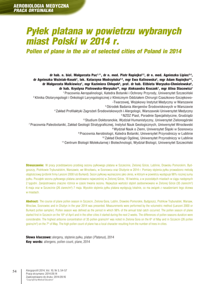 Aerobiologia medyczna PRACA ORYGINALNA Pyłek platana w powietrzu wybranych miast Polski w 2014 r. Pollen of plane in the air of selected cities of Poland in 2014 dr hab. n. biol. Małgorzata Puc1,11, dr n. med. Piotr Rapiejko2,3, dr n. med. Agnieszka Lipiec3,4, dr Agnieszka Woźniak-Kosek3, lek. Katarzyna Modrzyńska3,5, mgr Ewa Kalinowska3, mgr Adam Rapiejko3,6, dr Małgorzata Malkiewicz7, mgr Kazimiera Chłopek8, prof. dr hab. Elżbieta Weryszko-Chmielewska9, dr hab. Krystyna Piotrowska-Weryszko10, mgr Aleksandra Kruczek1, mgr Alina Stacewicz1 1 Pracownia Aeropalinologii, Katedra Botaniki i Ochrony Przyrody, Uniwersytet Szczeciński 2 Klinika Otolaryngologii i Onkologii Laryngologicznej z Klinicznym Oddziałem Chirurgii Czaszkowo-Szczękowo-Twarzowej, Wojskowy Instytut Medyczny w Warszawie 3 Ośrodek Badania Alergenów Środowiskowych w Warszawie 4 Zakład Profilaktyki Zagrożeń Środowiskowych i Alergologii, Warszawski Uniwersytet Medyczny 5 NZOZ Piast, Poradnie Specjalistyczne, Grudziądz 6 Studium Doktoranckie, Wydział Humanistyczny, Uniwersytet Zielonogórski 7 Pracownia Paleobotaniki, Zakład Geologii Stratygraficznej, Instytut Nauk Geologicznych, Uniwersytet Wrocławski 8 Wydział Nauk o Ziemi, Uniwersytet Śląski w Sosnowcu 9 Pracownia Aerobiologii, Katedra Botaniki, Uniwersytet Przyrodniczy w Lublinie 10 Zakład Ekologii Ogólnej, Uniwersytet Przyrodniczy w Lublinie 11 Centrum Biologii Molekularnej i Biotechnologii, Wydział Biologii, Uniwersytet Szczeciński Streszczenie: W pracy przedstawiono przebieg sezonu pyłkowego platana w Szczecinie, Zielonej Górze, Lublinie, Drawsku Pomorskim, Bydgoszczy, Piotrkowie Trybunalskim, Warszawie, we Wrocławiu, w Sosnowcu oraz Olsztynie w 2014 r. Pomiary stężenia pyłku prowadzono metodą objętościową (próbnik firmy Lanzoni 2000 lub Burkard). Sezon pyłkowy wyznaczono jako okres, w którym w powietrzu występuje 98% rocznej sumy pyłku. Początek sezonu pyłkowego platana zanotowano najwcześniej w Zielonej Górze, 18 kwietnia, a w pozostałych miastach w ciągu następnych 2 tygodni. Zarejestrowano znaczne różnice w czasie trwania sezonu. Najwyższe wartości stężeń zaobserwowano w Zielonej Górze (35 ziaren/m3) 6 maja oraz w Szczecinie (26 ziaren/m3) 7 maja. Wysokie stężenia pyłku platana występują lokalnie, co ma związek z nasadzeniami tego drzewa w miastach. Abstract: The course of plane pollen season in Szczecin, Zielona Gora, Lublin, Drawsko Pomorskie, Bydgoszcz, Piotrkow Trybunalski, Warsaw, Wroclaw, Sosnowiec and in Olsztyn in the year 2014 was presented. Measurements were performed by the volumetric method (Lanzoni 2000 or Burkard pollen sampler). Pollen season was defined as the period in which 98% of the annual total catch occurred. The pollen season of plane started first in Szczecin on the 18th of April and in the other cities it started during the next 2 weeks. The differences of pollen seasons duration were considerable. The highest airborne concentration of 35 pollen grains/m3 was noted in Zielona Gora on the 6th of May and in Szczecin (26 pollen grains/m3) on the 7th of May. The high pollen count of plane has a local character resulting from the number of trees in cities. Słowa kluczowe: alergeny, stężenie pyłku, platan (Platanus), 2014 Key words: allergens, pollen count, plane, 2014 54 Alergoprofil 2014, Vol. 10, Nr 3, 54-57 Pracę otrzymano: 2014.09.14 Zaakceptowano do druku: 2014.09.16 “Copyright by Medical Education” Aerobiologia medyczna PRACA ORYGINALNA W Europie platany często sadzone są w miastach, ponieważ dobrze znoszą zanieczyszczenia powietrza, zarówno będące wynikiem uprzemysłowienia, jak i pochodzące z procesów spalania. Licznie występują w parkach, a także wzdłuż ulic i alei. Platan klonolistny należy do grupy drzew najbardziej odpornych na niesprzyjające warunki środowiska [1]. W miastach, gdzie platan stanowi znaczny udział w drzewostanie, należy zwracać uwagę na ten takson pod kątem zagrożenia alergenami pyłkowymi. Platanus L. (platan) to jedyny rodzaj rodziny platanowych, liczący ok. 10 bardzo podobnych gatunków, występujących w Ameryce Północnej i Środkowej, a także na obszarze śródziemnomorskim i w południowo-wschodniej Azji [2]. W Polsce platan rośnie głównie na zachodzie kraju. W klimacie umiarkowanym alergeny pyłku tego drzewa rzadko są przyczyną schorzeń alergicznych, natomiast we wschodniej części obszaru śródziemnomorskiego wykazują średnią i wysoką alergenność. Reakcje krzyżowe notowane są głównie pomiędzy alergenami pyłku platanu i brzozy, a także olszy, leszczyny, grabu, dębu, buka, kasztanowca, a nawet, choć rzadko, pyłku traw [3, 4]. wa Trybunalskiego, Warszawy, Wrocławia, Sosnowca oraz Olsztyna. Badania przeprowadzono metodą wolumetryczną (aparat Lanzoni VSPP 2000 lub aparat Burkard). Długość sezonów pyłkowych wyznaczono metodą 98%, przy której za początek i koniec sezonu uznaje się dni, dla których skumulowana liczba ziaren pyłku stanowi odpowiednio 1% i 99% sumy rocznej [5]. Obliczono średnie dobowe stężenia wyrażone liczbą ziaren pyłku w 1 m3 powietrza (z/m3) oraz sumy roczne tych stężeń dla każdego taksonu, tj. sezonowy indeks pylenia (SPI). Wyniki i ich omówienie Sezon pyłkowy platana charakteryzuje się dość zwartym przebiegiem. Pierwsze ziarna pyłku obserwowano w powietrzu Zielonej Góry już 18 kwietnia, a ostatnie w Szczecinie – 20 maja. Najdłuższy, trwający 26 dni sezon pyłkowy zarejestrowano również w Zielonej Górze, natomiast najkrótszy – w Lublinie (9 dni). Zagrożenie alergenami pyłku tego taksonu było w 2014 r. bardzo niskie we wszystkich punktach pomiarowych. Rozkład koncentracji pyłku platana (tab. 1, ryc. 1–3) wskazuje na dosyć równomierne utrzymywanie się pyłku w powietrzu w ciągu sezonu. Jest to najprawdopodobniej spowodowane przewagą jednego gatunku – platana klonolistnego – w nasadzeniach tego drzewa w większości miast w