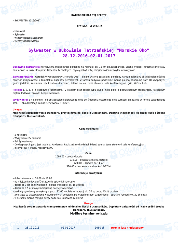 KATEGORIE DLA TEJ OFERTY ● SYLWESTER 2016/2017 TYPY DLA TEJ OFERTY ● ● ● ● karnawał Sylwester wczasy dojazd autokarem wczasy dojazd własny Sylwester w Bukowinie Tatrzańskiej "Morskie Oko" 28.12.2016-02.01.2017 Bukowina Tatrzańska: turystyczna miejscowość położona na Podhalu, ok. 15 km od Zakopanego. Liczne wyciągi i urozmaicone trasy narciarskie, a także Kompleks Basenów Termalnych, czynią pobyt w tej miejscowości niezwykle atrakcyjnym. Zakwaterowanie: Ośrodek Wypoczynkowy „Morskie Oko” – obiekt w stylu góralskim, położony na wzniesieniu w bliskiej odległości od centrum miejscowości i Kompleksu Basenów Termalnych. Z tarasu budynku podziwiać można piękną panoramę Tatr. Do dyspozycji gości: jadalnia, kawiarnia, kącik zabaw dla dzieci, bilard, sauna, tenis stołowy, sala konferencyjna, grill, WiFi w holu. Pokoje: 1, 2, 3, 4 i 5-osobowe z łazienkami, TV i radiem oraz pokoje typu studio. Kilka pokoi o podwyższonym standardzie. Na każdym piętrze lodówki i czajniki bezprzewodowe. Wyżywanie: 2 x dziennie - od obiadokolacji pierwszego dnia do śniadania ostatniego dnia turnusu, śniadania w formie szwedzkiego stołu + obiadokolacja (obiad serwowany + bufet), Uwaga: Możliwość zorganizowania transportu przy minimalnej ilości 8 uczestników. Dopłata w zależności od liczby osób i środka transportu (bus/autokar). Cena obejmuje: ● ● ● ● ● 5 noclegów Wyżywienie 2x dziennie Bal Sylwestrowy Do dyspozycji gości jest jadalnia, kawiarnia, kącik zabaw dla dzieci, bilard, sauna, tenis stołowy i sala konferencyjna. Internet Wi-fi w holu recepcyjnym. Cena: 1060,00 – osoba dorosła 910,00 – dostawka dla os. dorosłej 600,00 – dziecko do 14 lat 370,00 – dostawka dla dziecka 14-17 lat Informacje praktyczne: ● ● ● ● ● ● ● doba hotelowa od 16.00 do 10.00 na miejscu konieczność uiszczenia opłaty klimatycznej dzieci do 3 lat bez świadczeń - opłata w recepcji ok. 15 zł/doba dzieci do 17 lat mają zmniejszoną porcję żywieniową parking ogrodzony zamykany o godz. 22.00 - opłata w recepcji ok. 10 zł/ doba, 45 zł/ tydzień zwierzęta są akceptowane w wydzielonych pokojach, po wcześniejszym uzgodnieniu - opłata w recepcji ok. 20 zł/ doba w ośrodku można zakupić bilety do termy Bukowina ze zniżką Uwaga: Możliwość zorganizowania transportu przy minimalnej ilości 8 uczestników. Dopłata w zależności od liczby osób i środka transportu (bus/autokar). Możliwe terminy wyjazdu Lp. 1. Data początku Data końca Cena 28-12-2016 02-01-2017 1060 zł Wolne miejsca termin jest niedostępny Możliwe miejsca wyjazdu Lp. 1. Miasto Adres Katowice do potwierdzenia Dopłata Wyjazd +0 zł 00:00