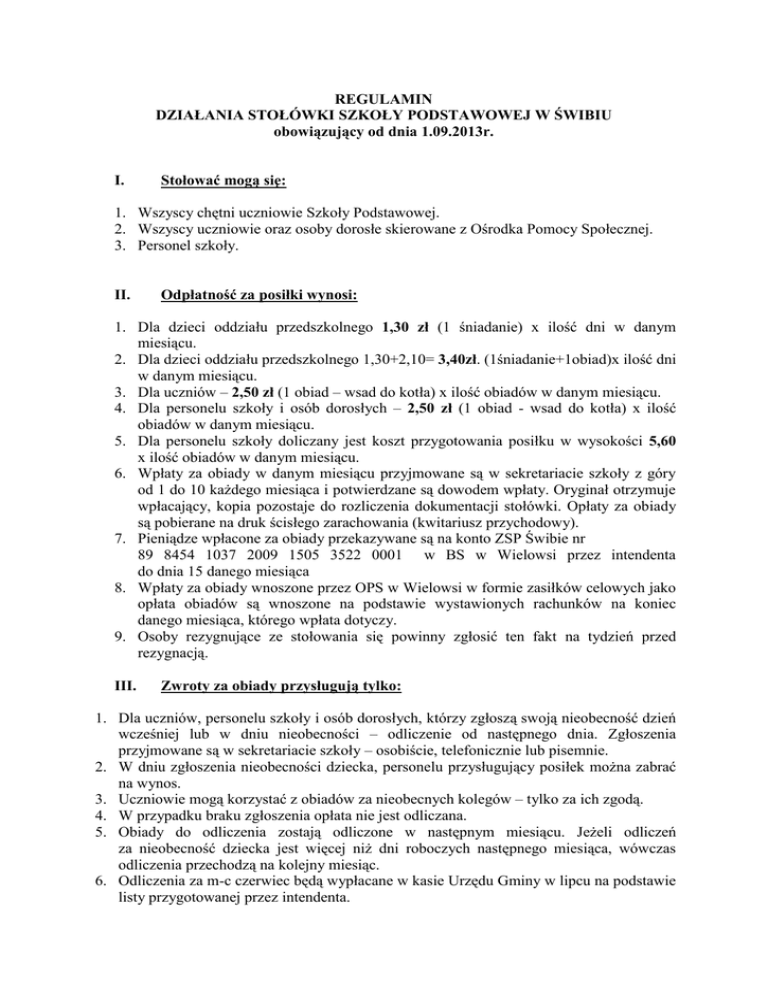 REGULAMIN DZIAŁANIA STOŁÓWKI SZKOŁY PODSTAWOWEJ W ŚWIBIU obowiązujący od dnia 1.09.2013r. I. Stołować mogą się: 1. Wszyscy chętni uczniowie Szkoły Podstawowej. 2. Wszyscy uczniowie oraz osoby dorosłe skierowane z Ośrodka Pomocy Społecznej. 3. Personel szkoły. II. Odpłatność za posiłki wynosi: 1. Dla dzieci oddziału przedszkolnego 1,30 zł (1 śniadanie) x ilość dni w danym miesiącu. 2. Dla dzieci oddziału przedszkolnego 1,30+2,10= 3,40zł. (1śniadanie+1obiad)x ilość dni w danym miesiącu. 3. Dla uczniów – 2,50 zł (1 obiad – wsad do kotła) x ilość obiadów w danym miesiącu. 4. Dla personelu szkoły i osób dorosłych – 2,50 zł (1 obiad - wsad do kotła) x ilość obiadów w danym miesiącu. 5. Dla personelu szkoły doliczany jest koszt przygotowania posiłku w wysokości 5,60 x ilość obiadów w danym miesiącu. 6. Wpłaty za obiady w danym miesiącu przyjmowane są w sekretariacie szkoły z góry od 1 do 10 każdego miesiąca i potwierdzane są dowodem wpłaty. Oryginał otrzymuje wpłacający, kopia pozostaje do rozliczenia dokumentacji stołówki. Opłaty za obiady są pobierane na druk ścisłego zarachowania (kwitariusz przychodowy). 7. Pieniądze wpłacone za obiady przekazywane są na konto ZSP Świbie nr 89 8454 1037 2009 1505 3522 0001 w BS w Wielowsi przez intendenta do dnia 15 danego miesiąca 8. Wpłaty za obiady wnoszone przez OPS w Wielowsi w formie zasiłków celowych jako opłata obiadów są wnoszone na podstawie wystawionych rachunków na koniec danego miesiąca, którego wpłata dotyczy. 9. Osoby rezygnujące ze stołowania się powinny zgłosić ten fakt na tydzień przed rezygnacją. III. Zwroty za obiady przysługują tylko: 1. Dla uczniów, personelu szkoły i osób dorosłych, którzy zgłoszą swoją nieobecność dzień wcześniej lub w dniu nieobecności – odliczenie od następnego dnia. Zgłoszenia przyjmowane są w sekretariacie szkoły – osobiście, telefonicznie lub pisemnie. 2. W dniu zgłoszenia nieobecności dziecka, personelu przysługujący posiłek można zabrać na wynos. 3. Uczniowie mogą korzystać z obiadów za nieobecnych kolegów – tylko za ich zgodą. 4. W przypadku braku zgłoszenia opłata nie jest odliczana. 5. Obiady do odliczenia zostają odliczone w następnym miesiącu. Jeżeli odliczeń za nieobecność dziecka jest więcej niż dni roboczych następnego miesiąca, wówczas odliczenia przechodzą na kolejny miesiąc. 6. Odliczenia za m-c czerwiec będą wypłacane w kasie Urzędu Gminy w lipcu na podstawie listy przygotowanej przez intendenta. 7. Uczniowie lub osoby dorosłe korzystający z posiłków refundowanych przez OPS które zgłosiły dni do odliczenia w m-cu XII danego roku a posiłki nie są przyznane od m-c Stycznia następnego roku kalendarzowego (brak decyzji OPS) zwrot za niewykorzystane obiady w/w osób zostaje przekazany na konto OPS. 8. Zobowiązuje się rodziców dzieci korzystających z obiadów płaconych z OPS także o zgłaszanie nieobecności dziecka – celem odliczenia. IV. Uczniów stołujących się w stołówce zobowiązuje się do: Zachowania środków BHP i ostrożności przy wydawaniu gorących posiłków. Zajmowania wyznaczonych miejsc w świetlicy szkolnej. Kulturalnego zachowania się w czasie spożywania posiłków oraz zachowania ciszy. W czasie wydawania obiadów do świetlicy wchodzą tylko uczniowie korzystający z posiłków, zabrania się przebywania na terenie stołówki osobom nie korzystającym z posiłków. 5. Po spożyciu do odniesienia brudnych naczyń na wyznaczone miejsce ,,Zwrot naczyń”. 1. 2. 3. 4. Regulamin wchodzi z dniem 1.09.2013r.