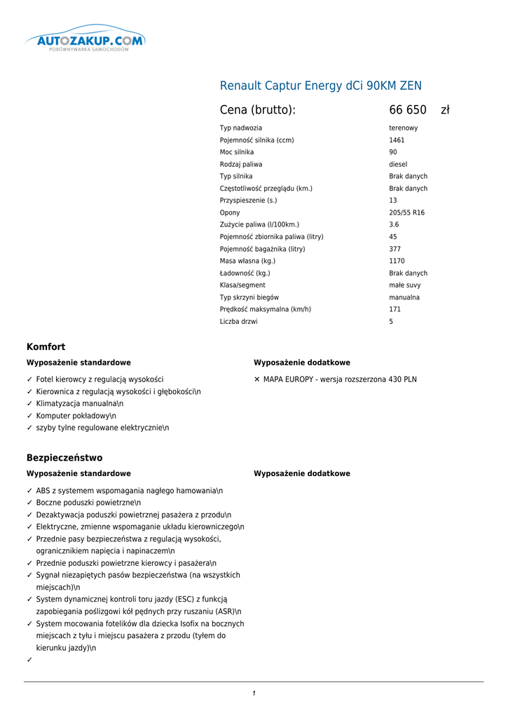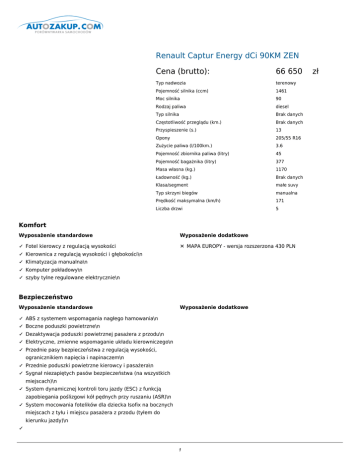Renault Captur Energy dCi 90KM ZEN Cena (brutto): 66 650 Typ nadwozia terenowy Pojemność silnika (ccm) 1461 Moc silnika 90 Rodzaj paliwa diesel Typ silnika Brak danych Częstotliwość przeglądu (km.) Brak danych Przyspieszenie (s.) 13 Opony 205/55 R16 Zużycie paliwa (l/100km.) 3.6 Pojemność zbiornika paliwa (litry) 45 Pojemność bagażnika (litry) 377 Masa własna (kg.) 1170 Ładowność (kg.) Brak danych Klasa/segment małe suvy Typ skrzyni biegów manualna Prędkość maksymalna (km/h) 171 Liczba drzwi 5 Komfort Wyposażenie standardowe Wyposażenie dodatkowe ✓ Fotel kierowcy z regulacją wysokości ✕ MAPA EUROPY - wersja rozszerzona 430 PLN ✓ Kierownica z regulacją wysokości i głębokości\n ✓ Klimatyzacja manualna\n ✓ Komputer pokładowy\n ✓ szyby tylne regulowane elektrycznie\n Bezpieczeństwo Wyposażenie standardowe Wyposażenie dodatkowe ✓ ABS z systemem wspomagania nagłego hamowania\n ✓ Boczne poduszki powietrzne\n ✓ Dezaktywacja poduszki powietrznej pasażera z przodu\n ✓ Elektryczne, zmienne wspomaganie układu kierowniczego\n ✓ Przednie pasy bezpieczeństwa z regulacją wysokości, ogranicznikiem napięcia i napinaczem\n ✓ Przednie poduszki powietrzne kierowcy i pasażera\n ✓ Sygnał niezapiętych pasów bezpieczeństwa (na wszystkich miejscach)\n ✓ System dynamicznej kontroli toru jazdy (ESC) z funkcją zapobiegania poślizgowi kół pędnych przy ruszaniu (ASR)\n ✓ System mocowania fotelików dla dziecka Isofix na bocznych miejscach z tyłu i miejscu pasażera z przodu (tyłem do kierunku jazdy)\n ✓ 1 zł System wspomagania ruszania pod górę (Hill Start Assist)\n 2 ✓ Tylne pasy bezpieczeństwa: 3-punktowe, z ogranicznikami napięcia na bocznych miejscach\n ✓ Zagłówki przednie z regulacją wysokości\n Dodatki Wyposażenie standardowe Wyposażenie dodatkowe ✓ Automatyczne włączanie tylnej wycieraczki przy cofaniu ✕ Instalacja do montażu alarmu 300 PLN ✓ Autostradowy tryb pracy kierunkowskazów ✕ Jasna tonacja wnętrza 0 PLN ✓ Boczne listwy ochronne i listwa zderzaka tylnego w kolorze ✕ Koło dojazdowe 310 PLN czarnym o ziarnistej fakturze ✓ Ciemna tonacja wnętrza ✕ Lakier metalizowany 1800 PLN ✓ Dwustronna podłoga bagażnika ✕ Lakier metalizowany specjalny 2000 PLN ✓ Funkcja EKO (tryb ekologicznej jazdy) ✕ lakier niemetalizowany specjalny 850 PLN ✓ Górna listwa ozdobna chłodnicy w kolorze lśniącej czerni z ✕ Lusterka boczne składane elektrycznie, podgrzewane, z chromowanym logo Renault czujnikiem temperatury zewnętrznej 500 PLN ✓ Instalacja do montażu radioodtwarzacza ✕ Mapa Europy - wersja podstawowa (Polska, Czechy, ✓ karta Renault Hands Free ✕ MEDIA NAV: multimedialny system z ekranem dotykowym Słowacja, Węgry,Litwa, Łotwa, Estonia) 0 PLN 7", nawigacją,radioodtwarzaczem 4x20W, Bluetooth® , gniazdem USB i Jack 2000 PLN ✓ Kierownica skórzana ✕ Nadwozie dwukolorowe (obudowy lusterek bocznych w kolorze dachu) 1000 PLN ✓ Lusterka boczne regulowane elektrycznie, podgrzewane, z ✕ Naklejka zewnętrzna z motywem Captur, Losange lub Map czujnikiem temperatury ✓ Nadwozie jednokolorowe 1200 PLN ✕ Obręcze kół ze stopu metali lekkich 17", kolor czarny, pomarańczowy lub kość słoniowa 1800 PLN ✓ Obręcze kół ze stopu metali lekkich 16" ✕ Ozdobne elementy wnętrza w kolorze niebieskim, zielonym, pomarańczowym (elementy w kolorze kości słoniowej w opcji bezpłatnej dla jasnego wnętrza w wersji Zen) 600 PLN ✓ Obudowa lusterek bocznych w kolorze nadwozia ✕ Ozdobny element kierownicy z motywem Captur, Losange lub Map (motyw Map niedostępny dla wersji Intens) 200 PLN ✓ Przednie zewnętrzne klamki drzwi w kolorze nadwozia ✕ Szyby tylne boczne i tylna przyciemniane 300 PLN ✓ Radioodtwarzacz CD, 4x20W, zintegrowany wyświetlacz, ✕ Tapicerka zdejmowana (różne wzory do wyboru) 500 PLN Bluetooth®, gniazdo USB i jack ✓ Regulator - ogranicznik prędkości ✕ Wspomaganie parkowania tyłem (4 czujniki) 1000 PLN ✓ Światła do jazdy dziennej z diodami LED ✕ Zewnętrzne elementy ozdobne w kolorze czarnym, kość słoniowa lub pomarańczowym 800 PLN ✓ Światła przeciwmgłowe (z funkcją doświetlania zakrętów w wersji Intens)\n ✓ System wspomagania ruszania pod górę\n ✓ Szyby przednie regulowane elektrycznie ( włącznik impulsowy po stronie kierowcy od wersji Zen)\n ✓ Tapicerka klasyczna\n ✓ Tapicerka klasyczna (różne wzory do wyboru)\n ✓ Tonacja jasna wnętrza\n ✓ Tylna kanapa przesuwana i dzielona w układzie 1/3-2/3 z 3 zagłówkami z regulacją wysokości\n ✓ 3 Tylne zewnętrzne klamki drzwi ukryte przy tylnym słupku\n 4 ✓ Wskaźnik zmiany biegów\n ✓ Wysuwany schowek w desce rozdzielczej Easy Life o poj. 11 l.\n ✓ Zestaw do naprawy opon\n ✓ Zewnętrzne elementy ozdobne chromowane : ozdobna listwa chłodnicy, obramowanie reflektorów przeciwmgłowych, chromowane wstawki w bocznych listwach ochronnych oraz ozdobna listwa bagażnika z napisem Captur (wyłacznie w wersji Intens)\n Doprecyzowanie oferty ✕ Pakiet LOOK BLACK PLUS - 2100 PLN obręcze kół ze stopu metali lekkich 17" w kolorze czarnym oraz tylne szyby boczne przyciemniane ✕ Pakiet LOOK ORANGE - 2100 PLN obręcze kół ze stopu metali lekkich 17" w kolorze pomarańczowym oraz tylne szyby boczne przyciemniane ✕ Pakiet LOOK IVORY - 2100 PLN obręcze kół ze stopu metali lekkich 17" w kolorze kość słoniowa oraz tylne szyby boczne przyciemniane ✕ Pakiet DESIGN w kolorze pomarańczowym - 700 PLN ozdobne elementy wnętrza i wysuwany schowek w desce rozdzielczej w kolorze pomarańczowym ✕ Pakietr DESIGN w kolorze niebieskim - 700 PLN ozdobne elementy wnętrza i wysuwany schowek w desce rozdzielczej w kolorze niebieskim ✕ Pakiet DESIGN w kolorze zielonym - 700 PLN ozdobne elementy wnętrza i wysuwany schowek w desce rozdzielczej w kolorze zielonym ✕ Pakiet DESIGN z motywem Captur dla wersji Zen - 1400 PLN kierownica z motywem Captur ozdobne eleme