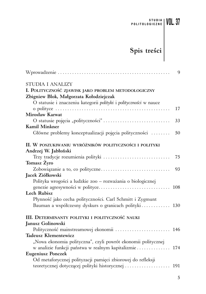 STUDIA POLITOLOGICZNE VOL. 37 Spis treści Wprowadzenie . . . . . . . . . . . . . . . . . . . . . . . . . . . . . . . . . . . . . . . . . . . . . . . 9 STUDIA I ANALIZY I. POLITYCZNOŚĆ ZJAWISK JAKO PROBLEM METODOLOGICZNY Zbigniew Blok, Małgorzata Kołodziejczak O statusie i znaczeniu kategorii polityki i polityczności w nauce o polityce . . . . . . . . . . . . . . . . . . . . . . . . . . . . . . . . . . . . . . . . . . . . . . . . Mirosław Karwat O statusie pojęcia „polityczności” . . . . . . . . . . . . . . . . . . . . . . . . . . . . Kamil Minkner Główne problemy konceptualizacji pojęcia polityczności . . . . . . . . 17 33 50 II. W POSZUKIWANIU WYRÓŻNIKÓW POLITYCZNOŚCI I POLITYKI Andrzej W. Jabłoński Trzy tradycje rozumienia polityki . . . . . . . . . . . . . . . . . . . . . . . . . . . . 75 Tomasz Żyro Zobowiązanie a to, co polityczne . . . . . . . . . . . . . . . . . . . . . . . . . . . . . 93 Jacek Ziółkowski Polityka wrogości a ludzkie zoo – rozważania o biologicznej genezie agresywności w polityce. . . . . . . . . . . . . . . . . . . . . . . . . . . . . . 108 Lech Rubisz Płynność jako cecha polityczności. Carl Schmitt i Zygmunt Bauman a współczesny dyskurs o granicach polityki . . . . . . . . . . . . 130 III. DETERMINANTY POLITYKI I POLITYCZNOŚĆ NAUKI Janusz Golinowski Polityczność mainstreamowej ekonomii . . . . . . . . . . . . . . . . . . . . . . . 146 Tadeusz Klementewicz „Nowa ekonomia polityczna”, czyli powrót ekonomii politycznej w analizie funkcji państwa w realnym kapitalizmie . . . . . . . . . . . . . . 174 Eugeniusz Ponczek Od metaforycznej polityzacji pamięci zbiorowej do refleksji teoretycznej dotyczącej polityki historycznej . . . . . . . . . . . . . . . . . . . 191 5 Andrzej Czajowski Polityczność działań dziennikarza w świetle teorii konfliktu społecznego. . . . . . . . . . . . . . . . . . . . . . . . . . . . . . . . . . . . . . . . . . . . . . . 219 Łukasz Młyńczyk Antypody polityki i apolityczności. Dlaczego oczekiwania polityków oraz społeczeństwa tak bardzo się ze sobą rozmijają?. . . 241 *** Urszula Kurcewicz Historia w służbie polityki? Historiografia Ziem Odzyskanych w pierwszej dekadzie Polski Ludowej . . . . . . . . . . . . . . . . . . . . . . . . . Dominika Kasprowicz, Kamil Marcinkiewicz, Radosław Marzęcki Kapitał wyborczy w polskiej polityce. Analiza ilościowa wyników wyborczych inkumbentów w wyborach parlamentarnych 2005–2011. . . . . . . . . . . . . . . . . . . . . . . . . . . . . . . . . . . . . . . . . . . . . . . . Maciej Potz Czy wybory umożliwiają artykulację preferencji politycznych? . . . . Paweł Matuszewski Techniki redukowania efektu oczekiwań społecznych w pytaniach o frekwencję wyborczą . . . . . . . . . . . . . . . . . . . . . . . . . . . . . . . . . . . . . . Grzegorz Libor Walijski system partyjny – próba typologizacji . . . . . . . . . . . . . . . . . 257 271 293 312 334 Autorzy . . . . . . . . . . . . . . . . . . . . . . . . . . . . . . . . . . . . . . . . . . . . . . . . . . . . . 348 6 SP Vol. 37 STUDIA POLITOLOGICZNE VOL. 36 Contents Introduction . . . . . . . . . . . . . . . . . . . . . . . . . . . . . . . . . . . . . . . . . . . . . . . . . 9 STUDIES AND ANALYSIS I. POLITICALITY OF THE SOCIAL PHENOMENONS AS A METODOLOGICAL PROBLEM Zbigniew Blok, Małgorzata Kołodziejczak The Status and Importance of the Cathegories „Politics” and „Political” in the Political Science . . . . . . . . . . . . . . . . . . . . . . . . Mirosław Karwat On the Status of the Concept „Politicality”. . . . . . . . . . . . . . . . . . . . Kamil Minkner The Principal Problems of Notion’s Conceptualization of the Political . . . . . . . . . . . . . . . . . . . . . . . . . . . . . . . . . . . . . . . . . . . . . . . . . . 17 33 50 II. LOOKING FOR DISTINCTION OF THE POLITICALITY AND POLITICS Andrzej W. Jabłoński Three Traditions of Politics Understanding . . . . . . . . . . . . . . . . . . . . 75 Tomasz Żyro Obligation and the Political . . . . . . . . . . . . . . . . . . . . . . . . . . . . . . . . . 93 Jacek Ziółkowski Politics of Hostility and Human Zoo – Reflections on the Origins of Biological Aggressiveness in Politics. . . . . . . . . . . . . . . . . 108 Lech Rubisz The Liquidity as the Feature of the Political. Carl Schmitt and Zygmunt Bauman and the Contemporary Discourse on the Limit Soft the Politics. . . . . . . . . . . . . . . . . . . . . . . . . . . . . . . . . . . . . . 130 III. DETERMINANTS OF POLITICS AND POLITIZATION OF THE SCIENCE Janusz Golinowski Politicality of the Mainstream Economy. . . . . . . . . . . . . . . . . . . . . . . 146 Tadeusz Klementewicz „New Political Economics” or Return Old Political Economy in Analizing the State-Economy Relations in Contemporary Capitalism . . . . . . . . . . . . . . . . . . . . . . . . . . . . . . . . . . . . . . . . . . . . . . . . . . 174 7 Eugeniusz Ponczek From Metaphorical Politicization of Collective Memory to Theoretical Reflection on Historical Politics . . . . . . . . . . . . . . . . . 191 Andrzej Czajowski The Political Activities of the Journalist in Light of the Theory of Social Conflict . . . . . . . . . . . . . . . . . . . . . . . . . . . . . . . . . . . . . . . . . . 219 Łukasz Młyńczyk Antipodes Policies and Apolitical . . . . . . . . . . . . . . . . . . . . . . . . . . . . 241 *** Urszula Kurcewicz History in the Service of Politics? Historiography of the Recovered Territories in the First Decade of the Polish People’s Republic . . . . . . . . . . . . . . . . . . . . . . . . . . . . . . . . . . . . . . . . . . . . . . . . . Dominika Kasprowicz, Kamil Marcinkiewicz, Radosław Marzęcki Electoral Capital in the Polish Politics. Quantitative analysis of the Incumbents’ Electoral Results (2005–2011). . . . . . . . . . . . . . Maciej Potz Do Elections Enable the Expression of Political Preferences?. . . . . Paweł Matuszewski Techniques for Reducing Social Desirability Bias 