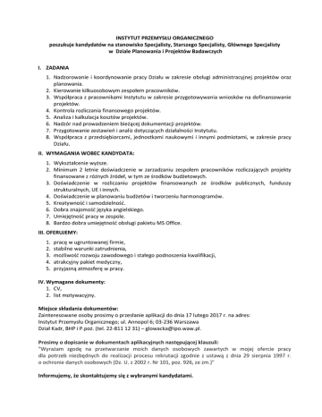 INSTYTUT PRZEMYSŁU ORGANICZNEGO poszukuje kandydatów na stanowisko Specjalisty, Starszego Specjalisty, Głównego Specjalisty w Dziale Planowania i Projektów Badawczych I. ZADANIA 1. Nadzorowanie i koordynowanie pracy Działu w zakresie obsługi administracyjnej projektów oraz planowania. 2. Kierowanie kilkuosobowym zespołem pracowników. 3. Współpraca z pracownikami Instytutu w zakresie przygotowywania wniosków na dofinansowanie projektów. 4. Kontrola rozliczania finansowego projektów. 5. Analiza i kalkulacja kosztów projektów. 6. Nadzór nad prowadzeniem bieżącej dokumentacji projektów. 7. Przygotowanie zestawień i analiz dotyczących działalności Instytutu. 8. Współpraca z przedsiębiorcami, jednostkami naukowymi i innymi podmiotami, w zakresie pracy Działu. II. WYMAGANIA WOBEC KANDYDATA: 1. Wykształcenie wyższe. 2. Minimum 2 letnie doświadczenie w zarzadzaniu zespołem pracowników rozliczających projekty finansowane z różnych źródeł, w tym ze środków budżetowych. 3. Doświadczenie w rozliczaniu projektów finansowanych ze środków publicznych, funduszy strukturalnych, UE i innych. 4. Doświadczenie w planowaniu budżetów i tworzeniu harmonogramów. 5. Kreatywność i samodzielność. 6. Dobra znajomość języka angielskiego. 7. Umiejętność pracy w zespole. 8. Bardzo dobra umiejętność obsługi pakietu MS Office. III. OFERUJEMY: 1. 2. 3. 4. 5. pracę w ugruntowanej firmie, stabilne warunki zatrudnienia, możliwość rozwoju zawodowego i stałego podnoszenia kwalifikacji, atrakcyjny pakiet medyczny, przyjazną atmosferę w pracy. IV. Wymagane dokumenty: 1. CV, 2. list motywacyjny. Miejsce składania dokumentów: Zainteresowane osoby prosimy o przesłanie aplikacji do dnia 17 lutego 2017 r. na adres: Instytut Przemysłu Organicznego; ul. Annopol 6; 03-236 Warszawa Dział Kadr, BHP i P.poż. (tel. 22-811 12 31) – [email protected]. Prosimy o dopisanie w dokumentach aplikacyjnych następującej klauzuli: "Wyrażam zgodę na przetwarzanie moich danych osobowych zawartych w mojej ofercie pracy dla potrzeb niezbędnych do realizacji procesu rekrutacji zgodnie z ustawą z dnia 29 sierpnia 1997 r. o ochronie danych osobowych (Dz. U. z 2002 r. Nr 101, poz. 926, ze zm.)" Informujemy, że skontaktujemy się z wybranymi kandydatami.