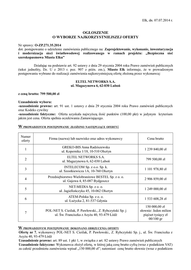 Ełk, dn. 07.07.2014 r. OGŁOSZENIE O WYBORZE NAJKORZYSTNIEJSZEJ OFERTY Nr sprawy: O-ZP.271.35.2014 dot. postępowanie o udzielenie zamówienia publicznego na: Zaprojektowanie, wykonanie, inwentaryzacja i modernizacja sieci światłowodowej realizowanego w ramach projektu: „Bezpieczna sieć szerokopasmowa Miasta Ełku” Działając na podstawie art. 92 ustawy z dnia 29 stycznia 2004 roku Prawo zamówień publicznych (tekst jednolity, Dz. U z 2013 r. poz. 907 z późn. zm.), Miasto Ełk informuje, że w prowadzonym postępowaniu wybrano do realizacji zamówienia najkorzystniejszą ofertę złożoną przez wykonawcę: ELTEL NETWORKS S.A. ul. Magazynowa 6, 62-030 Luboń z ceną brutto: 799 500,00 zł Uzasadnienie wyboru: -uzasadnienie prawne: art. 91 ust. 1 ustawy z dnia 29 stycznia 2004 roku Prawo zamówień publicznych oraz Kodeks cywilny -uzasadnienie faktyczne: Oferta uzyskała najwyższą ilość punktów (100,00 pkt) w jedynym kryterium jakim jest cena. Oferta spełnia oczekiwania Zamawiającego. W PROWADZONYM POSTĘPOWANIU ZŁOŻONO NASTĘPUJĄCE OFERTY: Numer oferty Firma (nazwa) lub nazwisko oraz adres wykonawcy Cena brutto 1 GREKO-BIS Anna Radziszewska ul. Kopernika 1/18, 10-510 Olsztyn 1 239 840,00 zł 2 ELTEL NETWORKS S.A. ul. Magazynowa 6, 62-030 Luboń 799 500,00 zł 3 INTELECOM Sp. z o.o. Sp. k. ul. Szostkiewicza 1A, 10-760 Olsztyn 1 101 978,80 zł 4 Przedsiębiorstwo Wielobranżowe BESTEL Sp. z o. o. ul. Gajowa 4, 85-087 Bydgoszcz 2 906 859,00 zł 5 NET-MEDIA Sp. z o. o. ul. Jagiellończyka 45, 10-062 Olsztyn 1 249 000,00 zł 6 ATEM-Polska Sp. z o. o. ul. Łużycka 2, 81-537 Gdynia 1 533 608,28 zł 7 POL-NET S. Cieślak, P. Pawłowski., Z. Rybczyński Sp. j ul. Św. Franciszka z Asyżu 40, 93-479 Łódź 150 000,00 zł słownie: Jeden milion pięćset tysięcy zł 00/100 gr W PROWADZONYM POSTĘPOWANIU DOKONANO ODRZUCENIA OFERTY Ofertę nr 7, wykonawcy POL-NET S. Cieślak, P. Pawłowski., Z. Rybczyński Sp. j., ul. Św. Franciszka z Asyżu 40, 93-479 Łódź Uzasadnienie prawne: art. 89 ust. 1 pkt 1, w związku z art. 82 ustawy Prawo zamówień publicznych Uzasadnienie faktyczne: Wykonawca złożył ofertę, w której jaką cenę brutto cyfrą (wraz z podatkiem VAT) za całość przedmiotu zamówienia wpisał „150 000,00 zł”; natomiast cenę brutto słownie (wraz z podatkiem VAT) za całość przedmiotu zamówienia wpisał „jeden milion pięćset tysięcy złotych 00/100 zł”. Zamawiający nie jest wstanie określić, która cena jest ceną poprawną. W związku z powyższym wykonawca zaoferował dwie ceny, tj. złożył dwie oferty, natomiast zgodnie z art. art. 82 ust. 1 ustawy Prawo zamówień publicznych wykonawca może złożyć jedną ofertę. PUNKTACJA PRZYZNANA OFERTOM SPEŁNIAJĄCYM WSZYSTKIE WYMAGANIA ZAWARTE W SIWZ: Numer oferty Nazwa (firma) i adres wykonawcy Liczba pkt w kryterium Cena Razem 1 GREKO-BIS Anna Radziszewska ul. Kopernika 1/18, 10-510 Olsztyn 64,48 64,48 2 ELTEL NETWORKS S.A. ul. Magazynowa 6, 62-030 Luboń 100,00 100,00 3 INTELECOM Sp. z o.o. Sp.k. ul. Szostkiewicza 1A, 10-760 Olsztyn 72,55 72,55 4 Przedsiębiorstwo Wielobranżowe BESTEL Sp. z o.o. ul. Gajowa 4, 85-087 Bydgoszcz 27,50 27,50 5 NET-MEDIA Sp. z o.o. ul. Jagiellończyka 45, 10-062 Olsztyn 64,01 64,01 6 ATEM-Polska Sp. z o.o. ul. Łużycka 2, 81-537 Gdynia 52,13 52,13 Podpis Z up. PREZYDENTA Z-ca Prezydenta Miasta /-/ Artur Urbański