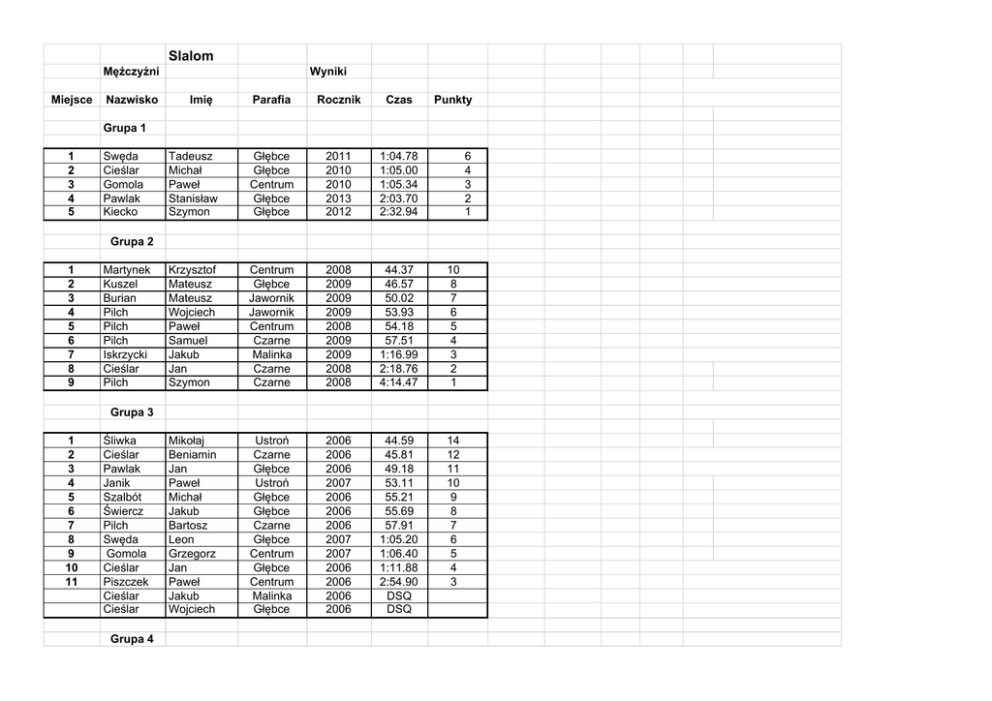 Slalom Mężczyźni Miejsce Nazwisko Wyniki Imię Parafia Rocznik Czas Punkty Tadeusz Michał Paweł Stanisław Szymon Głębce Głębce Centrum Głębce Głębce 2011 2010 2010 2013 2012 1:04.78 1:05.00 1:05.34 2:03.70 2:32.94 Krzysztof Mateusz Mateusz Wojciech Paweł Samuel Jakub Jan Szymon Centrum Głębce Jawornik Jawornik Centrum Czarne Malinka Czarne Czarne 2008 2009 2009 2009 2008 2009 2009 2008 2008 44.37 46.57 50.02 53.93 54.18 57.51 1:16.99 2:18.76 4:14.47 10 8 7 6 5 4 3 2 1 Mikołaj Beniamin Jan Paweł Michał Jakub Bartosz Leon Grzegorz Jan Paweł Jakub Wojciech Ustroń Czarne Głębce Ustroń Głębce Głębce Czarne Głębce Centrum Głębce Centrum Malinka Głębce 2006 2006 2006 2007 2006 2006 2006 2007 2007 2006 2006 2006 2006 44.59 45.81 49.18 53.11 55.21 55.69 57.91 1:05.20 1:06.40 1:11.88 2:54.90 DSQ DSQ 14 12 11 10 9 8 7 6 5 4 3 Grupa 1 1 2 3 4 5 Swęda Cieślar Gomola Pawlak Kiecko 6 4 3 2 1 Grupa 2 1 2 3 4 5 6 7 8 9 Martynek Kuszel Burian Pilch Pilch Pilch Iskrzycki Cieślar Pilch Grupa 3 1 2 3 4 5 6 7 8 9 10 11 Śliwka Cieślar Pawlak Janik Szalbót Świercz Pilch Swęda Gomola Cieślar Piszczek Cieślar Cieślar Grupa 4 1 2 Pilch Mitręga Molin Dawid Grzegorz Gustaw Czarne Centrum Centrum 2005 2004 2005 58.85 01:00.5 DNS Grzegorz Mikołaj Paweł Andrzej Mateusz Dominik Szymon Grzegorz Michał Mateusz Ustroń Centrum Centrum Jawornik Tychy Jawornik Centrum Centrum Centrum Centrum 2002 2002 2003 2002 2002 2003 2002 2002 2002 2002 39.36 42.55 45.11 50.29 50.90 54.82 55.66 58.48 1:02.26 1:05.28 11 9 8 7 6 5 4 3 2 1 Bartosz Jakub Damian Zbigniew Tymoteusz Centrum Jawornik Jawornik Czarne Czarne 2001 2000 2000 2001 2001 41.62 44.14 44.77 47.41 DNS 6 4 3 2 Marcin Mateusz Dawid Przemysław Andrzej Grzegorz Daniel Łukasz Centrum Centrum Ustroń Głębce Jawornik Tychy Jawornik Ustroń 1992 1996 1999 1999 1999 1999 1999 1992 34.58 39.18 39.20 39.32 41.03 46.98 47.13 52.68 9 7 6 5 4 3 2 1 Głębce Głębce Głębce Głębce 1992 1994 1983 1987 37.96 38.65 39.27 39.49 12 10 9 8 Grupa 5 1 2 3 4 5 6 7 8 9 10 Hussar Bebek Poloczek Karkoszka Adamus Niemczyk Cieślar Pilch Zawada Wisełka Grupa 6 1 2 3 4 Mitręga Konderla Pilch Michalik Pilch Grupa 7 1 2 3 4 5 6 7 8 Czyż Cieślar Hussar Kuszel Cieślar Adamus Konderla Kobiela Grupa 8 1 2 3 4 Szarzec Szarzec Kiecko Pilch Mateusz Sebastian Piotr Artur 5 6 7 8 9 10 11 Jędrzejek Cieślar Wapiennik Szalbót Heczko Brózda Cieślar Tomasz Janusz Łukasz Andrzej Tadeusz Szymon Łukasz Głębce Jawornik Centrum 1984 1988 1982 41.51 43.08 45.02 46.22 1:01.79 DSQ DSQ 7 6 5 4 3 Centrum Jawornik Głębce 1980 1991 1982 Roman Leszek Janusz Zdzisław Andrzej Adam Bronisław Bogusław Aleksander Paweł Adam Leszek Paweł Jan Janusz Dariusz Piotr Paweł Tomasz Krystian Czarne Czarne Centrum Czarne Malinka Centrum Jawornik Ustroń Czarne Czarne Gliwice Głębce Głębce Malinka Głębce Czarne Czarne 1969 1976 1969 1975 1975 1973 1968 1974 1973 1972 1976 1976 1977 1968 1969 1967 1976 1978 1979 35.79 35.93 38.33 39.42 39.71 39.33 40.59 40.69 41.02 41.37 42.21 43.18 43.51 44.04 44.81 44.94 47.03 49.94 55.74 1:17.21 21 19 18 17 16 15 14 13 12 11 10 9 8 7 6 5 4 3 2 1 Głębce Centrum Tadeusz Krzysztof Piotr Andrzej Stanisław Andrzej Edward Władysław Władysław Waldemar Głębce Czarne Głębce Bładnice Głębce Ustroń Centrum Głębce Centrum Centrum 1966 1967 1963 1953 1952 1967 1961 1952 1949 1961 38.79 38.94 39.82 44.25 48.31 48.66 49.51 50.34 59.45 1:06.02 11 9 8 7 6 5 4 3 Grupa 9 1 2 3 4 5 6 7 8 9 10 11 12 13 14 15 16 17 18 19 20 Cieślar Pilch Bebek Cieślar Cieślar Cieślar Kukuczka Hussar Michalik Mosler Marek Wycisk Pawlak Czyż Pilch Cieślar Pilch Czyż Bujok Piszczek Grupa 10 1 2 3 4 5 6 7 8 9 10 Pilch Pilch Szarzec Kral Wantulok Szewieczek Gomola Sztwiertnia Cieślar Szajthauer 2 1