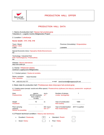 PRODUCTION HALL OFFER PRODUCTION HALL DATA 1. Name of production hall / Nazwa hali produkcyjnej Tokarska 2 – Logistic Centre Mełgiewska Project 2. Location / Lokalizacja Numer działki : 1/17, 1/18, 1/19 Province (Voivodship) / Województwo Town / Street Miasto / Ulica Lublin Lubelskie Special Economic Zone / Specjalna Strefa Ekonomiczna No Technology / Industrial Park Park Technologiczny / Przemysłowy No Website / Strona internetowa http://clm.lublin.pl/ 3. Owner / Właściciel obiektu Centrum Logistyczne Mełgiewska 3. 1 Contact person / Osoba do kontaktu Name, surname Imię, nazwisko Karol Kondrat Tel: +48 510 310 777 e-mail: [email protected] 4. Basic data for production hall / Podstawowe dane dotyczące hali produkcyjnej 4.1 Usable space (except: social and office space) / Powierzchnia użytkowa (nie dotyczy: powierzchni socjalnych i biurowych) Area Powierzchnia approx. 28 000 (modules: from 2 000 to 10 000) Height Wysokość Floor carrying capacity Nacisk na posadzkę 10 - sq.m. m2 Number of storeys Liczba kondygnacji 1 m Year of construction Rok budowy 1999 kN / sq.m. kN / m 2 Year of modernization Rok modernizacji 4.2 Present technical condition / Obecny stan techniczny Excellent / Doskonały Good / Dobry X Standard / Średni Poor / Słaby 1 2017 (I quarter) 4.3 Total area of land Całkowita powierzchnia terenu 127500 sq.m. m2 5. Transport link / Połączenia transportowe Nearest motorway / National road Najbliższa droga szybkiego ruchu / krajowa km Nearest voivodship city Najbliższe miasto wojewódzkie km Lublin – 5km to city center Nearest international airport Najbliższe lotnisko międzynarodowe km Lublin Airport – 10km S12/S17/S19 – 1km 6. Infrastructure / Infrastruktura Power / Elektryczność X Sewage system / Kanalizacja X Water / Woda X Access road for trucks / Dojazd dla ciężarówek X Gas / Gaz X Overhead cranes / Suwnice Heating / Ogrzewanie X Railway siding / Bocznica X 7. Terms of acquisition / Warunki nabycia Ownership / Własność Perpetual usufruct / Użytkowanie wieczyste Lease / Wynajem X 15 7.1 Price in PLN, including hall and land PLN (3,50 EUR) Cena w pln, hali i działki 8. Additional information / Dodatkowe informacje Why Lublin? Lublin is the biggest city in Eastern Poland with the number of inhabitants reaching 350,000. It is also the capital of Lublin Voivodship populated by over 2 mln people. Lublin is a city, which gives very favorable access to Ukraine and Belarus. Lublin is well-connected with other regions thanks to an extensive network of trains, buses and roadways. The city benefits from heavy investments in transport infrastructure. Lublin is a dynamically developing industrial center with automotive sector as well as machine and aviation industries on the rise. Lublin-based companies are associated in the Eastern Metalworking Cluster and Lublin Cluster of Advanced Aviation Technologies which ensures an extensive network of potential partners and many opportunities to exchange know-how. Lublin is favorably located between Warsaw and eastern borders of Poland and European Union (Warsaw 160 km, Hrebenne 85 km, Terespol 160km). This provides opportunities for commercial expansion towards Eastern markets. Lublin abounds in qualified human resources thanks to as many as 9 higher education institutions and more than 68 000 students and 20 000 graduates yearly. Lublin offers attractive investment areas in the Special Economic Zone next to the now-constructed S17 express road (Warsaw-Hrebenne) and only 10 km from the Lublin Airport. Lublin facilitates cutting down fixed costs. Employment and operational costs in Lublin are 20-30% lower than in western Poland. Lublin has a big competitive advantage in relation to employees - rotation of workers amounts to few percent each year, while in western Poland it reaches even 40%. Lublin is a city of young people. 52% of inhabitants are younger than 40 and 66% is at working age. Lublin’s residents are multilingual. In accordance with results of Study of Human Capital in Poland, 91% of them speak English, 31% German and 20% Russian. A small proportion of them speak French, Italian and Ukrainian. Special Economic Zone The area of the LUBLIN SUBZONE is located in the south-east part of the city near Witosa St., close to the 2 currently constructed city ring-road, the S-17 express road interchange and the Lublin Airport. The area of the Subzone today includes over 128 hectares of investment sites. Currently 41 companies invested In Lublin Subzone from which 28 have active permission to operate in SEZ. The total amount of expenditures realized by the Lublin Subzone entrants reaches 955 million PLN and current employment in the companies in SEZ exceeds 2 700 persons. On the basis of the Permit issued by the Minister of Economy, investors conducting business activity in the Euro-Park Mielec Special Economic Zone, LUBLIN SUBZONE are entitled to benefit from public assistance, also referred to as regional aid, in the form of corporate income tax reliefs (CIT). The public assistance is granted with regard to: 1. investment expenditures 2. creation of new jobs In Lublin the public aid rates reaches 50% for large companies, 60% for medium and 70% for small companies. It is maximum level available In whole Poland. Every company which buy land In Lublin Subzone can obtain a 4-year relief from real estate tax. Human capital Lublin is the biggest academic centre in the Eastern Poland. The University of Technology educates each year hundreds of well-educated workers for industry. The authorities of the university are open for cooperation with business environment. There are also four more public universities of international renown in Lublin (Maria Curie-Skłodowska University, John Paul II Catholic University of Lublin, University of Life Sciences. Medical University) and a dozen or so private colleges. Over 68 000 people study in the city, including over 5 500 foreigners. This puts Lublin on the 2th place in ter