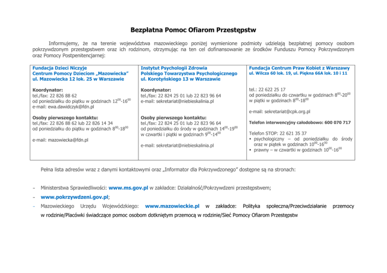 Bezpłatna Pomoc Ofiarom Przestępstw Informujemy, że na terenie województwa mazowieckiego poniżej wymienione podmioty udzielają bezpłatnej pomocy osobom pokrzywdzonym przestępstwem oraz ich rodzinom, otrzymując na ten cel dofinansowanie ze środków Funduszu Pomocy Pokrzywdzonym oraz Pomocy Postpenitencjarnej: Fundacja Dzieci Niczyje Centrum Pomocy Dzieciom „Mazowiecka” ul. Mazowiecka 12 lok. 25 w Warszawie Instytut Psychologii Zdrowia Polskiego Towarzystwa Psychologicznego ul. Korotyńskiego 13 w Warszawie Fundacja Centrum Praw Kobiet z Warszawy Koordynator: tel./fax: 22 826 88 62 od poniedziałku do piątku w godzinach 1200-1600 e-mail: [email protected] Koordynator: tel./fax: 22 824 25 01 lub 22 823 96 64 e-mail: [email protected] tel.: 22 622 25 17 od poniedziałku do czwartku w godzinach 800-2000 w piątki w godzinach 800-1800 ul. Wilcza 60 lok. 19, ul. Piękna 66A lok. 10 i 11 e-mail: [email protected] Osoby pierwszego kontaktu: tel./fax: 22 826 88 62 lub 22 826 14 34 od poniedziałku do piątku w godzinach 800-1800 Osoby pierwszego kontaktu: tel./fax: 22 824 25 01 lub 22 823 96 64 od poniedziałku do środy w godzinach 1400-1900 w czwartki i piątki w godzinach 900-1400 e-mail: [email protected] e-mail: [email protected] Telefon interwencyjny całodobowo: 600 070 717 Telefon STOP: 22 621 35 37 psychologiczny – od poniedziałku do środy oraz w piątek w godzinach 1000-1600 prawny – w czwartki w godzinach 1000-1600 Pełna lista adresów wraz z danymi kontaktowymi oraz „Informator dla Pokrzywdzonego” dostępne są na stronach: - Ministerstwa Sprawiedliwości: www.ms.gov.pl w zakładce: Działalność/Pokrzywdzeni przestępstwem; - www.pokrzywdzeni.gov.pl; - Mazowieckiego Urzędu Wojewódzkiego: www.mazowieckie.pl w zakładce: Polityka społeczna/Przeciwdziałanie w rodzinie/Placówki świadczące pomoc osobom dotkniętym przemocą w rodzinie/Sieć Pomocy Ofiarom Przestępstw przemocy