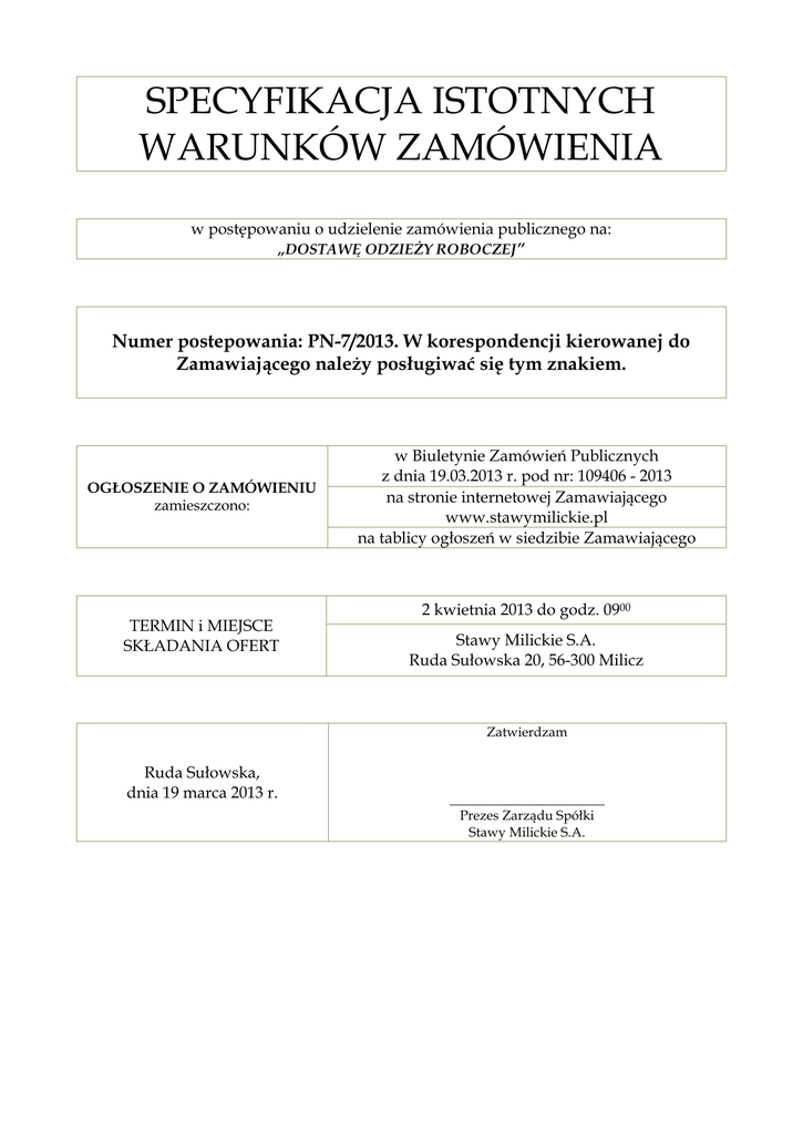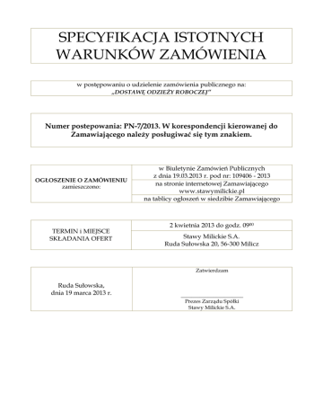 SPECYFIKACJA ISTOTNYCH WARUNKÓW ZAMÓWIENIA w postępowaniu o udzielenie zamówienia publicznego na: „DOSTAWĘ ODZIEŻY ROBOCZEJ” Numer postepowania: PN-7/2013. W korespondencji kierowanej do Zamawiającego należy posługiwać się tym znakiem. OGŁOSZENIE O ZAMÓWIENIU zamieszczono: TERMIN i MIEJSCE SKŁADANIA OFERT w Biuletynie Zamówień Publicznych z dnia 19.03.2013 r. pod nr: 109406 - 2013 na stronie internetowej Zamawiającego www.stawymilickie.pl na tablicy ogłoszeń w siedzibie Zamawiającego 2 kwietnia 2013 do godz. 0900 Stawy Milickie S.A. Ruda Sułowska 20, 56-300 Milicz Zatwierdzam Ruda Sułowska, dnia 19 marca 2013 r. _______________________ Prezes Zarządu Spółki Stawy Milickie S.A. SPIS TREŚCI: I. INFORMACJE O ZAMAWIAJĄCYM ............................................................................................................. 3 II. TRYB UDZIELENIA ZAMÓWIENIA .............................................................................................................. 3 III. OPIS PRZEDMIOTU ZAMÓWIENIA ............................................................................................................. 3 IV. TERMIN I MIEJSCE WYKONANIA ZAMÓWIENIA ................................................................................... 4 V. WARUNKI UDZIAŁU W POSTĘPOWANIU ORAZ OPIS SPOSOBU DOKONYWANIA OCENY SPEŁNIANIA TYCH WARUNKÓW ............................................................................................................... 4 VI. WYKAZ OŚWIADCZEŃ LUB DOKUMENTÓW JAKIE MAJĄ DOSTARCZYĆ WYKONAWCY W CELU POTWIERDZENIA SPEŁNIANIA WARUNKÓW UDZIAŁU W POSTĘPOWANIU .................. 5 VII. OFERTY WSPÓLNE/KONSORCJUM ............................................................................................................ 6 VIII. INFORMACJE O SPOSOBIE POROZUMIEWANIA SIĘ ZAMAWIAJĄCEGO Z WYKONAWCAMI ORAZ PRZEKAZYWANIA OŚWIADCZEŃ LUB DOKUMENTÓW, A TAKŻE WSKAZANIE OSÓB UPRAWNIONYCH DO POROZUMIEWANIA SIĘ Z WYKONAWCAMI. .............................................. 7 IX. WYMAGANIA DOTYCZĄCE WADIUM ...................................................................................................... 8 X. TERMIN ZWIĄZANIA OFERTĄ ..................................................................................................................... 8 XI. OPIS SPOSOBU PRZYGOTOWANIA OFERT ............................................................................................. 10 XII. MIEJSCE ORAZ TERMIN SKŁADANIA I OTWARCIA OFERT .............................................................. 11 XIII. OPIS SPOSOBU OBLICZANIA CENY .......................................................................................................... 12 XIV. OPIS KRYTERIÓW, KTÓRYMI ZAMAWIAJĄCY BĘDZIE SIĘ KIEROWAŁ PRZY WYBORZE OFERTY WRAZ Z PODANIEM ZNACZENIA TYCH KRYTERIÓW I SPOSOBU OCENY OFERT ... 12 XV. INFORMACJE O FORMALNOŚCIACH JAKIE POWINNY ZOSTAĆ DOPEŁNIONE PO WYBORZE OFERTY W CELU ZAWARCIA UMOWY W SPRAWIE ZAMÓWIENIA PUBLICZNEGO ................. 12 XVI. WYMAGANIA DOTYCZĄCE ZABEZPIECZENIA NALEŻYTEGO WYKONANIA UMOWY .......... 14 XVII. ISTOTNE DLA STRON POSTANOWIENIA, KTÓRE ZOSTANĄ WPROWADZONE DO TREŚCI ZAWIERANEJ UMOWY W SPRAWIE ZAMÓWIENIA PUBLICZNEGO, OGÓLNE WARUNKI UMOWY ALBO WZÓR UMOWY JEŻELI ZAMAWIAJĄCY WYMAGA OD WYKONAWCY ABY ZAWARŁ Z NIM UMOWĘ W SPRAWIE ZAMÓWIENIA PUBLICZNEGO NA TAKICH WARUNKACH ................................................................................................................................................. 14 XVIII. POUCZENIE O ŚRODKACH OCHRONY PRAWNEJ PRZYSŁUGUJĄCYCH WYKONAWCY W TOKU POSTEPOWANIA O UDZIELENIE ZAMÓWIENIA ..................................................................... 14 XIX. POSTANOWIENIA DOTYCZĄCE PROTOKOŁU POSTĘPOWANIA .................................................... 14 ZAŁĄCZNIKI STANOWIĄCE CZĘŚĆ SKŁADOWĄ SIWZ: 1. 2. 3. 4. 5. 6. Załącznik nr 1 do SIWZ. Szczegółowy opis przedmiotu zamówienia. Załącznik nr 2 do SIWZ. Formularz oferty. Załącznik nr 3 do SIWZ. Wzór graficzny. Załącznik nr 4 do SIWZ. Oświadczenie z art. 22 ust. 1 ustawy Pzp. Załącznik nr 5 do SIWZ. Oświadczenie z art. 24 ust. 1 ustawy Pzp. Załącznik nr 6 do SIWZ. Oświadczenie z art. 24 ust. 1 ustawy Pzp w przypadku osób fizycznych. 7. Załącznik nr 7 do SIWZ. Wykaz wykonanych dostaw. 8. Załącznik nr 8 do SIWZ. Umowa w sprawie zamówienia publicznego. 2|S t r o n a I. INFORMACJE O ZAMAWIAJĄCYM Nazwa: Adres: Numer telefonu/faksu: Adres e-mail: Strona Internetowa: Godziny urzędowania: Stawy Milickie Spółka Akcyjna Ruda Sułowska 20, 56-300 Milicz, (71) 384 71 10, [email protected] www.stawymilickie.pl poniedziałek – piątek w godzinach od 0700 do 1500 II. TRYB UDZIELENIA ZAMÓWIENIA 1. Postępowanie o udzielenie zamówienia publicznego na dostawę odzieży roboczej prowadzone jest w trybie przetargu nieograniczonego na podstawie ustawy z dnia 29 stycznia 2004 r. – Prawo zamówień publicznych (Dz. U. z 2010 r. Nr 113 poz. 759 z późn. zm.) o wartości szacunkowej nieprzekraczającej w złotych równowartości kwoty 200.000 euro. 2. Czynności podejmowane przez Zamawiającego i Wykonawców w toku postępowania o udzielenie zamówienia publicznego podlegają przepisom ustawy z dnia 29 stycznia 2004 r. – Prawo zamówień publicznych oraz ustawy z dnia 23 kwietnia 1964 r. – Kodeks cywilny (Dz. U. z 1964 r. Nr 16 poz. 93 z późn. zm.). 3. Zasadniczym źródłem informacji dotyczących zasad sporządzenia oferty jest niniejsza Specyfikacja Istotnych Warunków Zamówienia (dalej: SIWZ) oraz przepisy Ustawy Prawo Zamówień Publicznych (dalej: u.p.z.p.). W sprawach nieuregulowanych w niniejszej SIWZ zastosowanie mają przepisy u.p.z.p. oraz aktów wykonawczych do niej. 4. Zamawiający nie przewiduje możliwości udzielenia zamówień uzupełniających. 5. Zamawiający nie dopuszcza możliwość składania ofert częściowych lub wariantowych. 6. 