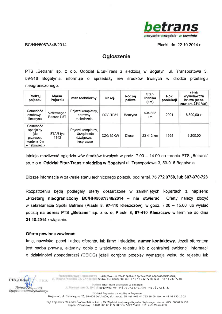 pocztE na adres: PTS ,,Betrans" sp. z o. o, Piaski 8,97-410 Kleszcz6w w terminie do dnia