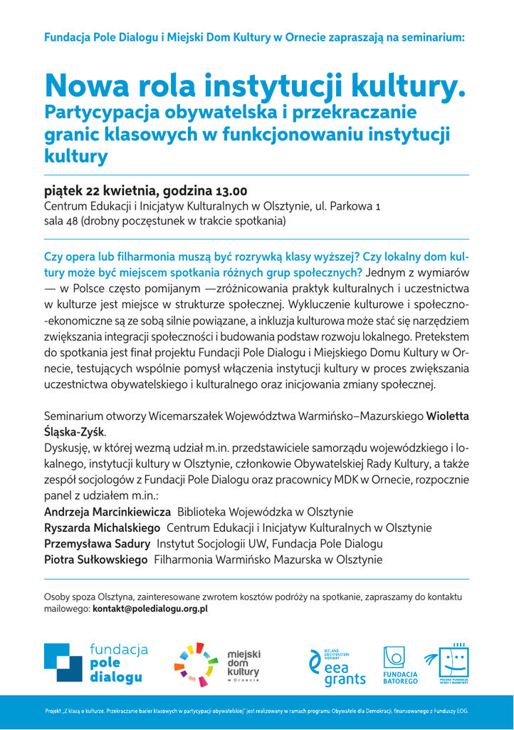 Fundacja Pole Dialogu i Miejski Dom Kultury w Ornecie zapraszają na seminarium: Nowa rola instytucji kultury. Partycypacja obywatelska i przekraczanie granic klasowych w funkcjonowaniu instytucji kultury piątek 22 kwietnia, godzina 13.00 Centrum Edukacji i Inicjatyw Kulturalnych w Olsztynie, ul. Parkowa 1 sala 48 (drobny poczęstunek w trakcie spotkania) Czy opera lub filharmonia muszą być rozrywką klasy wyższej? Czy lokalny dom kultury może być miejscem spotkania różnych grup społecznych? Jednym z wymiarów — w Polsce często pomijanym —zróżnicowania praktyk kulturalnych i uczestnictwa w kulturze jest miejsce w strukturze społecznej. Wykluczenie kulturowe i społeczno-ekonomiczne są ze sobą silnie powiązane, a inkluzja kulturowa może stać się narzędziem zwiększania integracji społeczności i budowania podstaw rozwoju lokalnego. Pretekstem do spotkania jest finał projektu Fundacji Pole Dialogu i Miejskiego Domu Kultury w Ornecie, testujących wspólnie pomysł włączenia instytucji kultury w proces zwiększania uczestnictwa obywatelskiego i kulturalnego oraz inicjowania zmiany społecznej. Seminarium otworzy Wicemarszałek Województwa Warmińsko–Mazurskiego Wioletta Śląska-Zyśk. Dyskusję, w której wezmą udział m.in. przedstawiciele samorządu wojewódzkiego i lokalnego, instytucji kultury w Olsztynie, członkowie Obywatelskiej Rady Kultury, a także zespół socjologów z Fundacji Pole Dialogu oraz pracownicy MDK w Ornecie, rozpocznie panel z udziałem m.in.: Andrzeja Marcinkiewicza Biblioteka Wojewódzka w Olsztynie Ryszarda Michalskiego Centrum Edukacji i Inicjatyw Kulturalnych w Olsztynie Przemysława Sadury Instytut Socjologii UW, Fundacja Pole Dialogu Piotra Sułkowskiego Filharmonia Warmińsko Mazurska w Olsztynie Osoby spoza Olsztyna, zainteresowane zwrotem kosztów podróży na spotkanie, zapraszamy do kontaktu mailowego: [email protected]