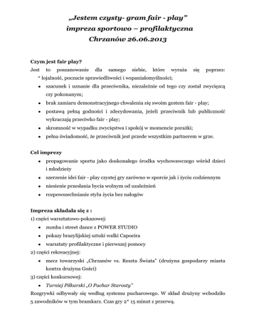 „Jestem czysty- gram fair - play” impreza sportowo – profilaktyczna Chrzanów 26.06.2013 Czym jest fair play? Jest to poszanowanie dla samego siebie, które wyraża się poprzez: * lojalność, poczucie sprawiedliwości i wspaniałomyślności; szacunek i uznanie dla przeciwnika, niezależnie od tego czy został zwycięzcą czy pokonanym; brak zamiaru demonstracyjnego chwalenia się swoim gestem fair - play; postawą pełną godności i zdecydowania, jeżeli przeciwnik lub publiczność wykraczają przeciwko fair - play; skromność w wypadku zwycięstwa i spokój w momencie porażki; pełna świadomość, że przeciwnik jest przede wszystkim partnerem w grze. Cel imprezy propagowanie sportu jako doskonałego środka wychowawczego wśród dzieci i młodzieży szerzenie idei fair - play czystej gry zarówno w sporcie jak i życiu codziennym niesienie przesłania bycia wolnym od uzależnień rozpowszechnianie stylu życia bez nałogów Impreza składała się z : 1) części warsztatowo-pokazowej: zumba i street dance z POWER STUDIO pokazy brazylijskiej sztuki walki Capoeira warsztaty profilaktyczne i pierwszej pomocy 2) części rekreacyjnej: mecz towarzyski „Chrzanów vs. Reszta Świata” (drużyna gospodarzy miasta kontra drużyna Gości) 3) części konkursowej: Turniej Piłkarski „O Puchar Starosty” Rozgrywki odbywały się według systemu pucharowego. W skład drużyny wchodziło 5 zawodników w tym bramkarz. Czas gry 2* 15 minut z przerwą. Nagrody otrzymali : I miejsce - Placówka Opiekuńczo –Wychowawcza w Radoczy II miejsce - Placówka Opiekuńczo –Wychowawcza „RAZEM” w Gorlicach III miejsce - Placówka Opiekuńczo –Wychowawcza w Kętach W kategorii „Najlepszy Strzelec” nagrodę otrzymał wychowanek z Placówki Opiekuńczo –Wychowawczej w Radoczy W kategorii „Najmłodszy Strzelec” nagrodę otrzymał wychowanek z Placówki Opiekuńczo –Wychowawczej w Kętach Konkurs drużyn Cheerleaders Placówkę reprezentował jeden zespół taneczny. Grupa taneczna wykonywała układ taneczny do wybranej przez siebie muzyki. Nagrody otrzymali: I miejsce - Powiatowy Ośrodek Wsparcia Dziecka i Rodziny w Chrzanowie II miejsce - Placówka Opiekuńczo –Wychowawcza w Kętach III miejsce - Placówka Opiekuńczo-Wychowawcza „Promyk” w Rzuchowej Konkurs wiedzy o sporcie i profilaktyce uzależnień Konkurs składał się z dwóch etapów. Pierwszy etap to test wiedzy o sporcie, składający się z 15 pytań. Drugi etap to finał quizu z udziałem publiczności. W przerwie między I i II etapem odbywała się prelekcja filmu dotycząca skutków zażywania narkotyków. Nagrody otrzymali: I miejsce – wychowanek z Wioski Dziecięcej Oświęcim – Rajsko II miejsce – wychowanka z Ośrodka Terapii Uzależnień w Jeżówce III miejsce – wychowanek z Socjalizacyjnej Placówki Opiekuńczo-Wychowawczej w Olkuszu *Konkurs plastyczny Uczestnicy wykonali plakat promujący sport jako zdrowy tryb życia. Technika wykonania prac : malowanie farbami na dużym kartonie. Plakat wykonywany był w parach. Nagrody otrzymali: I miejsce – wychowankowie z Wioski Dziecięcej Oświęcim – Rajsko II miejsce wychowankowie z Placówki Opiekuńczo –Wychowawczej „RAZEM” w Gorlicach III miejsce – wychowankowie z Powiatowego Ośrodka Wsparcia Dziecka i Rodziny w Chrzanowie Turniej „Boccia” Celem turnieju było rozwijanie zainteresowań, integracja społeczna, konfrontacja umiejętności, współzawodnictwo i nawiązywanie kontaktów. Nagrody otrzymali: I miejsce – wychowanek z Ośrodka Terapii Uzależnień w Jeżówce II miejsce – wychowanek z Centrum Administracyjnego dla Placówek Socjalizacyjnych im. Janusza Korczaka w Miechowie III miejsce – wychowanek z Placówki Opiekuńczo –Wychowawczej w Radoczy W imprezie uczestniczyły następujące placówki: 1. Wioska Dziecięca Oświęcim – Rajsko 2. Zespół Placówek Opiekuńczo – Wychowawczych w Krakowie 3. Dom Dziecka w Jasieniu 4. Placówka Opiekuńczo –Wychowawcza „RAZEM” w Gorlicach 5. Socjalizacyjna Placówka Opiekuńczo-wychowawcza w Olkuszu 6. Ośrodek Terapii Uzależnień w Jeżówce 7. Placówka Opiekuńczo –Wychowawcza w Radoczy 8. Zespół Placówek Opiekuńczy –Wychowawczych w Nowym Sączu 9. Placówka Opiekuńczo-Wychowawcza „Promyk” w Rzuchowej 10. Dom Dziecka im. Bł. Jana Pawła II w Chrzanowie 11. Centrum Administracyjne dla Placówek Socjalizacyjnych im. Janusza Korczaka w Miechowie 12. Placówka Opiekuńczo –Wychowawcza w Kętach 13. Powiatowy Ośrodek Wsparcia Dziecka i Rodziny w Chrzanowie