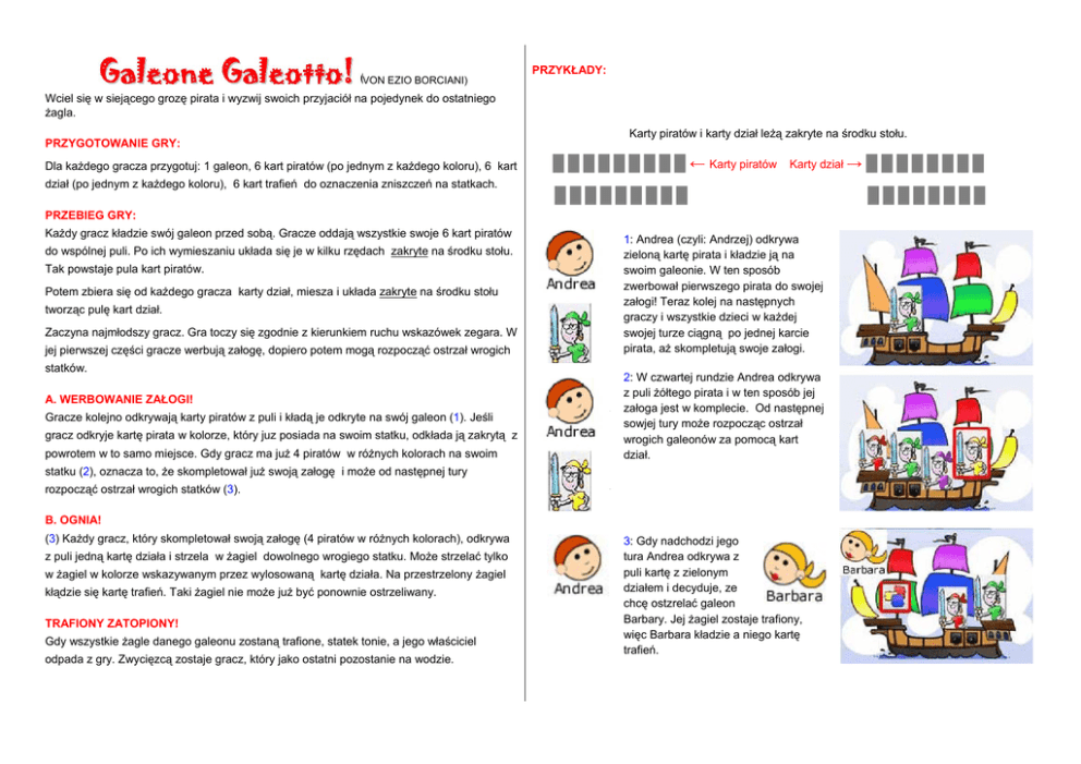 VON EZIO BORCIANI) PRZYKŁADY: Wciel się w siejącego grozę pirata i wyzwij swoich przyjaciół na pojedynek do ostatniego żagla. PRZYGOTOWANIE GRY: Dla każdego gracza przygotuj: 1 galeon, 6 kart piratów (po jednym z każdego koloru), 6 kart dział (po jednym z każdego koloru), 6 kart trafień do oznaczenia zniszczeń na statkach. Karty piratów i karty dział leżą zakryte na środku stołu. █ █ █ █ █ █ █ █ █ ← Karty piratów Karty dział → █████████ PRZEBIEG GRY: Każdy gracz kładzie swój galeon przed sobą. Gracze oddają wszystkie swoje 6 kart piratów do wspólnej puli. Po ich wymieszaniu układa się je w kilku rzędach zakryte na środku stołu. Tak powstaje pula kart piratów. Potem zbiera się od każdego gracza karty dział, miesza i układa zakryte na środku stołu tworząc pulę kart dział. Zaczyna najmłodszy gracz. Gra toczy się zgodnie z kierunkiem ruchu wskazówek zegara. W jej pierwszej części gracze werbują załogę, dopiero potem mogą rozpocząć ostrzał wrogich statków. A. WERBOWANIE ZAŁOGI! Gracze kolejno odkrywają karty piratów z puli i kładą je odkryte na swój galeon (1). Jeśli gracz odkryje kartę pirata w kolorze, który juz posiada na swoim statku, odkłada ją zakrytą z powrotem w to samo miejsce. Gdy gracz ma już 4 piratów w różnych kolorach na swoim 1: Andrea (czyli: Andrzej) odkrywa zieloną kartę pirata i kładzie ją na swoim galeonie. W ten sposób zwerbował pierwszego pirata do swojej załogi! Teraz kolej na następnych graczy i wszystkie dzieci w każdej swojej turze ciągną po jednej karcie pirata, aż skompletują swoje załogi. 2: W czwartej rundzie Andrea odkrywa z puli żółtego pirata i w ten sposób jej załoga jest w komplecie. Od następnej sowjej tury może rozpocząc ostrzał wrogich galeonów za pomocą kart dział. statku (2), oznacza to, że skompletował już swoją załogę i może od następnej tury rozpocząć ostrzał wrogich statków (3). B. OGNIA! (3) Każdy gracz, który skompletował swoją załogę (4 piratów w różnych kolorach), odkrywa z puli jedną kartę działa i strzela w żagiel dowolnego wrogiego statku. Może strzelać tylko w żagiel w kolorze wskazywanym przez wylosowaną kartę działa. Na przestrzelony żagiel kłądzie się kartę trafień. Taki żagiel nie może już być ponownie ostrzeliwany. TRAFIONY ZATOPIONY! Gdy wszystkie żagle danego galeonu zostaną trafione, statek tonie, a jego właściciel odpada z gry. Zwycięzcą zostaje gracz, który jako ostatni pozostanie na wodzie. 3: Gdy nadchodzi jego tura Andrea odkrywa z puli kartę z zielonym działem i decyduje, ze chcę ostzrelać galeon Barbary. Jej żagiel zostaje trafiony, więc Barbara kładzie a niego kartę trafień. ████████ ████████