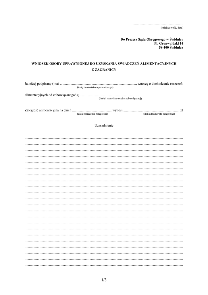 .......................................................... (miejscowość, data) Do Prezesa Sądu Okręgowego w Świdnicy Pl. Grunwaldzki 14 58-100 Świdnica WNIOSEK OSOBY UPRAWNIONEJ DO UZYSKANIA ŚWIADCZEŃ ALIMENTACYJNYCH Z ZAGRANICY Ja, niżej podpisany (-na) ......................................................................................., wnoszę o dochodzenie roszczeń (imię i nazwisko uprawnionego) alimentacyjnych od zobowiązanego/-ej ................................................................. . (imię i nazwisko osoby zobowiązanej) Zaległość alimentacyjna na dzień ............................................. wynosi ............................................................... zł (data obliczenia zaległości) (dokładna kwota zaległości) Uzasadnienie ..................................................................................................................................................................................... ..................................................................................................................................................................................... ..................................................................................................................................................................................... ..................................................................................................................................................................................... ..................................................................................................................................................................................... ..................................................................................................................................................................................... ..................................................................................................................................................................................... ..................................................................................................................................................................................... ..................................................................................................................................................................................... ..................................................................................................................................................................................... ..................................................................................................................................................................................... ..................................................................................................................................................................................... ..................................................................................................................................................................................... ..................................................................................................................................................................................... ..................................................................................................................................................................................... ..................................................................................................................................................................................... ..................................................................................................................................................................................... ..................................................................................................................................................................................... ..................................................................................................................................................................................... ..................................................................................................................................................................................... ..................................................................................................................................................................................... ..................................................................................................................................................................................... 1/3 Dane wnioskodawcy – osoby uprawnionej: Imię i nazwisko ..................................................................................... Data urodzenia ..................................................................................... Miejsce urodzenia ................................................................................. Obywatelstwo ....................................................................................... Nr identyfikacyjny PESEL ................................................................... Zawód ................................................................................................... Stan cywilny.......................................................................................... Data i miejsce zawarcia związku małżeńskiego ze zobowiązanym/-ną ..................................................................... Adres zameldowania .................................................................................................................................................. (ulica, nr domu/mieszkania, miejscowość, kod pocztowy) Adres zamieszkania..................................................................