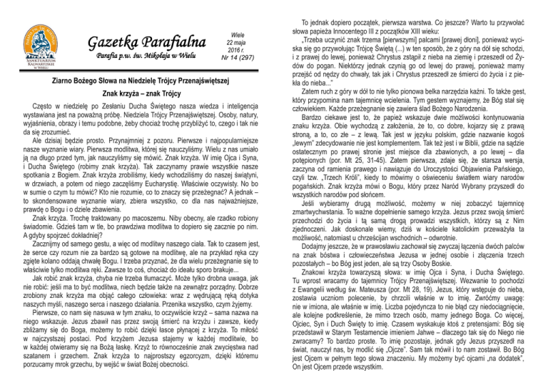 Gazetka Parafialna Parafia p.w. św. Mikołaja w Wielu Wiele 22 maja 2016 r. Nr 14 (297) Ziarno Bożego Słowa na Niedzielę Trójcy Przenajświętszej Znak krzyża – znak Trójcy Często w niedzielę po Zesłaniu Ducha Świętego nasza wiedza i inteligencja wystawiana jest na poważną próbę. Niedziela Trójcy Przenajświętszej. Osoby, natury, wyjaśnienia, obrazy i temu podobne, żeby chociaż trochę przybliżyć to, czego i tak nie da się zrozumieć. Ale dzisiaj będzie prosto. Przynajmniej z pozoru. Pierwsze i najpopularniejsze nasze wyznanie wiary. Pierwsza modlitwa, której się nauczyliśmy. Wielu z nas umiało ją na długo przed tym, jak nauczyliśmy się mówić. Znak krzyża. W imię Ojca i Syna, i Ducha Świętego (robimy znak krzyża). Tak zaczynamy prawie wszystkie nasze spotkania z Bogiem. Znak krzyża zrobiliśmy, kiedy wchodziliśmy do naszej świątyni, w drzwiach, a potem od niego zaczęliśmy Eucharystię. Właściwie oczywisty. No bo w sumie o czym tu mówić? Kto nie rozumie, co to znaczy się przeżegnać? A jednak – to skondensowane wyznanie wiary, zbiera wszystko, co dla nas najważniejsze, prawdę o Bogu i o dziele zbawienia. Znak krzyża. Trochę traktowany po macoszemu. Niby obecny, ale rzadko robiony świadomie. Gdzieś tam w tle, bo prawdziwa modlitwa to dopiero się zacznie po nim. A gdyby spojrzeć dokładniej? Zacznijmy od samego gestu, a więc od modlitwy naszego ciała. Tak to czasem jest, że serce czy rozum nie za bardzo są gotowe na modlitwę, ale na przykład ręka czy zgięte kolano oddają chwałę Bogu. I trzeba przyznać, że dla wielu przeżegnanie się to właściwie tylko modlitwa ręki. Zawsze to coś, chociaż do ideału sporo brakuje... Jak robić znak krzyża, chyba nie trzeba tłumaczyć. Może tylko drobna uwaga, jak nie robić: jeśli ma to być modlitwa, niech będzie także na zewnątrz porządny. Dobrze zrobiony znak krzyża ma objąć całego człowieka: wraz z wędrującą ręką dotyka naszych myśli, naszego serca i naszego działania. Przenika wszystko, czym żyjemy. Pierwsze, co nam się nasuwa w tym znaku, to oczywiście krzyż – sama nazwa na niego wskazuje. Jezus zbawił nas przez swoją śmierć na krzyżu i zawsze, kiedy zbliżamy się do Boga, możemy to robić dzięki łasce płynącej z krzyża. To miłość w najczystszej postaci. Pod krzyżem Jezusa stajemy w każdej modlitwie, bo w każdej otwieramy się na Bożą łaskę. Krzyż to równocześnie znak zwycięstwa nad szatanem i grzechem. Znak krzyża to najprostszy egzorcyzm, dzięki któremu porzucamy mrok grzechu, by wejść w świat Bożej obecności. To jednak dopiero początek, pierwsza warstwa. Co jeszcze? Warto tu przywołać słowa papieża Innocentego III z początków XIII wieku: „Trzeba uczynić znak trzema [pierwszymi] palcami [prawej dłoni], ponieważ wyciska się go przywołując Trójcę Świętą (...) w ten sposób, że z góry na dół się schodzi, i z prawej do lewej, ponieważ Chrystus zstąpił z nieba na ziemię i przeszedł od Żydów do pogan. Niektórzy jednak czynią go od lewej do prawej, ponieważ mamy przejść od nędzy do chwały, tak jak i Chrystus przeszedł ze śmierci do życia i z piekła do nieba...” Zatem ruch z góry w dół to nie tylko pionowa belka narzędzia kaźni. To także gest, który przypomina nam tajemnicę wcielenia. Tym gestem wyznajemy, że Bóg stał się człowiekiem. Każde przeżegnanie się zawiera ślad Bożego Narodzenia. Bardzo ciekawe jest to, że papież wskazuje dwie możliwości kontynuowania znaku krzyża. Obie wychodzą z założenia, że to, co dobre, kojarzy się z prawą stroną, a to, co złe – z lewą. Tak jest w języku polskim, gdzie nazwanie kogoś „lewym” zdecydowanie nie jest komplementem. Tak też jest i w Biblii, gdzie na sądzie ostatecznym po prawej stronie jest miejsce dla zbawionych, a po lewej – dla potępionych (por. Mt 25, 31-45). Zatem pierwsza, zdaje się, że starsza wersja, zaczyna od ramienia prawego i nawiązuje do Uroczystości Objawienia Pańskiego, czyli tzw. „Trzech Króli”, kiedy to mówimy o oświeceniu światłem wiary narodów pogańskich. Znak krzyża mówi o Bogu, który przez Naród Wybrany przyszedł do wszystkich narodów pod słońcem. Jeśli wybieramy drugą możliwość, możemy w niej zobaczyć tajemnicę zmartwychwstania. To ważne dopełnienie samego krzyża. Jezus przez swoją śmierć przechodzi do życia i tą samą drogą prowadzi wszystkich, którzy są z Nim zjednoczeni. Jak doskonale wiemy, dziś w kościele katolickim przeważyła ta możliwość, natomiast u chrześcijan wschodnich – odwrotnie. Dodajmy jeszcze, że w prawosławiu zachował się zwyczaj łączenia dwóch palców na znak bóstwa i człowieczeństwa Jezusa w jednej osobie i złączenia trzech pozostałych – bo Bóg jest jeden, ale są trzy Osoby Boskie. Znakowi krzyża towarzyszą słowa: w imię Ojca i Syna, i Ducha Świętego. Tu wprost wracamy do tajemnicy Trójcy Przenajświętszej. Wezwanie to pochodzi z Ewangelii według św. Mateusza (por. Mt 28, 19). Jezus, który wstępuje do nieba, zostawia uczniom polecenie, by chrzcili właśnie w to imię. Zwróćmy uwagę: nie w imiona, ale właśnie w imię. Liczba pojedyncza to nie błąd czy niedociągnięcie, ale kolejne podkreślenie, że mimo trzech osób, mamy jednego Boga. Co więcej, Ojciec, Syn i Duch Święty to imię. Czasem wyskakuje ktoś z pretensjami: Bóg się przedstawił w Starym Testamencie imieniem Jahwe – dlaczego tak się do Niego nie zwracamy? To bardzo proste. To imię pozostaje, jednak gdy Jezus przyszedł na świat, nauczył nas, by modlić się „Ojcze”. Sam tak mówił i to nam zostawił. Bo Bóg jest Ojcem w pełnym tego słowa znaczeniu. My możemy być ojcami „na dodatek”, On jest Ojcem przede wszystkim. Gdy w znaku krzyża jednym ciągiem wymieniamy Ojca, Syna i Ducha Świętego, to po to, żeby wskazać ich równość i jedność. Bóg jest jeden, a zarazem jes