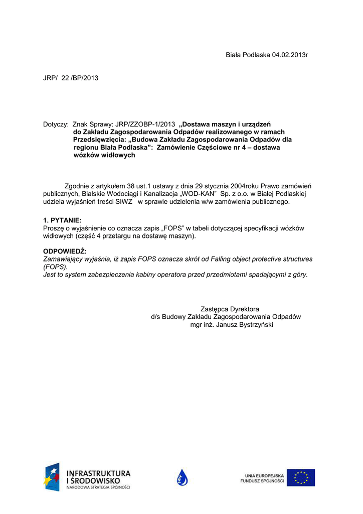 Biała Podlaska 04.02.2013r JRP/ 22 /BP/2013 Dotyczy: Znak Sprawy: JRP/ZZOBP-1/2013 „Dostawa maszyn i urządzeń do Zakładu Zagospodarowania Odpadów realizowanego w ramach Przedsięwzięcia: „Budowa Zakładu Zagospodarowania Odpadów dla regionu Biała Podlaska”: Zamówienie Częściowe nr 4 – dostawa wózków widłowych Zgodnie z artykułem 38 ust.1 ustawy z dnia 29 stycznia 2004roku Prawo zamówień publicznych, Bialskie Wodociągi i Kanalizacja „WOD-KAN” Sp. z o.o. w Białej Podlaskiej udziela wyjaśnień treści SIWZ w sprawie udzielenia w/w zamówienia publicznego. 1. PYTANIE: Proszę o wyjaśnienie co oznacza zapis „FOPS” w tabeli dotyczącej specyfikacji wózków widłowych (część 4 przetargu na dostawę maszyn). ODPOWIEDŹ: Zamawiający wyjaśnia, iż zapis FOPS oznacza skrót od Falling object protective structures (FOPS). Jest to system zabezpieczenia kabiny operatora przed przedmiotami spadającymi z góry. Zastępca Dyrektora d/s Budowy Zakładu Zagospodarowania Odpadów mgr inż. Janusz Bystrzyński Biała Podlaska 04.02.2013r JRP/ 23 /BP/2013 Dotyczy: Znak Sprawy: JRP/ZZOBP-1/2013 „Dostawa maszyn i urządzeń do Zakładu Zagospodarowania Odpadów realizowanego w ramach Przedsięwzięcia: „Budowa Zakładu Zagospodarowania Odpadów dla regionu Biała Podlaska”: Zamówienie Częściowe nr 4 – dostawa wózków widłowych oraz Zamówienie Częściowe nr 2 – dostawa ładowarki kołowej teleskopowej Zgodnie z artykułem 38 ust.1 ustawy z dnia 29 stycznia 2004roku Prawo zamówień publicznych, Bialskie Wodociągi i Kanalizacja „WOD-KAN” Sp. z o.o. w Białej Podlaskiej udziela wyjaśnień treści SIWZ w sprawie udzielenia w/w zamówienia publicznego. 1. PYTANIE: Odnośnie- Zamówienie Częściowe Nr 4 1) wózek widłowy z napędem wysokoprężnym 2 szt. Czy zamawiający ma na myśli tylko wózki z napędem hydrostatycznym? ODPOWIEDŹ: Zamawiający utrzymuje zapisy siwz w dotychczasowym brzmieniu w zakresie objętym pytaniem. 2. PYTANIE: Odnośnie- Zamówienie Częściowe Nr 2 1) ładowarka teleskopowa 1 szt. Czy zamawiający dopuszcza wózek o napędzie hydrostatycznym? ODPOWIEDŹ: Zamawiający utrzymuje zapisy siwz w dotychczasowym brzmieniu w zakresie objętym pytaniem. Zastępca Dyrektora d/s Budowy Zakładu Zagospodarowania Odpadów mgr inż. Janusz Bystrzyński