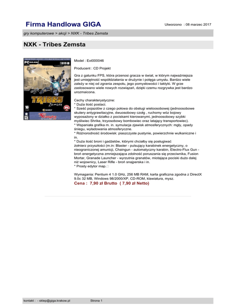 Firma Handlowa GIGA Utworzono : 08 marzec 2017 gry komputerowe > akcji > NXK - Tribes Zemsta NXK - Tribes Zemsta Model : Ext000046 Producent : CD Projekt Gra z gatunku FPS, która przenosi gracza w świat, w którym najważniejsza jest umiejętność współdziałania w drużynie i potęga umysłu. Bardzo wiele zależy w niej od zgrania zespołu, jego pomysłowości i taktyki. W grze zastosowano wiele nowych rozwiązań, dzięki czemu rozgrywka jest bardzo urozmaicona. Cechy charakterystyczne: * Duża ilość postaci. * Sześć pojazdów z czego połowa do obsługi wieloosobowej (jednoosobowe skutery antygrawitacyjne, dwuosobowy czołg , ruchomy wóz bojowy wyposażony w działko z pociskami kierowanymi, jednoosobowy szybki myśliwiec Shrike, trzyosobowy bombowiec oraz latający transportowiec). * Wspaniała grafika m. in. symulacja zjawisk atmosferycznych: mgły, opady śniegu, wyładowania atmosferyczne. * Różnorodność środowisk: piaszczyste pustynie, powierzchnie wulkaniczne i in. * Duża ilość broni i gadżetów, którymi chciałby się posługiwać żołnierz przyszłości (m.in: Blaster - pulsujący karabinek energetyczny, o nieograniczonej amunicji, Chaingun - automatyczny karabin, Electro-Flux Gun broń energetyczna zmniejszająca zdolność poruszania się przeciwnika, Fusion Mortar, Granade Launcher - wyrzutnia granatów, miotająca pociski dużo dalej niż wojownicy, Laser Rifle - broń snajperska i in. * Prosty edytor map.� Wymagania: Pentium 4 1.0 GHz, 256 MB RAM, karta graficzna zgodna z DirectX 9.0c 32 MB, Windows 98/2000/XP, CD-ROM, klawiatura, mysz. Cena : 7,90 zł Brutto ( 7,90 zł Netto) kontakt : - [email protected] Strona 1