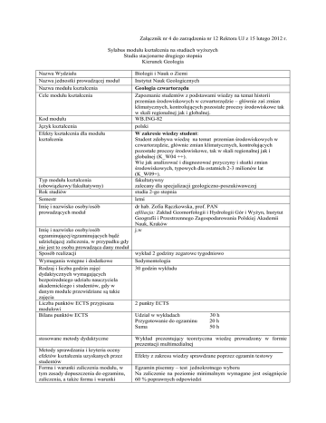 Załącznik nr 4 do zarządzenia nr 12 Rektora UJ z 15 lutego 2012 r. Sylabus modułu kształcenia na studiach wyższych Studia stacjonarne drugiego stopnia Kierunek Geologia Nazwa Wydziału Nazwa jednostki prowadzącej moduł Nazwa modułu kształcenia Cele modułu kształcenia Kod modułu Język kształcenia Efekty kształcenia dla modułu kształcenia Typ modułu kształcenia (obowiązkowy/fakultatywny) Rok studiów Semestr Imię i nazwisko osoby/osób prowadzących moduł Imię i nazwisko osoby/osób egzaminującej/egzaminujących bądź udzielającej zaliczenia, w przypadku gdy nie jest to osoba prowadząca dany moduł Sposób realizacji Biologii i Nauk o Ziemi Instytut Nauk Geologicznych Geologia czwartorzędu Zapoznanie studentów z podstawami wiedzy na temat historii przemian środowiskowych w czwartorzędzie – głównie zaś zmian klimatycznych, kontrolujących pozostałe procesy środowiskowe tak w skali regionalnej jak i globalnej. WB.ING-82 polski W zakresie wiedzy student: Student zdobywa wiedzę na temat przemian środowiskowych w czwartorzędzie, głównie zmian klimatycznych, kontrolujących pozostałe procesy środowiskowe, tak w skali regionalnej jak i globalnej (K_W04 ++). Wie jak analizować i diagnozować przyczyny i skutki zmian środowiskowych, typowych dla ostatnich 2-3 milionów lat (K_W09+). fakultatywny zalecany dla specjalizacji geologiczno-poszukiwawczej studia 2-go stopnia letni dr hab. Zofia Rączkowska, prof. PAN afiliacja: Zakład Geomorfologii i Hydrologii Gór i Wyżyn, Instytut Geografii i Przestrzennego Zagospodarowania Polskiej Akademii Nauk, Kraków j.w wykład 2 godziny zegarowe tygodniowo Wymagania wstępne i dodatkowe Rodzaj i liczba godzin zajęć dydaktycznych wymagających bezpośredniego udziału nauczyciela akademickiego i studentów, gdy w danym module przewidziane są takie zajęcia Liczba punktów ECTS przypisana modułowi Bilans punktów ECTS Sedymentologia 30 godzin wykładu stosowane metody dydaktyczne Wykład prezentujący teoretyczna wiedzę prowadzony w formie prezentacji multimedialnej Metody sprawdzania i kryteria oceny efektów kształcenia uzyskanych przez studentów Forma i warunki zaliczenia modułu, w tym zasady dopuszczenia do egzaminu, zaliczenia, a także forma i warunki 2 punkty ECTS Udział w wykładach Przygotowanie do egzaminu Suma 30 h 20 h 50 h Efekty z zakresu wiedzy sprawdzane poprzez egzamin testowy Egzamin pisemny – test jednokrotnego wyboru Na zaliczenie na poziomie minimalnym wymagane jest osiągnięcie 60 % poprawnych odpowiedzi zaliczenia poszczególnych zajęć wchodzących w zakres danego modułu Treści modułu kształcenia Wykaz literatury podstawowej i uzupełniającej, obowiązującej do zaliczenia danego modułu Wymiar, zasady i forma odbywania praktyk, w przypadku, gdy program kształcenia przewiduje praktyki Przedmiot obejmuje następujące zagadnienia: dolna granica czwartorzędu, rytm klimatyczny, historia badań, podział czwartorzędu; czwartorzęd Polski – historia badań, podział stratygraficzny, paleogeografia, zlodowacenia na obszarze Polski, holocen; metody badań - litostratygraficzne, biostratygraficzne i chronostratygraficzne; świat organiczny w czwartorzędzie; rekonstrukcje paleoklimatyczne; osady czwartorzędowe – klasyfikacja, podział; lodowce, lądolody – formy i osady; strefa peryglacjalna – ewolucja zmarzliny, środowisko stokowe, eoliczne, rzeczne; rola ekstremalnych zjawisk w sedymentacji i ewolucji rzeźby w czwartorzędzie. Literatura podstawowa: Lindner L. (red.), 1992, Czwartorzęd. Osady, metody badań, stratygrafia, Warszawa. Mojski J.E., 1993, Europa w plejstocenie. Ewolucja środowiska przyrodniczego, Warszawa. Mojski J. E., 2005, Ziemie polskie w czwartorzędzie PIG, Warszawa. Literatura uzupełniająca: Mojski J. E., (red.), 1984, Budowa geologiczna Polski t. I Stratygrafia, cz. 3 b. Kenozoik, Czwartorzęd, Wyd. Geologiczne. Starkel L., 1977, Paleogeografia holocenu, PWN. Mannion A. M. 2001. Zmiany środowiska Ziemi. Historia środowiska przyrodniczego i kulturowego. Wyd. Nauk. PWN, Warszawa.