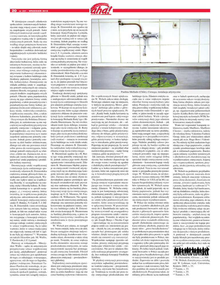 20 nr 221 - WRZESIEŃ 2015 W dzisiejszym czasach członkowie społeczeństw zorientowanych hedonistycznie mają więcej czasu i środków na zaspokajanie swych potrzeb. Autor Głównych kontrowersji estetyki współczesnej zauważa, że turystyka pełni wyjątkowo ważną rolę w spełnianiu estetycznych potrzeb. Stała się ona według niego potężnym biznesem – to także dzięki niej człowiek może bezpośrednio i osobiście doświadczać najpiękniejszych wytworów ludzkości i natury. Turystyka nie jest jedyną formą aktywności kulturowej, która stała się intratnym biznesem, można tu bowiem także wymienić zawody sportowe, oraz różnego rodzaju formy aktywności kulturowej i ekonomicznej związane z kultem ludzkiego ciała (konkursy piękności, kosmetyka, aerobik, kulturystyka). Zmniejszenie się wkładu ambitnej sztuki w zaspokajaniu potrzeb estetycznych nie oznacza, zdaniem filozofa, rezygnacji z artystycznych środków zaspokajania owych potrzeb. Obecnie sporą popularnością cieszą się jego zdaniem formy sztuki popularnej, a także pozaartystyczne i pseudoartystyczne formy kultury popularnej (twórczość reklamowa, pokazy mody, widowiska estradowe, współczesna muzyka, film, a także kolorowe kalendarze, pocztówki itd.) Oczywistym dla Bohdana Dziemidoka jest, że zorientowane są one najczęściej na najbardziej prymitywne potrzeby estetyczne i wulgarne gusta, stąd wątpliwości, czy owe formy sztuki popularnej i masowej są w stanie zaspokoić autentyczne potrzeby estetyczne. Jednak gusta i potrzeby estetyczne są dziś bardzo zróżnicowane, dlatego też nikt nie powinien rościć sobie prawa do rozstrzygania, które rodzaje potrzeb estetycznych są właściwe, a które nie. Zaznacza też, że estetyka jak i teoria kultury nie powinny ignorować sztuki popularnej i produktów kultury masowej. Deestetyzacja sztuki współczesnej i estetyzacja życia codziennego spowodowały zdaniem B. Dziemidoka częściową zmianę głównych form zaspokajania potrzeb estetycznych. Wywarły one wpływ także na współczesną filozofię, w szczególności na estetykę, etykę i filozofię kultury. B. Dziemidok komentuje to w sposób następujący: „(...) wszyscy autorzy, którzy twierdzą, że współczesna praktyka artystyczna zakwestionowała uniwersalność koncepcji estetycznej natury sztuki (T. Binkley, N. Carroll, T. J. Diffey, B. Dziemidok i inni) stwierdzają tym samym fakt tej zmiany. Sądzę jednak, że fakt ten znalazł także wyraz w koncepcjach tych autorów, którzy nie rezygnując z koncepcji estetycznej natury sztuki mówią o dominacji nowego rodzaju wartości estetycznych w sztuce współczesnej. Są to takie wartości, które w sztuce tradycyjnej nie odgrywały istotnej roli lub w ogóle nie były jej właściwe”13. Wymienia on takich filozofów jak: M. Wallis, T. Pawłowski, J. F. Lyotard. Pierwszy ze wskazanych – Mieczysław Wallis – sądzi, że antyestetyzm przypisywany sztuce współczesnej jest raczej „antykallizmem”, ponieważ sztuce tej właściwe jest upodobanie do tego, co odrażające, wstrząsające, agresywne, niż do tego co łagodne, piękne i wdzięczne. Natomiast Tadeusz Pawłowski wnioskuje, że pozytywne wartości dominujące w minionych epokach (piękno, wdzięk, symetria, umiar itd.) ustąpiły miejsca wartościom negatywnym. Są one według niego wartościami nowego rodzaju. B. Dziemidok nie zgadza się z nimi, za to przychyla się on raczej do koncepcji Jeana-Françoisa Lyotarda, który zauważył, że piękno nie odgrywa już tak ważnej roli w sztuce jak wcześniej. Jednak popełnia on według B. Dziemidoka błąd, uznając wzniosłość za główną i powszechną wartość estetyczną współczesnej sztuki. Hipoteza J. F. Lyotarda, zdaniem autora książki Sztuka, wartości, emocje, okazuje się mylna w zestawieniu ze współczesną praktyką artystyczną. Nie wszystko co uchodzi za piękne jest także i wzniosłe, w szczególności dlatego, że sztukę postmodernistyczną cechuje różnorodność. Hein Paetzold, a za nim B. Dziemidok twierdzą, że J. F. Lyotard zbyt pochopnie wysunął swą tezę, to, że piękno przestało być kluczowym pojęciem w sztuce postmodernistycznej, wcale nie oznacza, że jego miejsce zajęła wzniosłość. Tendencję deestetyzacji spotykamy głównie w filozofii sztuki, jednak teza o analogicznym odzwierciedleniu estetyzacji życia codziennego w filozofii jest zdaniem polskiego estetyka ryzykowna. Wskazuje on na pewne koncepcje etyczne, które są jego zdaniem częściowo zbliżone do procesów estetyzacji życia codziennego, wymienia tu koncepcję Richarda Rorty’ego i Richarda Shustermana. Są oni zwolennikami teorii życia dobrego, rozumianego jako życie estetyczne. R. Rorty wskazuje na potrzebę życia estetycznego, jako życia prywatnej doskonałości (private perfection) i autokreacji (self-creation) – oznacza to tworzenie życia ludzkiego na wzór dzieła sztuki. Prezentuje on zdaniem B. Dziemidoka radykalnie indywidualistyczną i elitarną wizję życia estetycznego. R. Shusterman zgadza się z R. Rorty’ego wizją potrzeby estetyzacji etyki, jednak zarzuca jego teorii zbytnie ograniczenie i nierealistyczność. Zdaniem R. Shustermana błędnie pojmuje on estetyczność i twórczość artystyczną (myli się on absolutyzując kategorię nowości jako główny wyznacznik). Zarzuca mu on także zbytni indywidualizm poprzez pominięcie społecznych uwarunkowań etyki prywatnej oraz nadmierną elitarność. R. Shusterman skłania się ku bardziej pluralistycznej wizji życia estetycznego, inspiruje się G. E. Moorem, M. Foucaultem i B. Williamsem. Nie ogranicza się ona do ustawicznej autokreacji, obejmuje ona natomiast potrzebę rozkoszowania się pięknem (natury, sztuki, czy ludzkiego ciała). B. Dziemidok uważa koncepcje R. Shustermana za bardziej pluralistyczną, a przez to bardziej rzeczywistą i możliwą do zrealizowania w życiu przeciętnego człowieka. W. Welsch jest