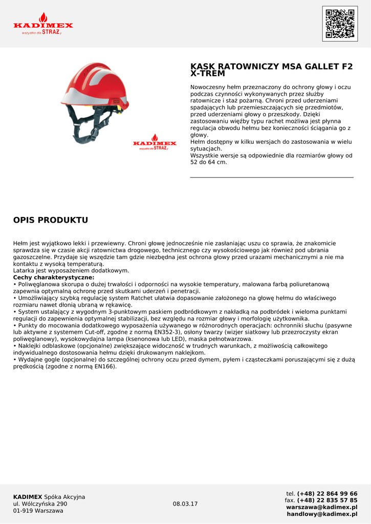 KASK RATOWNICZY MSA GALLET F2 X-TREM Nowoczesny hełm przeznaczony do ochrony głowy i oczu podczas czynności wykonywanych przez służby ratownicze i staż pożarną. Chroni przed uderzeniami spadających lub przemieszczających się przedmiotów, przed uderzeniami głowy o przeszkody. Dzięki zastosowaniu więźby typu rachet możliwa jest płynna regulacja obwodu hełmu bez konieczności ściągania go z głowy. Hełm dostępny w kilku wersjach do zastosowania w wielu sytuacjach. Wszystkie wersje są odpowiednie dla rozmiarów głowy od 52 do 64 cm. OPIS PRODUKTU Hełm jest wyjątkowo lekki i przewiewny. Chroni głowę jednocześnie nie zasłaniając uszu co sprawia, że znakomicie sprawdza się w czasie akcji ratownictwa drogowego, technicznego czy wysokościowego jak również pod ubrania gazoszczelne. Przydaje się wszędzie tam gdzie niezbędna jest ochrona głowy przed urazami mechanicznymi a nie ma kontaktu z wysoką temperaturą. Latarka jest wyposażeniem dodatkowym. Cechy charakterystyczne: • Poliwęglanowa skorupa o dużej trwałości i odporności na wysokie temperatury, malowana farbą poliuretanową zapewnia optymalną ochronę przed skutkami uderzeń i penetracji. • Umożliwiający szybką regulację system Ratchet ułatwia dopasowanie założonego na głowę hełmu do właściwego rozmiaru nawet dłonią ubraną w rękawicę. • System ustalający z wygodnym 3-punktowym paskiem podbródkowym z nakładką na podbródek i wieloma punktami regulacji do zapewnienia optymalnej stabilizacji, bez względu na rozmiar głowy i morfologię użytkownika. • Punkty do mocowania dodatkowego wyposażenia używanego w różnorodnych operacjach: ochronniki słuchu (pasywne lub aktywne z systemem Cut-off, zgodne z normą EN352-3), osłony twarzy (wizjer siatkowy lub przezroczysty ekran poliwęglanowy), wysokowydajna lampa (ksenonowa lub LED), maska pełnotwarzowa. • Naklejki odblaskowe (opcjonalne) zwiększające widoczność w trudnych warunkach, z możliwością całkowitego indywidualnego dostosowania hełmu dzięki drukowanym naklejkom. • Wydajne gogle (opcjonalne) do szczególnej ochrony oczu przed dymem, pyłem i cząsteczkami poruszającymi się z dużą prędkością (zgodne z normą EN166). KADIMEX Spóka Akcyjna ul. Wólczyńska 290 01-919 Warszawa 08.03.17 tel. (+48) 22 864 99 66 fax. (+48) 22 835 57 85 [email protected] [email protected]