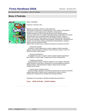 Firma Handlowa GIGA Utworzono : 08 marzec 2017 gry komputerowe > symulatory > Sims 2 Podróże Sims 2 Podróże Model : Ele000082 Producent : Electronic Arts Egzotyczne podróże z Simami w rolach głównych! Wyrwij swoich ulubieńców z codziennej rutyny i weź udział w ekscytujących przygodach w trzech egzotycznych zakątkach naszego globu! Oficjalny dodatek The Sims 2 Podróże proponuje trzy warianty zabawy: luksusowy apartament na rozległej, tropikalnej wyspie, biwakowanie na szczycie dziewiczej góry oraz poznawanie kultury Dalekiego Wschodu. Wizyta w każdym z tych trzech miejsc będzie nie tylko świetną okazją do odpoczynku, lecz przede wszystkim niezapomnianą przygodą. Obserwuj jak z niewydarzonych turystów Twoi milusińscy stają się prawdziwymi obieżyświatami, znającymi lokalne obyczaje, powitania i tańce... Zabierz Simy w podróż życia i zaimponuj znajomym po powrocie do domu! � Wymarzone podróże W każdym z trzech egzotycznych miejsc czekają na Ciebie wspaniałe pejzaże i niezwykli tubylcy, od których można wiele się nauczyć, w tym m.in. poznać kuchnię i kulturę regionu. � Wycieczki fakultatywne Przyglądanie się życiu w oceanie i pełen przygód przejazd furgonetką to tylko niektóre z nowych zajęć. Przygotuj się na same niespodzianki! � Wyjątkowe przedmioty Kupuj prawdziwe unikaty, dostępne wyłącznie w tym dodatku. Niezwykle rzadka biżuteria to tylko jedna z propozycji na cenną pamiątkę lub prezent z dalekiej podróży. Odkrywaj tajemne miejsca, zbieraj muszle na plaży i wykopuj cenne skarby... � Podaruj Simom odrobinę luksusu Zaszalej wydając pieniądze na komfortowy apartament lub wybierz kameralne miejsce wypoczynku. Zabierz swoich ulubieńców do centrum odnowy biologicznej i rozpieszczaj ich profesjonalną obsługą hotelową. Wymagania: Gra wymaga do działania podstawowej wersji Sims 2. Cena : 49,90 zł Brutto ( 49,90 zł Netto) kontakt : - [email protected] Strona 1
