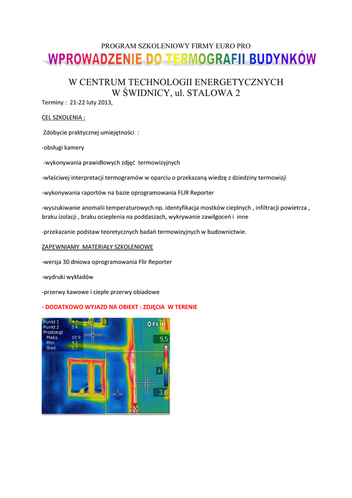 PROGRAM SZKOLENIOWY FIRMY EURO PRO W CENTRUM TECHNOLOGII ENERGETYCZNYCH W ŚWIDNICY, ul. STALOWA 2 Terminy : 21-22 luty 2013, CEL SZKOLENIA : Zdobycie praktycznej umiejętności : -obsługi kamery -wykonywania prawidłowych zdjęć termowizyjnych -właściwej interpretacji termogramów w oparciu o przekazaną wiedzę z dziedziny termowizji -wykonywania raportów na bazie oprogramowania FLIR Reporter -wyszukiwanie anomalii temperaturowych np. identyfikacja mostków cieplnych , infiltracji powietrza , braku izolacji , braku ocieplenia na poddaszach, wykrywanie zawilgoceń i inne -przekazanie podstaw teoretycznych badań termowizyjnych w budownictwie. ZAPEWNIAMY MATERIAŁY SZKOLENIOWE -wersja 30 dniowa oprogramowania Flir Reporter -wydruki wykładów -przerwy kawowe i ciepłe przerwy obiadowe - DODATKOWO WYJAZD NA OBIEKT : ZDJĘCIA W TERENIE PROGRAM SZKOLENIA : I Dzień . Godz. 8:30 Rejestracja uczestników 9 :00 Początek szkolenia. I Część - ( 1 h) 1. Czym jest termografia ? 2. Obraz termowizyjny 3. Termografia a światło widzialne. 4. Emisja i odbicie. 5. Prawa promieniowania podczerwonego. II Część podstawowe parametry techniczne kamery termowizyjnej ( 1 h ) 1. Omówienie, przykłady zdjęcia tego samego obiektu w różnej rozdzielczości. 2. Jak dobrać parametry pomiaru dla optymalizacji wyników. Zajęcia praktyczne . 2.1 Ostrość ustawienie automatyczne i ręczne (Auto & Manual Mode) 2..2. Właściwa kompozycja zdjęcia 2.3. Zakres temperaturowy, ustawienia . 2.4. Ustawienia emisyjności. 2.5. Ustawienia temperatury odbitej. 2.6. Tabela emisyjności. III Część Zaawansowane funkcje kamery termowizyjnej ( 1,5 h ) 1. Narzędzia , punkt pomiarowy, obszar , min. I max . temperatura, izoterma. 2. Funkcja Pi P. 3. Fuzja termiczna. 4. Temperatura odniesienia. 5. Pomiary praktyczne. IV Cześc. Zastosowanie pomiarów termowizyjnych-przykłady ( 1h ). 1. Budownictwo 2. Energetyka, sieci NN i sieci WN. 3. Diagnostyka transformatorów, silników 4. Elektronika 5. Kontrola jakości V Cześc (0,5 h ) 1. Właściwości materiałów. 2. Zjawiska wpływające na jakość pomiarów. WYKŁADY GODZ 9 :00-15:00. PRZERWA KAWOWA I 10:30-10:45 OBIAD 12: 45-13:15 PRZERWA KAWOWA II 14:00-14:15. II Dzień Początek godz. 9:00. I Cześć ( 4 godz.) 1. Podstawy przepływu ciepła. 2. Przepływ promienisty. 3.Definicja struktury budynku. 4.Ważne parametry fizyczne , które należy znać. 5.Trzy główne kategorie błędów. 6.Rozkłady temperatury , które nie są błędami. 7.Rozkłady temperatury , które nie są błędami. 8.Krótki przewodnik po zastosowaniach. II Część ( 1 h) 3. Wykonywanie termogramów w terenie . Część III (2 godz.) 1. Opracowanie raportu termowizyjnego. Pytania i odpowiedzi. Wręczenie certyfikatów. PRZEWIDYWANE ZAKOŃCZENIE ok. GODZ 16:00. Organizator zastrzega sobie prawo do zmiany kolejności i czasu przeznaczonego na realizację poszczególnych części programu szkoleniowego w zależności od potrzeb uczestników kursu !!!
