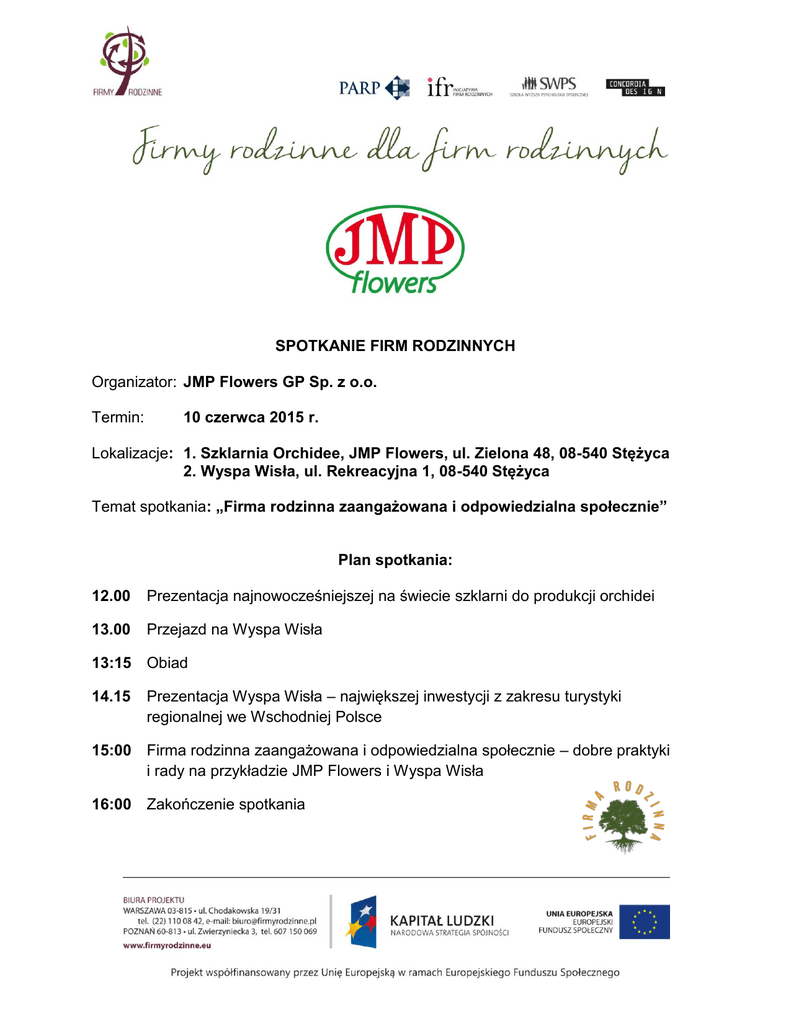 SPOTKANIE FIRM RODZINNYCH Organizator: JMP Flowers GP Sp. z o.o. Termin: 10 czerwca 2015 r. Lokalizacje: 1. Szklarnia Orchidee, JMP Flowers, ul. Zielona 48, 08-540 Stężyca 2. Wyspa Wisła, ul. Rekreacyjna 1, 08-540 Stężyca Temat spotkania: „Firma rodzinna zaangażowana i odpowiedzialna społecznie” Plan spotkania: 12.00 Prezentacja najnowocześniejszej na świecie szklarni do produkcji orchidei 13.00 Przejazd na Wyspa Wisła 13:15 Obiad 14.15 Prezentacja Wyspa Wisła – największej inwestycji z zakresu turystyki regionalnej we Wschodniej Polsce 15:00 Firma rodzinna zaangażowana i odpowiedzialna społecznie – dobre praktyki i rady na przykładzie JMP Flowers i Wyspa Wisła 16:00 Zakończenie spotkania