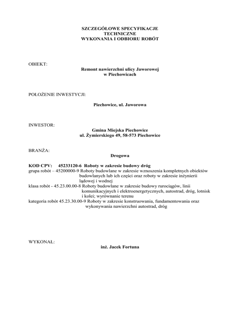 SZCZEGÓŁOWE SPECYFIKACJE TECHNICZNE WYKONANIA I ODBIORU ROBÓT OBIEKT: Remont nawierzchni ulicy Jaworowej w Piechowicach POŁOśENIE INWESTYCJI: Piechowice, ul. Jaworowa INWESTOR: Gmina Miejska Piechowice ul. śymierskiego 49, 58-573 Piechowice BRANśA: Drogowa KOD CPV: 45233120-6 Roboty w zakresie budowy dróg grupa robót – 45200000-9 Roboty budowlane w zakresie wznoszenia kompletnych obiektów budowlanych lub ich części oraz roboty w zakresie inŜynierii lądowej i wodnej klasa robót - 45.23.00.00-8 Roboty budowlane w zakresie budowy rurociągów, linii komunikacyjnych i elektroenergetycznych, autostrad, dróg, lotnisk i kolei; wyrównanie terenu kategoria robót 45.23.30.00-9 Roboty w zakresie konstruowania, fundamentowania oraz wykonywania nawierzchni autostrad, dróg WYKONAŁ: inŜ. Jacek Fortuna