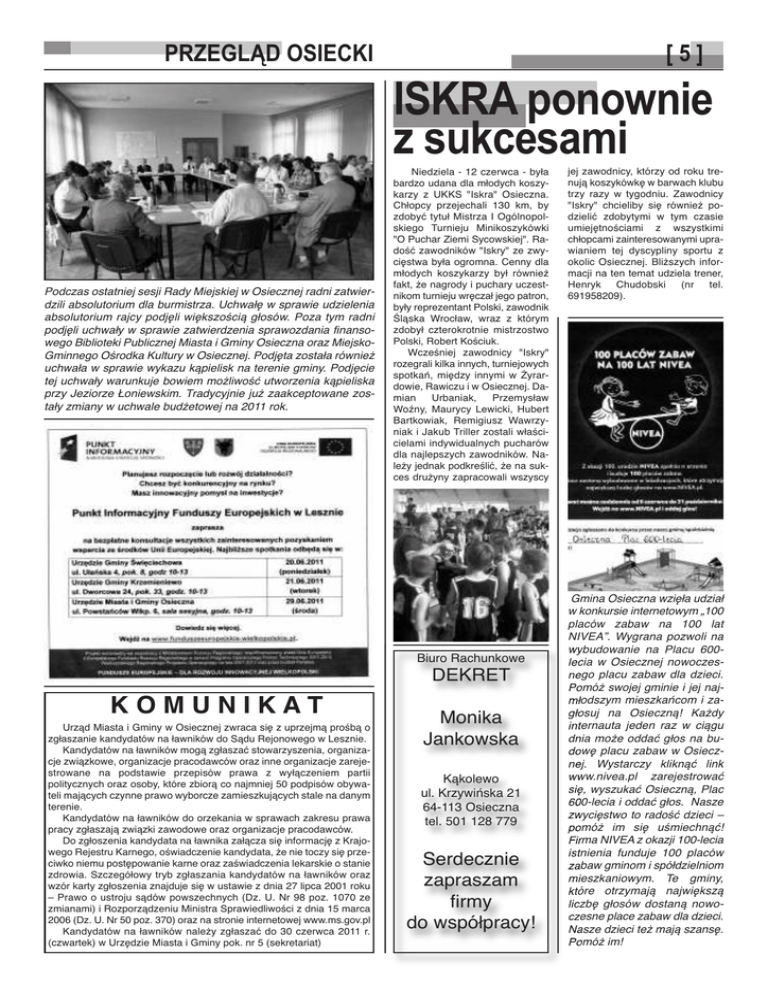 PRZEGLĄD OSIECKI Podczas ostatniej sesji Rady Miejskiej w Osiecznej radni zatwierdzili absolutorium dla burmistrza. Uchwałę w sprawie udzielenia absolutorium rajcy podjęli większością głosów. Poza tym radni podjęli uchwały w sprawie zatwierdzenia sprawozdania finansowego Biblioteki Publicznej Miasta i Gminy Osieczna oraz MiejskoGminnego Ośrodka Kultury w Osiecznej. Podjęta została również uchwała w sprawie wykazu kąpielisk na terenie gminy. Podjęcie tej uchwały warunkuje bowiem możliwość utworzenia kąpieliska przy Jeziorze Łoniewskim. Tradycyjnie już zaakceptowane zostały zmiany w uchwale budżetowej na 2011 rok. [5] ISKRA ponownie z sukcesami Niedziela - 12 czerwca - była bardzo udana dla młodych koszykarzy z UKKS "Iskra" Osieczna. Chłopcy przejechali 130 km, by zdobyć tytuł Mistrza I Ogólnopolskiego Turnieju Minikoszykówki "O Puchar Ziemi Sycowskiej". Radość zawodników "Iskry" ze zwycięstwa była ogromna. Cenny dla młodych koszykarzy był również fakt, że nagrody i puchary uczestnikom turnieju wręczał jego patron, były reprezentant Polski, zawodnik Śląska Wrocław, wraz z którym zdobył czterokrotnie mistrzostwo Polski, Robert Kościuk. Wcześniej zawodnicy "Iskry" rozegrali kilka innych, turniejowych spotkań, między innymi w Żyrardowie, Rawiczu i w Osiecznej. Damian Urbaniak, Przemysław Woźny, Maurycy Lewicki, Hubert Bartkowiak, Remigiusz Wawrzyniak i Jakub Triller zostali właścicielami indywidualnych pucharów dla najlepszych zawodników. Należy jednak podkreślić, że na sukces drużyny zapracowali wszyscy Biuro Rachunkowe KOMUNIKAT Urząd Miasta i Gminy w Osiecznej zwraca się z uprzejmą prośbą o zgłaszanie kandydatów na ławników do Sądu Rejonowego w Lesznie. Kandydatów na ławników mogą zgłaszać stowarzyszenia, organizacje związkowe, organizacje pracodawców oraz inne organizacje zarejestrowane na podstawie przepisów prawa z wyłączeniem partii politycznych oraz osoby, które zbiorą co najmniej 50 podpisów obywateli mających czynne prawo wyborcze zamieszkujących stale na danym terenie. Kandydatów na ławników do orzekania w sprawach zakresu prawa pracy zgłaszają związki zawodowe oraz organizacje pracodawców. Do zgłoszenia kandydata na ławnika załącza się informację z Krajowego Rejestru Karnego, oświadczenie kandydata, że nie toczy się przeciwko niemu postępowanie karne oraz zaświadczenia lekarskie o stanie zdrowia. Szczegółowy tryb zgłaszania kandydatów na ławników oraz wzór karty zgłoszenia znajduje się w ustawie z dnia 27 lipca 2001 roku – Prawo o ustroju sądów powszechnych (Dz. U. Nr 98 poz. 1070 ze zmianami) i Rozporządzeniu Ministra Sprawiedliwości z dnia 15 marca 2006 (Dz. U. Nr 50 poz. 370) oraz na stronie internetowej www.ms.gov.pl Kandydatów na ławników należy zgłaszać do 30 czerwca 2011 r. (czwartek) w Urzędzie Miasta i Gminy pok. nr 5 (sekretariat) DEKRET Monika Jankowska Kąkolewo ul. Krzywińska 21 64-113 Osieczna tel. 501 128 779 Serdecznie zapraszam firmy do współpracy! jej zawodnicy, którzy od roku trenują koszykówkę w barwach klubu trzy razy w tygodniu. Zawodnicy "Iskry" chcieliby się również podzielić zdobytymi w tym czasie umiejętnościami z wszystkimi chłopcami zainteresowanymi uprawianiem tej dyscypliny sportu z okolic Osiecznej. Bliższych informacji na ten temat udziela trener, Henryk Chudobski (nr tel. 691958209). Gmina Osieczna wzięła udział w konkursie internetowym „100 placów zabaw na 100 lat NIVEA”. Wygrana pozwoli na wybudowanie na Placu 600lecia w Osiecznej nowoczesnego placu zabaw dla dzieci. Pomóż swojej gminie i jej najmłodszym mieszkańcom i zagłosuj na Osieczną! Każdy internauta jeden raz w ciągu dnia może oddać głos na budowę placu zabaw w Osiecznej. Wystarczy kliknąć link www.nivea.pl zarejestrować się, wyszukać Osieczną, Plac 600-lecia i oddać głos. Nasze zwycięstwo to radość dzieci – pomóż im się uśmiechnąć! Firma NIVEA z okazji 100-lecia istnienia funduje 100 placów zabaw gminom i spółdzielniom mieszkaniowym. Te gminy, które otrzymają największą liczbę głosów dostaną nowoczesne place zabaw dla dzieci. Nasze dzieci też mają szansę. Pomóż im!