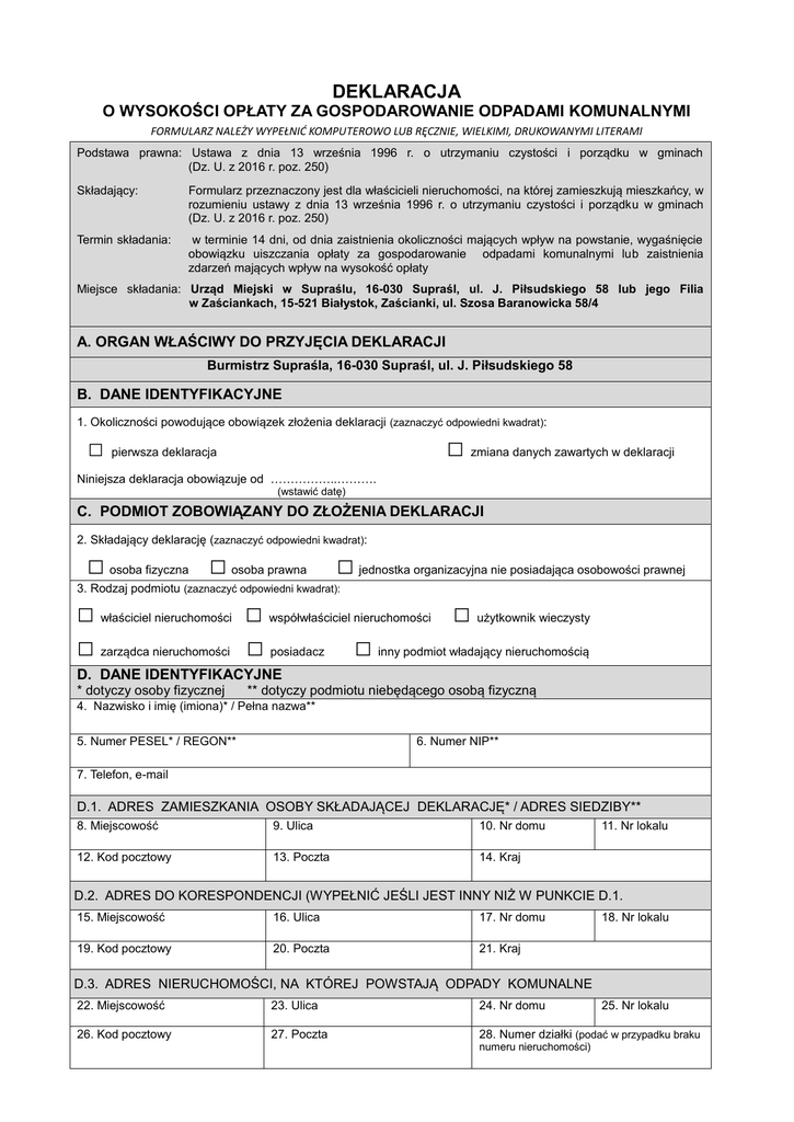 DEKLARACJA O WYSOKOŚCI OPŁATY ZA GOSPODAROWANIE ODPADAMI KOMUNALNYMI FORMULARZ NALEŻY WYPEŁNIĆ KOMPUTEROWO LUB RĘCZNIE, WIELKIMI, DRUKOWANYMI LITERAMI Podstawa prawna: Ustawa z dnia 13 września 1996 r. o utrzymaniu czystości i porządku w gminach (Dz. U. z 2016 r. poz. 250) Składający: Formularz przeznaczony jest dla właścicieli nieruchomości, na której zamieszkują mieszkańcy, w rozumieniu ustawy z dnia 13 września 1996 r. o utrzymaniu czystości i porządku w gminach (Dz. U. z 2016 r. poz. 250) Termin składania: w terminie 14 dni, od dnia zaistnienia okoliczności mających wpływ na powstanie, wygaśnięcie obowiązku uiszczania opłaty za gospodarowanie odpadami komunalnymi lub zaistnienia zdarzeń mających wpływ na wysokość opłaty Miejsce składania: Urząd Miejski w Supraślu, 16-030 Supraśl, ul. J. Piłsudskiego 58 lub jego Filia w Zaściankach, 15-521 Białystok, Zaścianki, ul. Szosa Baranowicka 58/4 A. ORGAN WŁAŚCIWY DO PRZYJĘCIA DEKLARACJI Burmistrz Supraśla, 16-030 Supraśl, ul. J. Piłsudskiego 58 B. DANE IDENTYFIKACYJNE 1. Okoliczności powodujące obowiązek złożenia deklaracji (zaznaczyć odpowiedni kwadrat): □ zmiana danych zawartych w deklaracji □ pierwsza deklaracja Niniejsza deklaracja obowiązuje od ……………..………. (wstawić datę) C. PODMIOT ZOBOWIĄZANY DO ZŁOŻENIA DEKLARACJI 2. Składający deklarację (zaznaczyć odpowiedni kwadrat): □ osoba fizyczna □ osoba prawna □ jednostka organizacyjna nie posiadająca osobowości prawnej 3. Rodzaj podmiotu (zaznaczyć odpowiedni kwadrat): □ właściciel nieruchomości □ współwłaściciel nieruchomości □ użytkownik wieczysty □ zarządca nieruchomości □ posiadacz □ inny podmiot władający nieruchomością D. DANE IDENTYFIKACYJNE * dotyczy osoby fizycznej ** dotyczy podmiotu niebędącego osobą fizyczną 4. Nazwisko i imię (imiona)* / Pełna nazwa** 5. Numer PESEL* / REGON** 6. Numer NIP** 7. Telefon, e-mail D.1. ADRES ZAMIESZKANIA OSOBY SKŁADAJĄCEJ DEKLARACJĘ* / ADRES SIEDZIBY** 8. Miejscowość 9. Ulica 10. Nr domu 12. Kod pocztowy 13. Poczta 14. Kraj 11. Nr lokalu D.2. ADRES DO KORESPONDENCJI (WYPEŁNIĆ JEŚLI JEST INNY NIŻ W PUNKCIE D.1. 15. Miejscowość 16. Ulica 17. Nr domu 19. Kod pocztowy 20. Poczta 21. Kraj 18. Nr lokalu D.3. ADRES NIERUCHOMOŚCI, NA KTÓREJ POWSTAJĄ ODPADY KOMUNALNE 22. Miejscowość 23. Ulica 24. Nr domu 26. Kod pocztowy 27. Poczta 28. Numer działki (podać w przypadku braku numeru nieruchomości) 25. Nr lokalu E. OPŁATA ZA GOSPODAROWANIE ODPADAMI KOMUNALNYMI E.1. OŚWIADCZENIE O SPOSOBIE GROMADZENIA ODPADÓW. Oświadczam, że na terenie nieruchomości wskazanej w części D.3 niniejszej deklaracji zagospodarowuję odpady w sposób (zaznaczyć odpowiedni kwadrat): □ selektywny □ nieselektywny E.2. WYLICZENIE OPŁATY OD NIERUCHOMOŚCI, NA KTÓRYCH ZAMIESZKUJĄ MIESZKAŃCY Rodzaj gospodarstwa domowego 1 osobowe 2 osobowe 3 osobowe 4 osobowe 5 i więcej osobowe Liczba gospodarstw na nieruchomości, których deklaracja dotyczy 29. 34. 39. 30. 35. 40. 31. 36. 41. 32. 37. 42. 33. 38. 43. Stawka opłaty [zł/mc.] Kwota opłaty [zł/mc.] 44. Kwota opłaty miesięcznej (suma z pozycji: 39, 40, 41, 42 i 43) Uwagi ……………………………………….……………………………………………………………………………………...… ………………………………………………………………………………………………………………………………………… ………………………………………………………………………………………………………………………………………… F. OŚWIADCZENIE I PODPIS SKŁADAJĄCEGO DEKLARACJĘ Oświadczam, że dane zawarte w niniejszej deklaracji są zgodne ze stanem faktycznym. ……………………………………… (miejscowość i data) …………………..……………….. (czytelny podpis) G. ADNOTACJE ORGANU POUCZENIE: 1) 2) 3) 4) 5) 6) 7) Niniejsza deklaracja stanowi podstawę do wystawienia tytułu wykonawczego, zgodnie z przepisami ustawy z dnia 17 czerwca 1966 r. o postępowaniu egzekucyjnym w administracji (Dz. U. z 2016 r., poz.599 z późn. zm.). Obowiązek złożenia do Burmistrza Supraśla deklaracji o wysokości opłaty za gospodarowanie odpadami komunalnymi powstaje w terminie 14 dni od dnia zamieszkania na danej nieruchomości pierwszego mieszkańca. W przypadku zmiany danych będących podstawą ustalenia wysokości należnej opłaty za gospodarowanie odpadami komunalnymi należy złożyć nową deklarację do Burmistrza Supraśla w terminie 14 dni od dnia nastąpienia zmiany. Opłatę za gospodarowanie odpadami komunalnymi w zmienionej wysokości uiszcza się za miesiąc, w którym nastąpiła zmiana. W przypadku, gdy w danym miesiącu na danej nieruchomości mieszkaniec zamieszkuje przez część miesiąca, opłatę za gospodarowanie odpadami komunalnymi w miesiącu, w którym nastąpiła zmiana, uiszcza się w gminie, w której dotychczas zamieszkiwał, a w nowym miejscu zamieszkania – począwszy od miesiąca następnego, po którym nastąpiła zmiana. W razie niezłożenia deklaracji o wysokości opłaty za gospodarowanie odpadami komunalnymi albo uzasadnionych wątpliwości co do danych zawartych w deklaracji Burmistrz Supraśla określi, w drodze decyzji, wysokość opłaty za gospodarowanie odpadami komunalnymi, biorąc pod uwagę dostępne dane właściwe dla wybranej przez Radę Miejską w Supraślu metody, a w przypadku ich braku - uzasadnione szacunki. Niniejszą deklarację należy złożyć w siedzibie Urzędu Miejskiego w Supraślu, ul. Piłsudskiego 58, 16-030 Supraśl lub w jego Filii Miejskiego w Zaściankach, 15-521 Białystok, Zaścianki, ul. Szosa Baranowicka 58/4, lub przesłać drogą pocztową na wskazany adres bądź też za pośrednictwem środków komunikacji elektronicznej. OBJAŚNIENIA: Zgodnie z art. 6j ust. 4a ustawy z dnia 13 września
