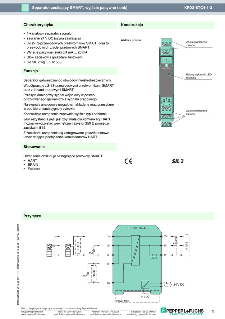 Separator zasilający SMART, wyjście pasywne (sink) KFD2-STC4-1-3 Konstrukcja Charakterystyka • 1-kanałowy separator sygnału • zasilanie 24 V DC (szyna zasilająca) • Do 2- i 3-przewodowych przetworników SMART oraz 2przewodowych źródeł prądowych SMART • Wyjście pasywne (sink) 0/4 mA ... 20 mA • Bloki zacisków z gniazdami testowymi • Do SIL 2 wg IEC 61508 Widok z przodu Zaciski rozłączne zielone 1 2 4 5 3 6 KFD2-STC4-1-3 Funkcja Zielony wskaźnik LED: zasilanie PWR Separator galwaniczny do obwodów nieiskrobezpiecznych. Współpracuje z 2- i 3-przewodowymi przetwornikami SMART oraz źródłami prądowymi SMART. Przesyła analogowy sygnał wejściowy w postaci odizolowanego galwanicznie sygnału prądowego. 7 8 9 10 11 12 13 14 15 Na sygnały analogowe mogą być nakładane oraz przesyłane w obu kierunkach sygnały cyfrowe. Zaciski rozłączne zielone Konstrukcja urządzenia zapewnia wyjście typu odbiornik. Jeśli rezystancja pętli jest zbyt mała dla komunikacji HART, można wykorzystać wewnętrzny rezystor 250 Ω pomiędzy zaciskami 8 i 9. Z zaciskami urządzenia są zintegrowane gniazda testowe umożliwiające podłączenie komunikatorów HART. Stosowanie Urządzenie obsługuje następujące protokoły SMART: • HART • BRAIN • Foxboro 2 mA 1+ 7+ 2- 8- 3 250 Ω V HART HART KFD2-STC4-1-3 9 5- mA HART Data publikacji 2016-08-08 11:11 Data wydania 2016-08-08 228737_pol.xml Przyłącze 6+ 14+ 15- 24 V DC 24 V DC Power Rail Patrz „Uwagi ogólne dotyczące informacji o produktach firmy Pepperl+Fuchs”. Grupa Pepperl+Fuchs USA: +1 330 486 0002 Niemcy: +49 621 776 2222 www.pepperl-fuchs.com [email protected] [email protected] Singapur: +65 6779 9091 [email protected] 1 Dane techniczne KFD2-STC4-1-3 Dane ogólne typ sygnału Wejżcie analogowe Zasilanie Przyłącze Napięcie znamionowe tętnienie prądu szyna zasilająca lub zaciski 14+, 15Un 20 ... 35 V DC w granicach tolerancji zasilania Strata mocy 1,4 W Pobór mocy 1,8 W wejście Przyłącze zaciski 1+, 2-, 3 lub 5-, 6+ sygnał wejściowy 0/4 ... 20 mA spadek napięcia ≤ 2,4 V przy 20 mA (zaciski 5, 6) oporność wejściowa ≤ 64 Ω zaciski 2-, 3 ; ≤ 500 Ω zaciski 1+, 3 (obciążenie 250 Ω) Dostępne napięcie ≥ 16 V przy 20 mA zaciski 1+, 3 Wyjście Przyłącze zaciski 7+, 8-; 10+, 11- Sygnał wyjżciowy 0/4 ... 20 mA (przeciążenie > 25 mA) tętnienie prądu ≤ 50 µA eff Zasilanie zewnętrzne (pętla) 11 ... 30 V DC właściwości transmisji odchylenie Wpływ temperatury otoczenia zakres częstotliwości przy temperaturze 20°C (68 °F), 0/4 ... 20 mA ≤ 10 µ A, obejmując kalibrację, liniowość, histerezę, obciążenia, wahania napięcia zasilania 0,25 µA/K wejście do wyjścia: pasmo przenoszenia dla sygnału 0,5 Vpp 0 ... 7,5 kHz (-3 dB) wyjście do wejścia: pasmo przenoszenia dla sygnału 0,5 Vpp 0,3 ... 7,5 kHz (-3 dB) czas ustalania się 200 µs Czas narastania/zanikania 20 µs Izolacja elektryczna wejście / wyjście wejście / zasilanie Wyjżcie / zasilanie izolacja podstawowa zgodna z IEC 61010-1, napięcie znamionowe izolacji 300 Veff izolacja podstawowa zgodna z IEC 61010-1, napięcie znamionowe izolacji 300 Veff izolacja robocza, napięcie znamionowe izolacji 50 V AC Zgodność z dyrektywami Kompatybilność elektromagnetyczna Dyrektywa 2014/30/UE EN 61326-1:2013 (lokalizacja ośrodków przemysłowych) Zgodnożć Kompatybilność elektromagnetyczna NE 21:2011 Stopień ochrony IEC 60529:2001 zabezpieczenie przed porażeniem elektrycznym EN 61010-1:2010 Warunki otoczenia Temperatura otoczenia -20 ... 60 °C (-4 ... 140 °F) Specyfikacja mechaniczna Stopień ochrony IP 20 Masa ok. 200 g Wymiary 20 × 124 × 115 mm , typ obudowy B2 Montaż montaż na szynie znormalizowanej 35 mm wg EN 60715:2001 Informacja uzupełniająca Stosownie do wymagań należy przestrzegać informacji na temat zgodności, deklaracji zgodności, atestów zgodności i instrukcji. Aby uzyskać więcej informacji, zob. www.pepperl-fuchs.com. Data publikacji 2016-08-08 11:11 Data wydania 2016-08-08 228737_pol.xml Informacje ogólne Patrz „Uwagi ogólne dotyczące informacji o produktach firmy Pepperl+Fuchs”. Grupa Pepperl+Fuchs USA: +1 330 486 0002 Niemcy: +49 621 776 2222 www.pepperl-fuchs.com [email protected] [email protected] Singapur: +65 6779 9091 [email protected] 2 Dane techniczne KFD2-STC4-1-3 Akcesoria Moduł dostarczania prądu stałego KFD2-EB2 Ten moduł dostarczania prądu stałego jest wykorzystywany do łączenia urządzeń 24 V DC za pomocą szyny zasilania. Wyposażony w bezpiecznik moduł dostarczania prądu stałego może obsługiwać do 150 pojedynczych urządzeń, w zależności od poziomu zużycia energii przez poszczególne urządzenia. Styki mechaniczne z galwaniczną izolacją używają szyny zasilania do przekazywania zebranych komunikatów błędów. Szyna zasilania UPR-03 (Power Rail) Szyna zasilania UPR-03 to kompletna jednostka składająca się z gniazd elektrycznych i szyny profilu aluminiowego o wymiarach 35 mm x 15 mm. Aby działała, wystarczy po prostu podłączyć urządzenia. Szyna profilowa K-DUCT z szyną zasilania Szyna profilowa K-DUCT to profil aluminiowy z umieszczoną w nim szyną zasilania i dwoma zintegrowanymi kanałami kablowymi do kabli systemowych i połączeniowych. Zestaw ten nie wymaga zatem użycia żadnych dodatkowych kabli. Data publikacji 2016-08-08 11:11 Data wydania 2016-08-08 228737_pol.xml Szyna zasilania i szyna profilowa nie musz¹ byæ pod³¹czone za pomoc¹ zacisków do poszczególnych urz¹dzeñ! Patrz „Uwagi ogólne dotyczące informacji o produktach firmy Pepperl+Fuchs”. Grupa Pepperl+Fuchs USA: +1 330 486 0002 Niemcy: +49 621 776 2222 www.pepperl-fuchs.com [email protected] [email protected] Singapur: +65 6779 9091 [email protected] 3