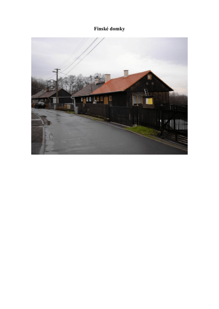 Finské domky Finské domky Na konci 40. let 20. století vznikaly jako provizorní řešení dělnického bydlení tzv. finské domky. Jednalo se o typizovaný projekt dřevěného jednopodlažního dvojdomku obklopeného zahradou, který byl v OKR značně rozšířen. Životnost těchto domů byla původně odhadnuta na 30 let, ale drtivá většina z nich stojí dodnes a slouží k obytným účelům. Na obrázku je finský domek u Lhotky. Domki fińskie Na końcu lat 40-tych 20 wieku powstawały jako prowizorium mieszkań robotniczych tzw. domki fińskie. Chodziło o standardowy projekt drewnianego piętrowego domku bliźniaczego z ogródkiem. Żywotność tych domów była pierwotnie 30 lat, ale większość z nich stoi do dziś i spełnia funkcję mieszkaniową. Na zdjęciu jest fiński domek przy Ligotce.