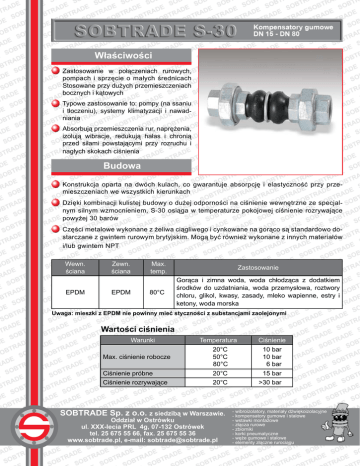 Właściwości Zastosowanie w połączeniach rurowych, pompach i sprzęcie o małych średnicach Stosowane przy dużych przemieszczeniach bocznych i kątowych Typowe zastosowanie to: pompy (na ssaniu i tłoczeniu), systemy klimatyzacji i nawadniania Absorbują przemieszczenia rur, naprężenia, izolują wibracje, redukują hałas i chronią przed siłami powstającymi przy rozruchu i nagłych skokach ciśnienia Budowa Konstrukcja oparta na dwóch kulach, co gwarantuje absorpcję i elastyczność przy przemieszczeniach we wszystkich kierunkach Dzięki kombinacji kulistej budowy o dużej odporności na ciśnienie wewnętrzne ze specjalnym silnym wzmocnieniem, S-30 osiąga w temperaturze pokojowej ciśnienie rozrywające powyżej 30 barów Części metalowe wykonane z żeliwa ciągliwego i cynkowane na gorąco są standardowo dostarczane z gwintem rurowym brytyjskim. Mogą być również wykonane z innych materiałów i/lub gwintem NPT Wewn. ściana EPDM Zewn. ściana EPDM Max. temp. Zastosowanie 80°C Gorąca i zimna woda, woda chłodząca z dodatkiem środków do uzdatniania, woda przemysłowa, roztwory chloru, glikol, kwasy, zasady, mleko wapienne, estry i ketony, woda morska Uwaga: mieszki z EPDM nie powinny mieć styczności z substancjami zaolejonymi Wartości ciśnienia Warunki Temperatura Ciśnienie Max. ciśnienie robocze 20°C 50°C 80°C 10 bar 10 bar 6 bar Ciśnienie próbne Ciśnienie rozrywające 20°C 20°C 15 bar >30 bar SOBTRADE Sp. z o.o. z siedzibą w Warszawie. Oddział w Ostrówku ul. XXX-lecia PRL 4g, 07-132 Ostrówek tel. 25 675 55 66, fax. 25 675 55 36 www.sobtrade.pl, e-mail: [email protected] - wibroizolatory, materiały dźwiękoizolacyjne - kompensatory gumowe i stalowe - wstawki montażowe - złącza rurowe - zbiorniki - korki pneumatyczne - węże gumowe i stalowe - elementy złączne rurociągu Stalowy pierścień wzmacniający Rodzaje końcówek Gwint Przyłącza wykonane są z żeliwa ciągliwego, cynkowane ogniowo. Dostępne również ze stali nierdzewnej AISI 304 (1.4301) Brytyjski BSP lub amerykański NPT Kompensatory o średnicach DN 25 - DN 80 wyposażone są w stalowy pierścień wzmacniający Wymiary i przemieszczenia Dopuszczalne przemieszczenia DN TL BL Ściskanie Wydłużanie Boczne +/mm mm Kątowe +/- Max podciśnienie bar 22 ° 30 0,5 6 22 30 0,5 6 22 30 0,5 22 6 22 30 0,5 130 22 6 22 30 0,5 200 120 22 6 22 30 0,5 2½ 240 140 22 6 22 30 0,5 3 240 140 22 6 22 30 0,5 mm cale mm mm mm 15 ½ 200 157 22 6 20 ¾ 200 152 22 25 1 200 140 22 32 1¼ 200 140 40 1½ 200 50 2 65 80 Certyfikaty: ISO 9001:2001 atest PZH Zastrzegamy sobie prawo do wprowadzenia zmian w specyfikacji technicznej bez uprzedniego powiadamiania. SOBTRADE Sp. z o.o. z siedzibą w Warszawie. Oddział w Ostrówku ul. XXX-lecia PRL 4g, 07-132 Ostrówek tel. 25 675 55 66, fax. 25 675 55 36 www.sobtrade.pl, e-mail: [email protected] - wibroizolatory, materiały dźwiękoizolacyjne - kompensatory gumowe i stalowe - wstawki montażowe - złącza rurowe - zbiorniki - korki pneumatyczne - węże gumowe i stalowe - elementy złączne rurociągu PL 08.2010