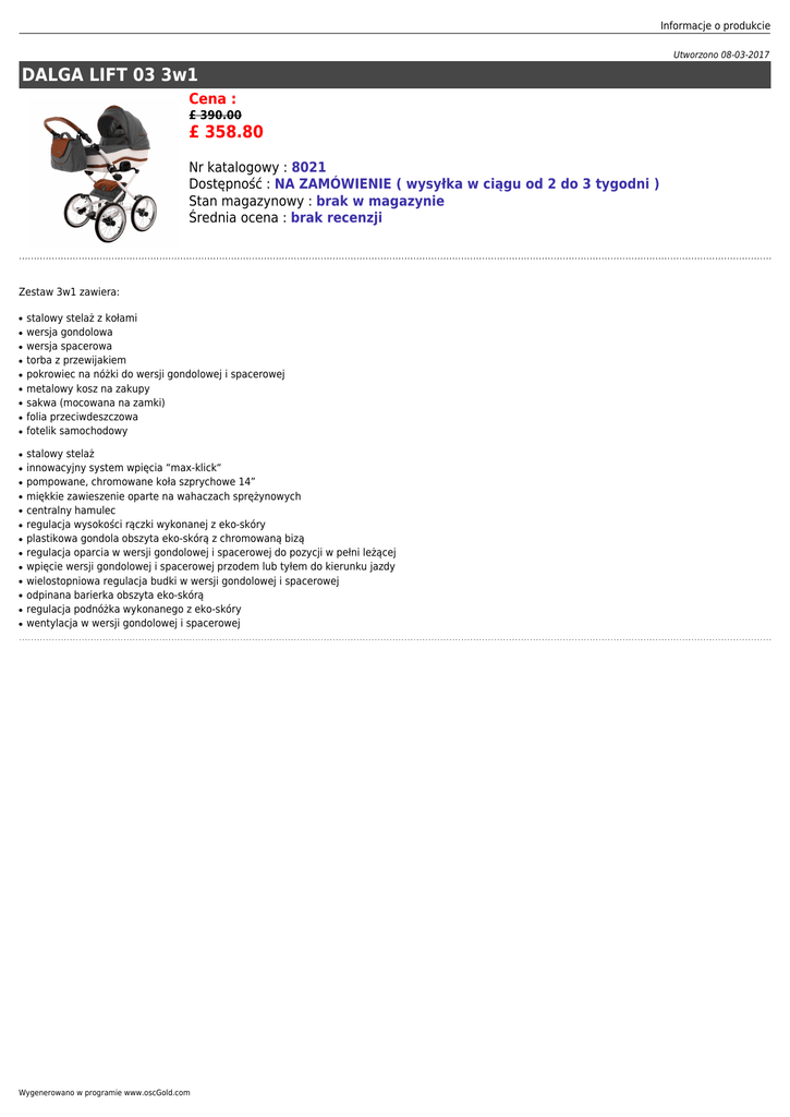 Informacje o produkcie Utworzono 08-03-2017 DALGA LIFT 03 3w1 Cena : £ 390.00 £ 358.80 Nr katalogowy : 8021 Dostępność : NA ZAMÓWIENIE ( wysyłka w ciągu od 2 do 3 tygodni ) Stan magazynowy : brak w magazynie Średnia ocena : brak recenzji Zestaw 3w1 zawiera: ● ● ● ● ● ● ● ● ● ● ● ● ● ● ● ● ● ● ● ● ● ● stalowy stelaż z kołami wersja gondolowa wersja spacerowa torba z przewijakiem pokrowiec na nóżki do wersji gondolowej i spacerowej metalowy kosz na zakupy sakwa (mocowana na zamki) folia przeciwdeszczowa fotelik samochodowy stalowy stelaż innowacyjny system wpięcia “max-klick“ pompowane, chromowane koła szprychowe 14” miękkie zawieszenie oparte na wahaczach sprężynowych centralny hamulec regulacja wysokości rączki wykonanej z eko-skóry plastikowa gondola obszyta eko-skórą z chromowaną bizą regulacja oparcia w wersji gondolowej i spacerowej do pozycji w pełni leżącej wpięcie wersji gondolowej i spacerowej przodem lub tyłem do kierunku jazdy wielostopniowa regulacja budki w wersji gondolowej i spacerowej odpinana barierka obszyta eko-skórą regulacja podnóżka wykonanego z eko-skóry wentylacja w wersji gondolowej i spacerowej Wygenerowano w programie www.oscGold.com
