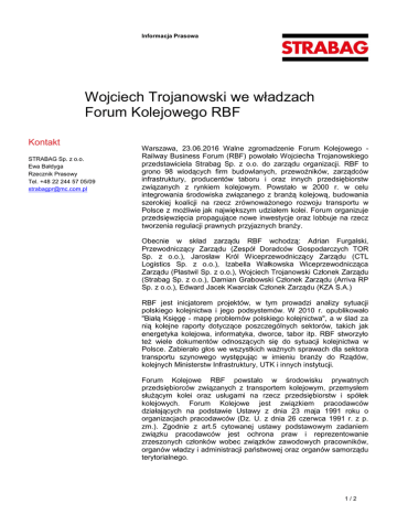 Informacja Prasowa Wojciech Trojanowski we władzach Forum Kolejowego RBF Kontakt STRABAG Sp. z o.o. Ewa Bałdyga Rzecznik Prasowy Tel. +48 22 244 57 05/09 [email protected] Warszawa, 23.06.2016 Walne zgromadzenie Forum Kolejowego Railway Business Forum (RBF) powołało Wojciecha Trojanowskiego przedstawiciela Strabag Sp. z o.o. do zarządu organizacji. RBF to grono 98 wiodących firm budowlanych, przewoźników, zarządców infrastruktury, producentów taboru i oraz innych przedsiębiorstw związanych z rynkiem kolejowym. Powstało w 2000 r. w celu integrowania środowiska związanego z branżą kolejową, budowania szerokiej koalicji na rzecz zrównoważonego rozwoju transportu w Polsce z możliwie jak największym udziałem kolei. Forum organizuje przedsięwzięcia propagujące nowe inwestycje oraz lobbuje na rzecz tworzenia regulacji prawnych przyjaznych branży. Obecnie w skład zarządu RBF wchodzą: Adrian Furgalski, Przewodniczący Zarządu (Zespół Doradców Gospodarczych TOR Sp. z o.o.), Jarosław Król Wiceprzewodniczący Zarządu (CTL Logistics Sp. z o.o.), Izabella Wałkowska Wiceprzewodnicząca Zarządu (Plastwil Sp. z o.o.), Wojciech Trojanowski Członek Zarządu (Strabag Sp. z o.o.), Damian Grabowski Członek Zarządu (Arriva RP Sp. z o.o.), Edward Jacek Kwarciak Członek Zarządu (KZA S.A.) RBF jest inicjatorem projektów, w tym prowadzi analizy sytuacji polskiego kolejnictwa i jego podsystemów. W 2010 r. opublikowało "Białą Księgę - mapę problemów polskiego kolejnictwa", a w ślad za nią kolejne raporty dotyczące poszczególnych sektorów, takich jak energetyka kolejowa, informatyka, dworce, tabor itp. RBF stworzyło też wiele dokumentów odnoszących się do sytuacji kolejnictwa w Polsce. Zabierało głos we wszystkich ważnych sprawach dla sektora transportu szynowego występując w imieniu branży do Rządów, kolejnych Ministerstw Infrastruktury, UTK i innych instytucji. Forum Kolejowe RBF powstało w środowisku prywatnych przedsiębiorców związanych z transportem kolejowym, przemysłem służącym kolei oraz usługami na rzecz przedsiębiorstw i spółek kolejowych. Forum Kolejowe jest związkiem pracodawców działających na podstawie Ustawy z dnia 23 maja 1991 roku o organizacjach pracodawców (Dz. U. z dnia 26 czerwca 1991 r. z p. zm.). Zgodnie z art.5 cytowanej ustawy podstawowym zadaniem związku pracodawców jest ochrona praw i reprezentowanie zrzeszonych członków wobec związków zawodowych pracowników, organów władzy i administracji państwowej oraz organów samorządu terytorialnego. 1/2 STRABAG SE jest europejskim koncernem budowlanym, liderem w zakresie wdrażania innowacyjnych technologii z silnym kapitałem własnym. Działalność STRABAG obejmuje pełen zakres usług budowlanych, wykwalifikowaną kadrę inżynierską, wysokiej jakości materiały budowlane oraz najnowszej generacji park maszynowy. Dzięki temu możliwa jest kompleksowa realizacja inwestycji terminowo, na najwyższym poziomie pod względem jakości i w najlepszej cenie. STRABAG korzysta z całej gamy usług oferowanych przez wyspecjalizowane spółki koncernowe, które przejmują odpowiedzialność za ich wykonanie, generując w ten sposób wartość dodaną dla swoich Klientów. Dzięki zaangażowaniu 73 tys. pracowników STRABAG SE osiąga roczne obroty w wysokości około 14 mld EUR. Koncern rozszerza swoją działalność daleko wykraczającą poza granice Austrii i Niemiec. Za pośrednictwem sieci należących do niego spółek jest obecny w wielu krajach europejskich i coraz częściej reprezentowany na innych kontynentach. Więcej informacji jest dostępnych na www.strabag.com Grupa STRABAG działa w Polsce od 1987 roku. Przy zatrudnieniu ok. 5 tys. pracowników, roczne obroty Grupy wynoszą ponad 900 mln EUR. Więcej informacji jest dostępnych na www.strabag.pl 2/2