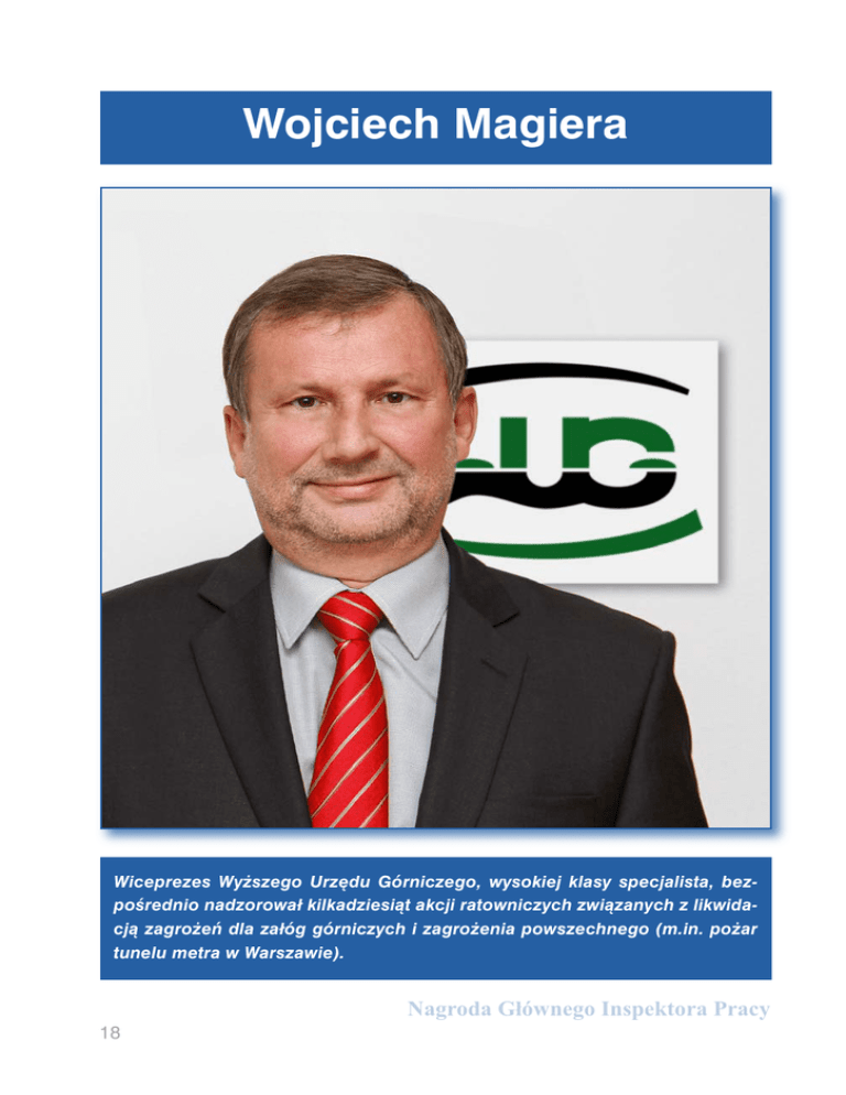 Wojciech Magiera Wiceprezes Wyższego Urzędu Górniczego, wysokiej klasy specjalista, bezpośrednio nadzorował kilkadziesiąt akcji ratowniczych związanych z likwidacją zagrożeń dla załóg górniczych i zagrożenia powszechnego (m.in. pożar tunelu metra w Warszawie). Nagroda Głównego Inspektora Pracy 18 Nadzorował Pan wiele akcji ratowniczych w kopalniach. Gdy gra idzie o życie ludzi uwięzionych na dole, myśli się o bezpieczeństwie ratowników? Trzeba umieć wyważyć ryzyko i być przekonanym, że jeżeli ratownicy wejdą, to wszyscy wrócą. Ratownik jest tak wyszkolony, żeby nieść pomoc w skrajnie trudnych warunkach. Ale górnictwo jest nieprzewidywalne, uczy pokory. Wydaje się, że już wszystko wiemy, a każda akcja niesie nowe doświadczenia. Kieruje nią jedna osoba, kierownik akcji, któremu takie zdarzenie przytrafia się raz-dwa razy w życiu. W ciągu 15 lat uczestniczyłem we wszystkich akcjach, związanych z ratowaniem ludzi, nadzorując je i doradzając kierownikowi akcji. Wśród Pańskich dokonań wymieniane są realizacje wniosków wprowadzających pewne zmiany w czasie prowadzenia akcji ratowniczych. Czego dotyczyły? Górnicy schodzą coraz głębiej, gdzie trzeba zmagać się z wysokimi temperaturami. Im cieplej, tym organizm człowieka funkcjonuje wolniej, refleks jest zaburzony, myślenie wolniejsze. 10-12 lat temu wyposażyliśmy ratowników w urządzenia do schładzania wdychanego z aparatu powietrza i kamizelki schładzające. Chodniki dołowe są wąskie, a kiedy dochodzi do zawałów to miejsca jest jeszcze mniej. Zadbaliśmy o minimalizację przenośników zgrzebłowych do odstawy urobku, które można szybko zmontować. Ratownicy, kiedy zjadą na dół, muszą niejednokrotnie pokonać jesz- cze kilka kilometrów, żeby dotrzeć do stanowiska pracy. Zapewnienie im transportu to jeden z priorytetów. Po zapaleniach metanu w kopalniach węgla kamiennego zainicjował Pan nowelizację przepisów w zakresie zagrożenia metanowego. Czego dotyczyła? Głównym sposobem walki z metanem jest jego rozrzedzenie dostarczonym z zewnątrz powietrzem. W wąskich wyrobiskach jest to bardzo trudne, więc walczymy o większe przekroje wyrobisk. Są też różne sposoby przewietrzania korytarzy. Ten najczęściej stosowany jest najtańszy, ale też najmniej skuteczny. Praktyka wykazała, że metan wychodzący ze spągu (czyli podłoża) pojawia się pod przenośnikami zgrzebłowymi, czego nie wykrywają czujniki zamontowane w ścianach. Trzeba więc inaczej je rozmieszczać, aby reagowały na pojawienie się zagrożenia. Wentylacja to złożony problem, który wymaga perspektywicznego myślenia, czyli stabilizacji na stanowiskach decyzyjnych. To konieczne, aby można było zaplanować bezpieczne wydobycie węgla na najbliższe 10-20 lat. Prezes Wyższego Urzędu Górniczego powołał Komisję Bezpieczeństwa, w której spotykają się przedsiębiorcy, związkowcy, naukowcy, pracownicy urzędów. W trakcie dyskusji pojawiają się pomysły, które uchwałami obligują prezesa do ich wdrażania. Uważam, że rozmowa – obok kontroli – jest bardzo ważnym elementem współpracy. Tylko w ten sposób można znaleźć lek na różne problemy. imienia Haliny Krahelskiej 19