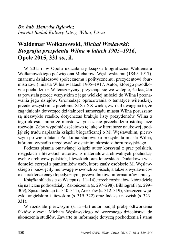 Dr. hab. Henryka Ilgiewicz Instytut Badań Kultury Litwy, Wilno, Litwa Waldemar Wołkanowski, Michał Węsławski: Biografia prezydenta Wilna w latach 1905–1916, Opole 2015, 331 ss., il. W 2015 r. w Opolu ukazała się książka biograficzna Waldemara Wołkanowskiego poświęcona Michałowi Węsławskiemu (1849–1917), znanemu działaczowi społecznemu i politycznemu, prezydentowi (burmistrzowi) miasta Wilna w latach 1905–1917. Autor, którego przodkowie pochodzili z Wileńszczyzny, przyznaje się we wstępie, że książka ta powstała przede wszystkim z jego wielkiej miłości do Wilna i poznawania jego dziejów. Gromadząc opracowania o tematyce wileńskiej, przede wszystkim z przełomu XIX i XX wieku, zwrócił uwagę na to, że zagadnienia dotyczące działalności samorządu miasta Wilna poruszane są niezwykle rzadko, dotychczas brakuje listy prezydentów Wilna z tego okresu, mimo że miasto w tym czasie przechodziło istotną fazę rozwoju. Żeby wypełnić częściowo tę lukę w literaturze naukowej, podjął się trudu napisania książki biograficznej o M. Węsławskim, pierwszym po wielu latach Polaku na stanowisku prezydenta miasta Wilna, któremu wypadło urzędować w ostatnim okresie zaboru rosyjskiego. Podczas pisania omawianej książki autor korzystał z prac polskich, rosyjskich i litewskich autorów, z materiałów archiwalnych pochodzących z archiwów polskich, litewskich oraz łotewskich. Dodatkowe wiadomości czerpał z pamiętników osób, które znały osobiście M. Węsławskiego i poświęciły mu uwagę w swoich zapisach, a także z wydawnictw o charakterze encyklopedycznym, przewodników, informatorów i prasy. Książka składa się ze Wstępu (s. 11–14), trzech rozdziałów, które dzielą się na liczne podrozdziały, Zakończenia (s. 297–298), Bibliografii (s. 299– 309), Spisu ilustracji (s. 310–311), Aneksów (s. 312–319), streszczeń w języku angielskim i litewskim (s. 319–322) oraz Indeksu nazwisk (s. 323– 331). W rozdziale pierwszym (s. 15–45) autor podjął próbę odtworzenia faktów z życia Michała Węsławskiego od wczesnego dzieciństwa do ukończenia studiów. Zawarte tu informacje dotyczą pochodzenia i stanu 350 Rocznik SNPL, Wilno, Litwa, 2016, T. 16, s. 350–356 Rocznik Stowarzyszenia Naukowców Polaków Litwy, 2016, T. 16 majątkowego rodziny Węsławskich. Wiele faktów opisanych w tym rozdziale nie było dotąd publikowanych, uzupełniają one luki w biogramach bohatera książki. Opierając się na źródłach i literaturze przedmiotu, autor podaje, że Michał Joachim Alojzy Węsławski (używał pierwszego imienia) urodził się 17 września 1849 roku w rodzinnym majątku Giegrany w powiecie telszewskim na Żmudzi. Był synem ziemianina Antoniego i jego drugiej żony Kazimiery z Gadonów. Michał miał liczne rodzeństwo: braci Stanisława (ur. 26 XII 1847) i Witolda (ur. 25 XI 1855), siostrę Teklę (ur. 1854) oraz pięć starszych sióstr przyrodnich (Zofię, Marię, Józefę, Stefanię, Teresę) z pierwszego małżeństwa ojca z Zofią z Narkiewiczów (s. 15–18). Rodzinę Węsławskich zaliczano do szlachty średniozamożnej, znanej w Wielkim Księstwie Litewskim od XVI w. Majątek Giegrany na Żmudzi w XVIII w. nabył podstoli trocki Michał Węsławski. W 1754 r. ufundował on w Giegranach drewniany kościół filialny pw. Zbawiciela (Jezusa Nazareńskiego) parafii w Kalwarii Żmudzkiej, który zachował się do dzisiaj. Majątek Węsławskich rozrastał się w wyniku darowizn i zakupów. W drugiej połowie XIX wieku całe dobra Węsławskich obejmowały ponad 2 tysiące dziesięcin samej tylko ornej ziemi. Uprawiano zboża i len, które wysyłano głównie do bałtyckich miast portowych: Lipawy, Rygi i Mitawy. Hodowano konie, bydło, owce i trzodę chlewną. Dochody z majątku pozwalały właścicielowi utrzymywać w dostatku liczną rodzinę i zajmować odpowiednie stanowisko w ówczesnym społeczeństwie (s. 18–24). Położenie materialne rodziny Węsławskich, jak i wielu rodzin ziemiańskich na Litwie, zmieniło się zasadniczo po upadku powstania styczniowego, w którym Antoni Węsławski brał czynny udział. Był on aresztowany i więziony, a potem skazany na zesłanie do północnych regionów Rosji, majątek zaś Giegrany został skonfiskowany i sprzedany. Razem z ojcem na zesłanie udał się dobrowolnie najstarszy syn Stanisław, który miał opiekować się ojcem. Antoniego Węsławskiego zwolniono z zesłania wiosną 1868 r., najprawdopodobniej w związku z postępującą chorobą oczu. Ponieważ byłemu zesłańcowi nie pozwolono wrócić w rodzinne strony, rodzina Węsławskich osiadła w Lipawie, gdzie Stanisław będący z wykształcenia inżynierem technologiem znalazł zatrudnienie w przemyśle i utrzymywał rodzinę. Węsławscy w Lipawie nawiązali kontakty z innymi zamieszkałymi tam Polakami i czynie uczestniczyli w życiu kulturalnym miasta (s. 24–31). 351 Recenzje i opinie Michał Węsławski po skończeniu nauki w gimnazjum w Szawlach w 1970 r. udał się na studia prawnicze najpierw do Moskwy, potem do Petersburga. Dyplom z tytułem kandydata do posad sądowych otrzymał w 1874 r. na Uniwersytecie w Petersburgu (s. 31–36). Po studiach odbył aplikację w Petersburgu i Kiszyniowie, następnie pracował przez rok jako sędzia śledczy m. Kiszyniowa. W 1878 r. przeniósł się do Wilna, gdzie podjął samodzielną praktykę adwokacką. Ważnym powodem powrotu na Litwę była wiadomość o śmierci jego starszego brata Stanisława, który zmarł na gruźlicę w wieku 31 lat. Mieszkając i pracując w Wilnie, Michał mógł wspomagać finansowo rodzinę i częściej ją odwiedzać (s. 36–38). W. Wołkanowskiemu udało się zdobyć pewne informacje również o małżeństwie M. Węsławskiego, o którym inni autorzy wspominają nader lakonicznie. Michał Węsławski w 1879 r. wziął ślub z Marią Grużewską, która wniosła mu w posagu liczący 157 dziesięcin majątek