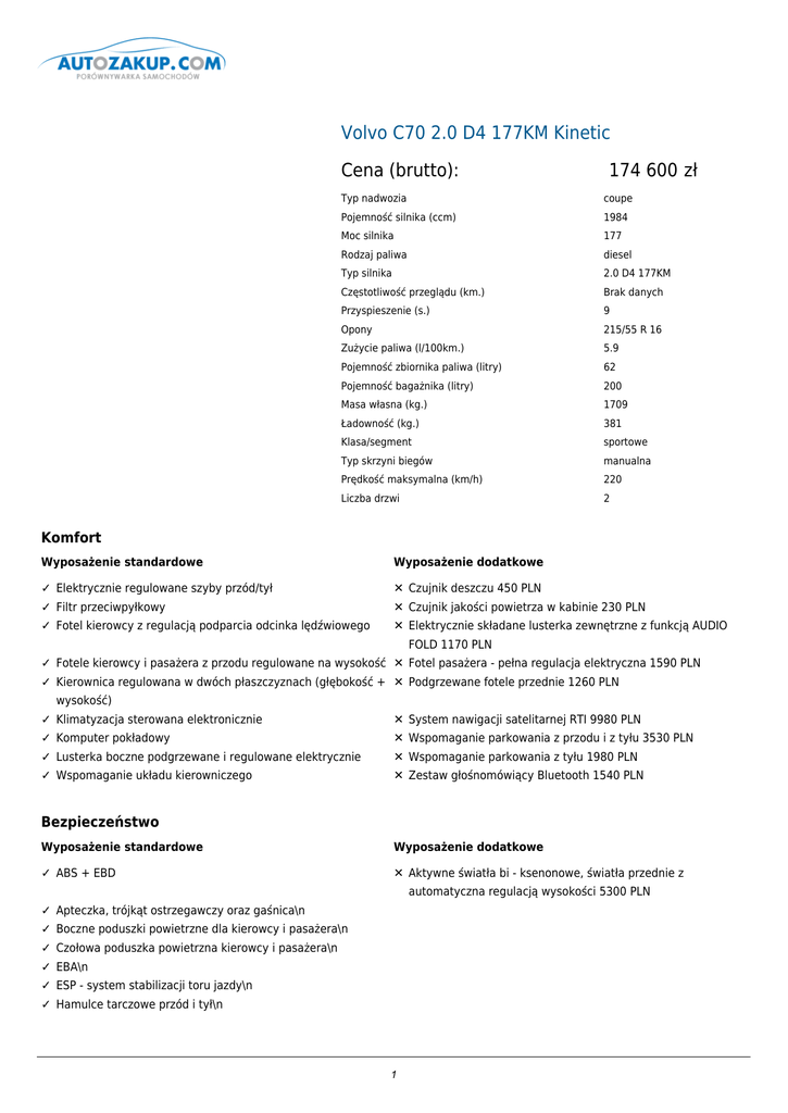 Volvo C70 2.0 D4 177KM Kinetic Cena (brutto): 174 600 zł Typ nadwozia coupe Pojemność silnika (ccm) 1984 Moc silnika 177 Rodzaj paliwa diesel Typ silnika 2.0 D4 177KM Częstotliwość przeglądu (km.) Brak danych Przyspieszenie (s.) 9 Opony 215/55 R 16 Zużycie paliwa (l/100km.) 5.9 Pojemność zbiornika paliwa (litry) 62 Pojemność bagażnika (litry) 200 Masa własna (kg.) 1709 Ładowność (kg.) 381 Klasa/segment sportowe Typ skrzyni biegów manualna Prędkość maksymalna (km/h) 220 Liczba drzwi 2 Komfort Wyposażenie standardowe Wyposażenie dodatkowe ✓ Elektrycznie regulowane szyby przód/tył ✕ Czujnik deszczu 450 PLN ✓ Filtr przeciwpyłkowy ✕ Czujnik jakości powietrza w kabinie 230 PLN ✓ Fotel kierowcy z regulacją podparcia odcinka lędźwiowego ✕ Elektrycznie składane lusterka zewnętrzne z funkcją AUDIO FOLD 1170 PLN ✓ Fotele kierowcy i pasażera z przodu regulowane na wysokość ✕ Fotel pasażera - pełna regulacja elektryczna 1590 PLN ✓ Kierownica regulowana w dwóch płaszczyznach (głębokość + ✕ Podgrzewane fotele przednie 1260 PLN wysokość) ✓ Klimatyzacja sterowana elektronicznie ✕ System nawigacji satelitarnej RTI 9980 PLN ✓ Komputer pokładowy ✕ Wspomaganie parkowania z przodu i z tyłu 3530 PLN ✓ Lusterka boczne podgrzewane i regulowane elektrycznie ✕ Wspomaganie parkowania z tyłu 1980 PLN ✓ Wspomaganie układu kierowniczego ✕ Zestaw głośnomówiący Bluetooth 1540 PLN Bezpieczeństwo Wyposażenie standardowe Wyposażenie dodatkowe ✓ ABS + EBD ✕ Aktywne światła bi - ksenonowe, światła przednie z automatyczna regulacją wysokości 5300 PLN ✓ Apteczka, trójkąt ostrzegawczy oraz gaśnica\n ✓ Boczne poduszki powietrzne dla kierowcy i pasażera\n ✓ Czołowa poduszka powietrzna kierowcy i pasażera\n ✓ EBA\n ✓ ESP - system stabilizacji toru jazdy\n ✓ Hamulce tarczowe przód i tył\n 1 ✓ Pasy bezwładnościowe z przodu i z tyłu z napinaczami siły dla wszystkich pasażerów oraz ogranicznikami siły dla pasażerów przednich foteli\n ✓ Przednie światła przeciwmgielne\n ✓ System inteligentnego informowania (IDIS)\n ✓ System mocowania fotelika dziecięcego ISOFIX\n ✓ System zabezpieczeń przed skutkami uderzeń bocznych (SIPS)\n ✓ System zabezpieczeń przed urazami kręgosłupa szyjnego (WHIPS) dla pasażerów przednich miejsc\n ✓ Trzecie światło stopu\n ✓ Układ dynamicznej kontroli trakcji (DSTC)\n ✓ Układ zabezpieczający przed skutkami dachowania pojazdu ROPS\n ✓ Wyłącznik poduszki powietrznej pasażera\n Dodatki Wyposażenie standardowe Wyposażenie dodatkowe ✓ 16" obręcze ze stopów lekkich CASTULA (215/55 R 16) ✕ Automatyczna skrzynia biegów (Geatronic) z funkcją sekwencyjnej zmiany biegów 8800 PLN ✓ 5-biegowa automatyczna skrzynia biegów Sentronic ✕ Automatycznie ściemniające się lusterko wsteczne 700 PLN ✓ 6-biegowa manualna skrzynia biegów ✕ Automatycznie ściemniające się lusterko wsteczne z ✓ Autoalarm z czujnikami ruchu i przechyłu ✕ BLIS - układ monitorowania "martwych pól" lusterek ✓ Dźwignia zmiany biegów obszyta skórą ✕ Chromowana listwa na zderzaku tylnym 320 PLN ✓ Elektroniczny immobilizer ze zmiennym kodem ✕ Dach w kolorze kontrastowym 1350 PLN ✓ Elektrycznie składany 3-częściowy sztywny dach ✕ Fotel kierowcy regulowany elektrycznie z pamięcią kompasem 1020 PLN zewnętrznych 3000 PLN ustawienia 3750 PLN ✓ Gniazdko 12V w bagażniku ✕ Głośniki niskotonowe (subwoofers) 2x130W (9") 2290 PLN ✓ Kierunkowskazy zintegrowane w lusterkach zewnętrznych ✕ Hak holowniczy (cena bez montażu) 1932 PLN ✓ Kurtyny ochronne (IC) ✕ HIGH PERFORMANCE SOUND (1 - CD, 4x40W, 8 głośników) 1760 PLN ✓ Lampki do czytania ✕ HomeLink 750 PLN ✓ Lampy przednie z regulacją wysokością świateł ✕ Komplet dywaników gumowych 360 PLN ✓ Listwy boczne lakierowane ✕ Koło kierownicy 3-ramienne skórzane z wstawkami aluminium 1780 PLN ✓ Lusterka boczne w kolorze nadwozia ✕ Lakier metalizowany 2600 PLN ✓ Maty podłogowe ✕ Lakier metalizowany specjalny 4000 PLN ✓ Obrotomierz ✕ Lakier perłowy 2600 PLN ✓ Oświetlenie asekuracyjne HOME SAFE ✕ Odtwarzacz na 6 płyt 1340 PLN ✓ Oświetlenie podłogi z przodu ✕ PCC z układem Keyless Drive 3210 PLN ✓ podświetlane lusterka w osłonach przeciwsłonecznych ✕ Powłoka hydrofobowa dla szyb bocznych przednich 510 PLN kierowcy i pasażera ✓ Podświetlany i zamykany schowek na rękawiczki ✕ PREMIUM SOUND ( 1 CD, 4x70W + 25W, 12 głośników) z Dolby Pro - Logic II 7090 PLN ✓ Podłokietnik przedni z uchwytem na kubek ✕ Przednie światła do jazdy dziennej w technologii LED 150 PLN ✓ 2 Radioodtwarzacz CD, 6 głośników PERFORMANCE 4x20W ✕ 3 Rękaw na narty lub długie przedmioty 640 PLN 4 ✓ Sterowanie systemem audio z koła kierownicy ✕ Sportowa dźwignia zmiany biegów 370 PLN ✓ Tapicerka tekstylna BORGHOLM ✕ Śruby kół z zabezpieczeniem antykradzieżowym 320 PLN ✓ Trójramienna kierownica pokryta skórą (zawsze w tonacji ✕ System AQS poprawy jakości powietrza we wnętrzu 600 PLN OFFBLACK) ✓ Uchwyt na monety w schowku na rękawiczki ✕ Tapicerka HAVERDAL 2000 PLN ✓ Układ automatycznej regulacji prędkości (CRUISE CONTROL) ✕ Tapicerka skórzana SOVEREIGN HIDE SOFT LEATHER 12710 ✓ Układ recyrkulacji powietrza we wnętrzu ✕ Tekstylne maty podłogowe w kolorze siedzeń 500 PLN ✓ Wieszak na ubranie w zagłówku fotela pasażera ✕ Tylny spoiler 1000 PLN ✓ Wskaźnik temperatury zewnętrznej ✕ Uchwyt na zakupy 440 PLN ✓ Wykończenie wnętrza BAUXITE: drzwi, schowek na ✕ Układ dodatkowego ogrzewania wnętrza z możliwością PLN rękawiczki ✓ Zdalnie sterowany centralny zamek z funkcją podwójnego ustawień czasu pracy 4580 PLN ✕ Układ oczyszczania świateł przednich 1170 PLN blokowania ✓ Zderzaki w kolorze nadwozia ✕ Wykończenie wnętrza aluminium 1170 PLN ✓ Zegar cyfrowy ✕ wykończenie wnętrza BL