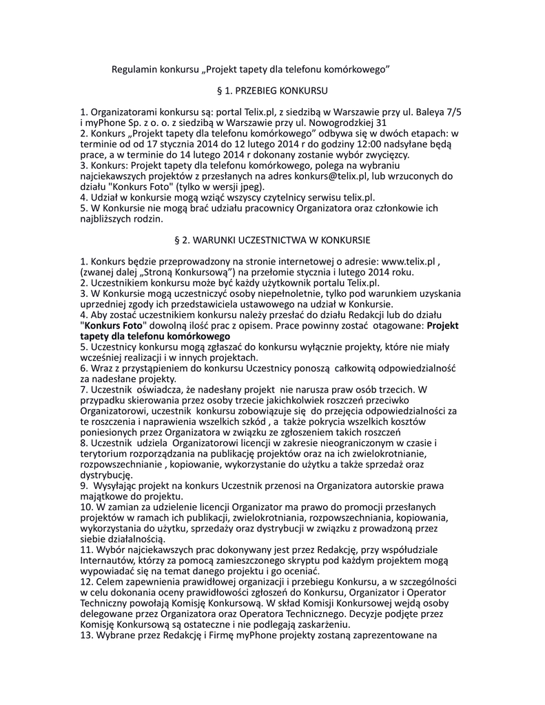 Regulamin konkursu „Projekt tapety dla telefonu komórkowego” § 1. PRZEBIEG KONKURSU 1. Organizatorami konkursu są: portal Telix.pl, z siedzibą w Warszawie przy ul. Baleya 7/5 i myPhone Sp. z o. o. z siedzibą w Warszawie przy ul. Nowogrodzkiej 31 2. Konkurs „Projekt tapety dla telefonu komórkowego” odbywa się w dwóch etapach: w terminie od od 17 stycznia 2014 do 12 lutego 2014 r do godziny 12:00 nadsyłane będą prace, a w terminie do 14 lutego 2014 r dokonany zostanie wybór zwycięzcy. 3. Konkurs: Projekt tapety dla telefonu komórkowego, polega na wybraniu najciekawszych projektów z przesłanych na adres [email protected], lub wrzuconych do działu "Konkurs Foto" (tylko w wersji jpeg). 4. Udział w konkursie mogą wziąć wszyscy czytelnicy serwisu telix.pl. 5. W Konkursie nie mogą brać udziału pracownicy Organizatora oraz członkowie ich najbliższych rodzin. § 2. WARUNKI UCZESTNICTWA W KONKURSIE 1. Konkurs będzie przeprowadzony na stronie internetowej o adresie: www.telix.pl , (zwanej dalej „Stroną Konkursową”) na przełomie stycznia i lutego 2014 roku. 2. Uczestnikiem konkursu może być każdy użytkownik portalu Telix.pl. 3. W Konkursie mogą uczestniczyć osoby niepełnoletnie, tylko pod warunkiem uzyskania uprzedniej zgody ich przedstawiciela ustawowego na udział w Konkursie. 4. Aby zostać uczestnikiem konkursu należy przesłać do działu Redakcji lub do działu "Konkurs Foto" dowolną ilość prac z opisem. Prace powinny zostać otagowane: Projekt tapety dla telefonu komórkowego 5. Uczestnicy konkursu mogą zgłaszać do konkursu wyłącznie projekty, które nie miały wcześniej realizacji i w innych projektach. 6. Wraz z przystąpieniem do konkursu Uczestnicy ponoszą całkowitą odpowiedzialność za nadesłane projekty. 7. Uczestnik oświadcza, że nadesłany projekt nie narusza praw osób trzecich. W przypadku skierowania przez osoby trzecie jakichkolwiek roszczeń przeciwko Organizatorowi, uczestnik konkursu zobowiązuje się do przejęcia odpowiedzialności za te roszczenia i naprawienia wszelkich szkód , a także pokrycia wszelkich kosztów poniesionych przez Organizatora w związku ze zgłoszeniem takich roszczeń 8. Uczestnik udziela Organizatorowi licencji w zakresie nieograniczonym w czasie i terytorium rozporządzania na publikację projektów oraz na ich zwielokrotnianie, rozpowszechnianie , kopiowanie, wykorzystanie do użytku a także sprzedaż oraz dystrybucję. 9. Wysyłając projekt na konkurs Uczestnik przenosi na Organizatora autorskie prawa majątkowe do projektu. 10. W zamian za udzielenie licencji Organizator ma prawo do promocji przesłanych projektów w ramach ich publikacji, zwielokrotniania, rozpowszechniania, kopiowania, wykorzystania do użytku, sprzedaży oraz dystrybucji w związku z prowadzoną przez siebie działalnością. 11. Wybór najciekawszych prac dokonywany jest przez Redakcję, przy współudziale Internautów, którzy za pomocą zamieszczonego skryptu pod każdym projektem mogą wypowiadać się na temat danego projektu i go oceniać. 12. Celem zapewnienia prawidłowej organizacji i przebiegu Konkursu, a w szczególności w celu dokonania oceny prawidłowości zgłoszeń do Konkursu, Organizator i Operator Techniczny powołają Komisję Konkursową. W skład Komisji Konkursowej wejdą osoby delegowane przez Organizatora oraz Operatora Technicznego. Decyzje podjęte przez Komisję Konkursową są ostateczne i nie podlegają zaskarżeniu. 13. Wybrane przez Redakcję i Firmę myPhone projekty zostaną zaprezentowane na stronach portalu Telix.pl i firmy myPhone oraz mogą byś wykorzystane w materiałach prasowych organizatorów oraz ich produktach, a ich autorzy otrzymają nagrody. 14. Każdy Uczestnik przystępując do konkursu wyraża zgodę na zmontowanie graficzne lub wykonanie projektu fizycznego swojej pracy przez Organizatora, celem utworzenia wystawy lub prezentacji multimedialnej będącej kompilacją najciekawszych zgłoszeń konkursowych. 15. W Konkursie biorą udział jedynie prawidłowe zgłoszenia. 16. Organizator zastrzega, że przesłane przez Uczestników prace zostaną poddane weryfikacji, a ich publikacja na stronie internetowej www.telix.pl nastąpi po ich akceptacji przez Organizatora. § 3. NAGRODY 1. Nagrodą w konkursie: „Projekt tapety dla telefonu komórkowego” są 2 telefony komórkowe (po testach na Telix.pl) firmy myPhone: • • • myPhone DuoSmart (po testach na Telix.pl) w cenie 649 zł. myPhone FUN (po testach na Telix.pl) w cenie 449 zł. trzy nagrody dodatkowe - pamięci USB myPhone 8GB ze smyczami, w cenie 39 zł każda 2. Redakcja zapewnia sobie możliwość dodania kolejnych nagród dla kolejnych miejsc w trakcie trwania Konkursu. 3. Zwycięzcom Konkursu nie przysługują roszczenia o wypłatę wartości Nagród w gotówce. 4 Zwycięzca Konkursu nie ma możliwości zamiany Nagrody. Jakiekolwiek roszczenia osób, które wzięły udział w Konkursie z tytułu nieotrzymania Nagrody, które nie zostały im przyznane, są wyłączone. 5. Niezależnie od ilości zgłoszeń do udziału, w Konkursie można wygrać tylko jedną nagrodę. Przy czym każde zgłoszenie będzie rozpatrywane indywidualnie w celu rozstrzygnięcia konkursu. 6. Nagroda zwycięzcy konkursu zostanie wręczona osobiście, we wcześniej ustalonym przez portal telix.pl i uczestnika terminie. W uzasadnionym przypadku, gdy nie jest możliwy odbiór osobisty Redakcja zastrzega sobie możliwość wysłania nagrody za pośrednictwem kuriera. 7. Zdobywca nagrody zostanie powiadomiony o zdobyciu nagrody za pomocą poczty elektronicznej wysłanej z adresu [email protected] na konto pocztowe zdobywcy Nagrody. 8. Uczestnik Konkursu nieodwołalnie traci prawo do Nagrody, jeżeli Organizator Konkursu nie otrzyma, w przeciągu 72 godzin odpowiedzi na wysłany adres, podany podczas rejestracji na koncie Użytkownika serwisu Telix.pl 9. W przypadku, gdy na podstawie powszechnie obowiązujących przepisów prawa, 