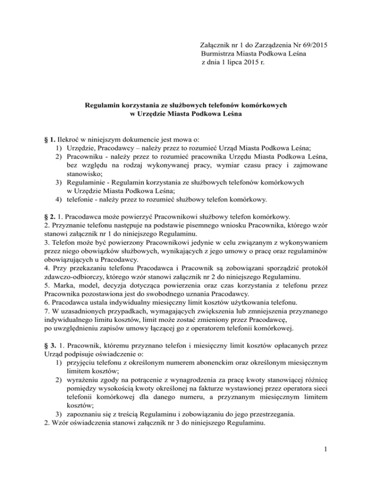 Załącznik nr 1 do Zarządzenia Nr 69/2015 Burmistrza Miasta Podkowa Leśna z dnia 1 lipca 2015 r. Regulamin korzystania ze służbowych telefonów komórkowych w Urzędzie Miasta Podkowa Leśna § 1. Ilekroć w niniejszym dokumencie jest mowa o: 1) Urzędzie, Pracodawcy – należy przez to rozumieć Urząd Miasta Podkowa Leśna; 2) Pracowniku - należy przez to rozumieć pracownika Urzędu Miasta Podkowa Leśna, bez względu na rodzaj wykonywanej pracy, wymiar czasu pracy i zajmowane stanowisko; 3) Regulaminie - Regulamin korzystania ze służbowych telefonów komórkowych w Urzędzie Miasta Podkowa Leśna; 4) telefonie - należy przez to rozumieć służbowy telefon komórkowy. § 2. 1. Pracodawca może powierzyć Pracownikowi służbowy telefon komórkowy. 2. Przyznanie telefonu następuje na podstawie pisemnego wniosku Pracownika, którego wzór stanowi załącznik nr 1 do niniejszego Regulaminu. 3. Telefon może być powierzony Pracownikowi jedynie w celu związanym z wykonywaniem przez niego obowiązków służbowych, wynikających z jego umowy o pracę oraz regulaminów obowiązujących u Pracodawcy. 4. Przy przekazaniu telefonu Pracodawca i Pracownik są zobowiązani sporządzić protokół zdawczo-odbiorczy, którego wzór stanowi załącznik nr 2 do niniejszego Regulaminu. 5. Marka, model, decyzja dotycząca powierzenia oraz czas korzystania z telefonu przez Pracownika pozostawiona jest do swobodnego uznania Pracodawcy. 6. Pracodawca ustala indywidualny miesięczny limit kosztów użytkowania telefonu. 7. W uzasadnionych przypadkach, wymagających zwiększenia lub zmniejszenia przyznanego indywidualnego limitu kosztów, limit może zostać zmieniony przez Pracodawcę, po uwzględnieniu zapisów umowy łączącej go z operatorem telefonii komórkowej. § 3. 1. Pracownik, któremu przyznano telefon i miesięczny limit kosztów opłacanych przez Urząd podpisuje oświadczenie o: 1) przyjęciu telefonu z określonym numerem abonenckim oraz określonym miesięcznym limitem kosztów; 2) wyrażeniu zgody na potrącenie z wynagrodzenia za pracę kwoty stanowiącej różnicę pomiędzy wysokością kwoty określonej na fakturze wystawionej przez operatora sieci telefonii komórkowej dla danego numeru, a przyznanym miesięcznym limitem kosztów; 3) zapoznaniu się z treścią Regulaminu i zobowiązaniu do jego przestrzegania. 2. Wzór oświadczenia stanowi załącznik nr 3 do niniejszego Regulaminu. '1 3. W uzasadnionych przypadkach Pracodawca może umorzyć koszt rozmów poza przyznany limit na pisemny umotywowany wniosek Pracownika. § 4. 1. Osobą uprawnioną do korzystania z telefonu jest wyłącznie Pracownik. 2. Koszty połączeń wychodzących i innych usług teleinformatycznych o charakterze służbowym ponosi Pracodawca. 3. Pracodawca może kontrolować jakość i sposób wykorzystania przez Pracownika telefonu. § 5. 1. Pracodawca może, na zasadach wskazanych w Kodeksie pracy, zobowiązać pracownika do pozostawania poza normalnymi godzinami pracy w gotowości do wykonywania pracy wynikającej z umowy o pracę w zakładzie pracy lub innym miejscu wyznaczonych przez Pracodawcę (dyżur). 2. Gotowość do wykonywania pracy, o której mowa w ust. 1. może oznaczać również gotowość do odebrania połączenia od Pracodawcy z wykorzystaniem telefonu. § 6. 1. Pracownik jest zobowiązany właściwie eksploatować i dbać o powierzony mu telefon. 2. Pracownik jest zobowiązany niezwłocznie zgłaszać pracodawcy wszelkie usterki telefonu, a także jego utratę, kradzież. 3. Pracownik jest zobowiązany utrzymywać telefon w stanie nie gorszym, niż wynika to ze zwykłego zużycia eksploatacyjnego. 4. Pracodawca może dochodzić odpowiedzialności materialnej Pracownika z tytułu zniszczenia telefonu na zasadach wskazanych w Kodeksie pracy. 5. Pracownik zobowiązany jest pokryć straty Pracodawcy powstałe z winy umyślnej, lekkomyślności lub niedbalstwa Pracownika na skutek uszkodzenia, zniszczenia, kradzieży lub zaginięcia telefonu. § 7. 1. Pracownik może wnioskować o dokonania cesji. 2. Zgoda na dokonanie cesji następuje na podstawie pisemnego wniosku Pracownika, którego wzór stanowi załącznik nr 4 do niniejszego Regulaminu. § 8. 1. Pracownik jest zobowiązany zwrócić Pracodawcy telefon wraz z wyposażeniem najpóźniej w dniu rozwiązania umowy o pracę, chyba że Pracodawca postanowi inaczej. 2. Pracownik jest zobowiązany także niezwłocznie zwrócić Pracodawcy telefon na każde jego wezwanie. 3. Przy zwrocie telefonu Pracodawca i Pracownik są zobowiązani sporządzić protokół zdawczo-odbiorczy, o którym mowa w § 2 ust. 4. § 9. 1. Pracownik może z chwilą wymiany telefonów w Urzędzie wykupić używany aparat za równowartość kosztu zakupu na podstawie faktury wystawionej przez Referat Finansowy. 2. Pozostałe telefony zdane po okresie trwania umowy, przechowywane są w depozycie przez okres 1 roku, a następnie przekazywane do utylizacji. § 10. Prowadzenie spraw związanych z używaniem telefonów komórkowych, a w szczególności: 1) dokonywanie zakupu nowych telefonów, kart aktywacyjnych oraz akcesoriów; 2) wydawanie oraz przyjmowanie zwracanych telefonów; '2 3) zgłaszanie do ewidencji ilościowo-wartościowej zmian dotyczących używania telefonów; 4) ewidencjonowanie telefonów i kart SIM; 5) zgłaszanie kradzieży właściwym organom, operatorowi - należy do Informatyka Urzędu. § 11. 1. Dopuszcza się przekazanie do użytkowania służbowego telefonu komórkowego będącego w ewidencji Urzędu, jednostce organizacyjnej Miasta Podkowa Leśna, zwanej dalej „jednostką”. 2. Przyznanie telefonu jednostce następuje na podstawie pisemnego wniosku, uzasadniającego konieczność korzystania z telefonu, którego wzór stanowi załącznik nr 1 do niniejszego Regulaminu. 3. Przekazanie telefonu jednostce następuje na podstawie protokółu zdawczo-odbiorczego, którego wzór stanowi załącznik nr 2 do niniejszego Regulaminu. 4. Kierown
