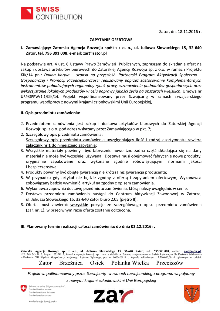 Zator, dn. 18.11.2016 r. ZAPYTANIE OFERTOWE I. Zamawiający: Zatorska Agencja Rozwoju spółka z o. o., ul. Juliusza Słowackiego 15, 32-640 Zator, tel. 795 391 008, e-mail: [email protected] Na podstawie art. 4 ust. 8 Ustawy Prawo Zamówień Publicznych, zapraszam do składania ofert na zakup i dostawa artykułów biurowych do Zatorskiej Agencji Rozwoju sp. z o.o. w ramach Projektu KIK/14 pn.: Dolina Karpia – szansa na przyszłość. Partnerski Program Aktywizacji Społeczno – Gospodarczej i Promocji Przedsiębiorczości realizowany poprzez zastosowanie komplementarnych instrumentów pobudzających regionalny rynek pracy, wzmocnienie podmiotów gospodarczych oraz wykorzystanie lokalnych produktów w celu poprawy jakości życia na obszarach wiejskich. Umowa nr URP/SPPW/1.1/KIK/14. Projekt współfinansowany przez Szwajcarię w ramach szwajcarskiego programu współpracy z nowymi krajami członkowskimi Unii Europejskiej, II. Opis przedmiotu zamówienia: 1. Przedmiotem zamówienia jest zakup i dostawa artykułów biurowych do Zatorskiej Agencji Rozwoju sp. z o.o. pod adres wskazany przez Zamawiającego w pkt. 7; 2. Szczegółowy opis przedmiotu zamówienia: Szczegółowy opis przedmiotu zamówienia uwzględniający ilość i rodzaj asortymentu zawiera załącznik nr 1 do niniejszego zapytania; 3. Wszystkie materiały powinny być fabrycznie nowe tzn. żadna część składająca się na dany materiał nie może być wcześniej używana. Dostawa musi obejmować fabrycznie nowe produkty, oryginalnie zapakowane oraz wykonane zgodnie zobowiązującymi normami jakości i bezpieczeństwa; 4. Produkty powinny być objęte gwarancją nie krótszą niż gwarancja producenta; 5. W przypadku gdy artykuł nie będzie zgodny z ofertą i zapytaniem ofertowym, Wykonawca zobowiązany będzie wymienić artykuł na zgodny z opisem zamówienia. 6. Wykonawca zapewnia dostawę przedmiotu zamówienia, którą należy uwzględnić w cenie. 7. Dostawa przedmiotu zamówienia nastąpi do Centrum Aktywizacji Zawodowej w Zatorze, ul. Juliusza Słowackiego 15, 32-640 Zator biuro 2.05 (piętro II). 8. Oferta musi zawierać wszystkie pozycje ze szczegółowego opisu przedmiotu zamówienia (Zał. nr. 1), w przeciwnym razie oferta zostanie odrzucona. III. Planowany termin realizacji całości zamówienia: do dnia 02.12.2016 r. Zatorska Agencja Rozwoju sp. z o.o., ul. Juliusza Słowackiego 15, 32-640 Zator; tel.: 795 391 008, e-mail: [email protected]; NIP: 549 243 3812, Regon: 122574117, Zatorska Agencja Rozwoju sp. z o.o. z siedzibą w Zatorze, zarejestrowana w Sądzie Rejonowym dla Krakowa Śródmieścia w Krakowie XII Wydział Gospodarczy Krajowego Rejestru Sądowego, pod nr 0000426811 o kapitale zakładowym 7.700.000,00 zł opłaconym w całości. Zator Brzeźnica Osiek Polanka Wielka Przeciszów Projekt współfinansowany przez Szwajcarię w ramach szwajcarskiego programu współpracy z nowymi krajami członkowskimi Unii Europejskiej IV. Ofertę należy złożyć na formularzu ofertowym według załączonego wzoru - załącznik nr 2 i dostarczyć osobiście lub za pośrednictwem poczty tradycyjnej lub pocztą elektroniczną na podane w punkcie I adresy. V. Nieprzekraczalny termin przedstawienia oferty cenowej do dnia 25.11.2016 do godz.15:00, decyduje data wpływu. VI. Wybór oferty nastąpi w oparciu o jedyne kryterium - cena - 100%. VII. Oferta najtańsza będzie podlegała dodatkowo negocjacjom cenowym. VIII. Z wybranym oferentem zawarta zostanie pisemna umowa, wzór umowy stanowi załącznik nr 3. IX. Termin płatności: 21 dni po dostarczeniu towaru, otrzymaniu i zatwierdzeniu faktury . X. W razie wątpliwości i potrzeby uszczegółowienia zapytania, informacje można uzyskać pod numerem tel. 795 391 008 XI. Załączniki : Szczegółowy opis przedmiotu zamówienia – załącznik nr 1 Wzór formularza ofertowego – załącznik nr 2 Wzór Umowy – załącznik nr 3 PREZES ZARZĄDU Zatorska Agencja Rozwoju sp. z o.o., ul. Juliusza Słowackiego 15, 32-640 Zator; tel.: 795 391 008, e-mail: [email protected]; NIP: 549 243 3812, Regon: 122574117, Zatorska Agencja Rozwoju sp. z o.o. z siedzibą w Zatorze, zarejestrowana w Sądzie Rejonowym dla Krakowa Śródmieścia w Krakowie XII Wydział Gospodarczy Krajowego Rejestru Sądowego, pod nr 0000426811 o kapitale zakładowym 7.700.000,00 zł opłaconym w całości. Zator Brzeźnica Osiek Polanka Wielka Przeciszów Projekt współfinansowany przez Szwajcarię w ramach szwajcarskiego programu współpracy z nowymi krajami członkowskimi Unii Europejskiej Załącznik nr 1 Szczegółowy opis przedmiotu zamówienia L.p. Przedmiot zamówienia 1. Papier ksero A4 do kopiarek, drukarek laserowych i atramentowych, Klasa B, 80g/m2, biały 2. Skoroszyt plastikowy A4 twardy z otworami do segregatora Przednia okładka przezroczysta twarda, tylna kolorowa. 3. Folia Do Laminowania Błyszcząca A3 80 mic 4. Koszulki A4 krystaliczne do segregatora 55 mic 5. Koperty C6 białe gramatura 80g/m2 6. Klej w sztyfcie, bezbarwny, bezwonny, nietoksyczny, niebrudzący, zmywalny; przeznaczony do klejenia, papieru tektury i tkanin pojemność 35 g 7. Spinacze metalowe rozmiar T25 8. Przekładki kolorowe 105x240 mm 1/3 A4, gramatura 160g/m² 9. Zestaw marker do tablic sucho-ścieralnych 4szt./kpl z gąbką magnetyczną 10. Papier samoprzylepny matowy (biały) 100ark/opak A4 (biały) 11. Papier ksero A3 do kopiarek, drukarek laserowych i atramentowych, Klasa B, 80g/m2, biały 12. Tusz do pieczątek, pojemność: 25 ml, kolor: czarny i czerwony j.m. ilość Ryza 50 Szt. 500 Szt. Szt. Szt. Szt. 500 2000 1000 10 Opak 100 Opak 10 Kpl. 10 Opak 10 Ryza 20 Szt. 10 13. Zszywki rozmiary 24/6 Opak. 14. Przezroczysta taśma klejąca 18mm/20mm Szt. 15. Gumka do mazania - Duża, miękka syntetyczna guma "chlebowa", Wymiary szt. gumki: 55,5 x 23,5 x 13,5 mm 16. Toner zamiennik do drukarki Brother MCF - J6920 DW - kolor czarny (wersja z szt. chipem) 17. Toner zamiennik do drukarki Brother MCF - J6920 DW - kolor
