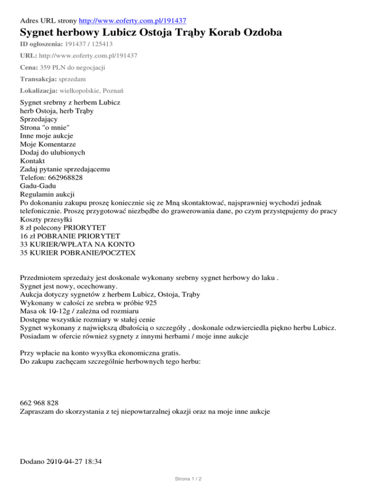 Adres URL strony http://www.eoferty.com.pl/191437 Sygnet herbowy Lubicz Ostoja Trąby Korab Ozdoba ID ogłoszenia: 191437 / 125413 URL: http://www.eoferty.com.pl/191437 Cena: 359 PLN do negocjacji Transakcja: sprzedam Lokalizacja: wielkopolskie, Poznań Sygnet srebrny z herbem Lubicz herb Ostoja, herb Trąby Sprzedający Strona "o mnie" Inne moje aukcje Moje Komentarze Dodaj do ulubionych Kontakt Zadaj pytanie sprzedającemu Telefon: 662968828 Gadu-Gadu Regulamin aukcji Po dokonaniu zakupu proszę koniecznie się ze Mną skontaktować, najsprawniej wychodzi jednak telefonicznie. Proszę przygotować niezbędbe do grawerowania dane, po czym przystępujemy do pracy Koszty przesyłki 8 zł polecony PRIORYTET 16 zł POBRANIE PRIORYTET 33 KURIER/WPŁATA NA KONTO 35 KURIER POBRANIE/POCZTEX Przedmiotem sprzedaży jest doskonale wykonany srebrny sygnet herbowy do laku . Sygnet jest nowy, ocechowany. Aukcja dotyczy sygnetów z herbem Lubicz, Ostoja, Trąby Wykonany w całości ze srebra w próbie 925 Masa ok 10-12g / zależna od rozmiaru Dostępne wszystkie rozmiary w stałej cenie Sygnet wykonany z największą dbałością o szczegóły , doskonale odzwierciedla piękno herbu Lubicz. Posiadam w ofercie również sygnety z innymi herbami / moje inne aukcje Przy wpłacie na konto wysyłka ekonomiczna gratis. Do zakupu zachęcam szczególnie herbownych tego herbu: 662 968 828 Zapraszam do skorzystania z tej niepowtarzalnej okazji oraz na moje inne aukcje Dodano 2010-04-27 18:34 Strona 1 / 2 Sygnet z herbem Ostoja. AlleBaner Dane kontaktowe: Osoba kontaktowa: Weber województwo: wielkopolskie Poznań, Piastowskie 98 telefon: 662 968 828 komunikator GG: 10752160 [email protected] Aktywacja: 23/06/10 19:17, edycja: 31/01/12 10:45, ważność: dożywotnio, odsłony: 2483 Strona 2 / 2