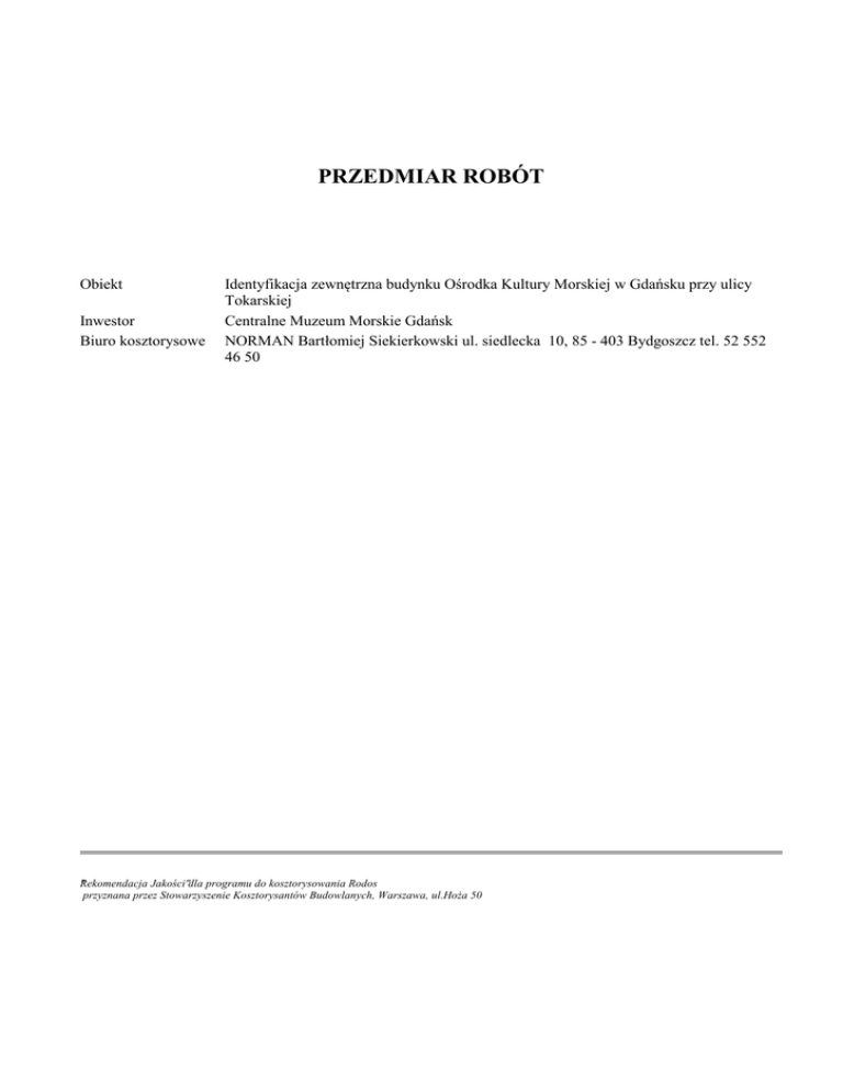 PRZEDMIAR ROBÓT Obiekt Inwestor Biuro kosztorysowe Identyfikacja zewnętrzna budynku Ośrodka Kultury Morskiej w Gdańsku przy ulicy Tokarskiej Centralne Muzeum Morskie Gdańsk NORMAN Bartłomiej Siekierkowski ul. siedlecka 10, 85 - 403 Bydgoszcz tel. 52 552 46 50 " ekomendacja Jakości"dla programu do kosztorysowania Rodos R przyznana przez Stowarzyszenie Kosztorysantów Budowlanych, Warszawa, ul.Hoża 50 Rodos 6.8.9.2 [9834] Tabela przedmiaru robót Identyfikacja zewnętrzna budynku Ośrodka Kultury Morskiej w Gdańsku przy ulicy Tokarskiej Nr Podstawa Opis robót 1 Podświetlane tablice metalowe 1 Kalkulacja Dostawa i montaż tablic grawerowanej w blasze mosiężnej gr. 3 mm o wymiarach 920x1370 indywidualna 2 Kalkulacja Dostawa i montaż tablic grawerowanej w blasze mosiężnej gr. 3 mm o wymiarach 1840x2740 indywidualna 3 Kalkulacja Dostawa i montaż podświetlenia samoprzylepną taśmą ledową indywidualna 4 Strona 2/8 Jm Ilość kpl 1,000 kpl 1,000 kpl 1,000 kpl 1,000 2 Grafika indentyfikacyjna na szybach Kalkulacja Wykonanie logo i napisów na przeszkleniach metodą piaskowania indywidualna Rodos 6.8.9.2 [9834] Kosztorys Identyfikacja zewnętrzna budynku Ośrodka Kultury Morskiej w Gdańsku przy ulicy Tokarskiej Nr Podstawa, opis robót, nakłady Jm Norma Ilość 1 Podświetlane tablice metalowe 1 Kalkulacja indywidualna Dostawa i montaż tablic grawerowanej w blasze mosiężnej gr. 3 mm o wymiarach 920x1370 1 kpl Robocizna Montaż r-g 6,000 Materiały Blachowkręty nierdzewne szt 20,000 Kotwa rozporowa HSA M6 szt 8 8,000 Rura zimnogięta 60x40x3 kg 37,270 Kątownik zimnogięty 50x50x3 kg 13,100 Płaskownik stalowy 12x4 cm kg 6,080 Płaskownik 150x8 kg 2,830 Tablica metalowa 920x1370 szt 1 1,000 Sprzęt Samochód m-g 1,000 Razem pozycja Cena jednostkowa 2 Kalkulacja indywidualna Dostawa i montaż tablic grawerowanej w blasze mosiężnej gr. 3 mm o wymiarach 1840x2740 1 kpl Robocizna Montaż r-g 4,000 Materiały Blachowkręty nierdzewne szt 20,000 Kotwa rozporowa HSA M6 szt 10 10,000 Kątownik 60x40x6 kg 1,430 Płaskownik stalowy 12x4 cm kg 8,580 Płaskownik 150x8 kg 2,830 Płaskownik 60x20 kg 9,970 Tablica metalowa 1840x2420 szt 1 1,000 Śruby M10 szt 4,000 Sprzęt Samochód m-g 1,000 Razem pozycja Cena jednostkowa 3 Kalkulacja indywidualna Dostawa i montaż podświetlenia samoprzylepną taśmą ledową 1 kpl Razem pozycja RAZEM: Podświetlane tablice metalowe Razem k.b. Koszty zakupu Koszty pośrednie Zysk Razem Pozycje uproszczone Razem element 2 Grafika indentyfikacyjna na szybach 4 Kalkulacja indywidualna Wykonanie logo i napisów na przeszkleniach metodą piaskowania 1 kpl Razem pozycja RAZEM: Grafika indentyfikacyjna na szybach Pozycje uproszczone Razem element OGÓŁEM Razem k.b. Koszty zakupu Koszty pośrednie Zysk Pozycje uproszczone Łącznie Podatek VAT Strona 3/8 Cena Robocizna Materiały Sprzęt Rodos 6.8.9.2 [9834] Kosztorys Identyfikacja zewnętrzna budynku Ośrodka Kultury Morskiej w Gdańsku przy ulicy Tokarskiej Nr Podstawa, opis robót, nakłady Jm Norma Ilość Ogółem kosztorys Strona 4/8 Cena Robocizna Materiały Sprzęt Rodos 6.8.9.2 [9834] Strona 5/8 Tabela elementów Identyfikacja zewnętrzna budynku Ośrodka Kultury Morskiej w Gdańsku przy ulicy Tokarskiej Nr Opis robót 1 Podświetlane tablice metalowe 2 Grafika indentyfikacyjna na szybach Wartość Razem Podatek VAT Ogółem kosztorys Rodos 6.8.9.2 [9834] Zestawienie robocizny Identyfikacja zewnętrzna budynku Ośrodka Kultury Morskiej w Gdańsku przy ulicy Tokarskiej Lp Nazwa 1 Montaż Razem Strona 6/8 Jm r-g Ilość 10,000 10,000 Cena Wartość Rodos 6.8.9.2 [9834] Zestawienie materiałów Identyfikacja zewnętrzna budynku Ośrodka Kultury Morskiej w Gdańsku przy ulicy Tokarskiej Lp Nazwa 1 Blachowkręty nierdzewne 2 Kątownik 60x40x6 3 Kątownik zimnogięty 50x50x3 4 Kotwa rozporowa HSA M6 5 Płaskownik 150x8 6 Płaskownik 60x20 7 Płaskownik stalowy 12x4 cm 8 Rura zimnogięta 60x40x3 9 Śruby M10 10 Tablica metalowa 1840x2420 11 Tablica metalowa 920x1370 Razem Strona 7/8 Jm szt kg kg szt kg kg kg kg szt szt szt Ilość 40,000 1,430 13,100 18,000 5,660 9,970 14,660 37,270 4,000 1,000 1,000 Cena Wartość Rodos 6.8.9.2 [9834] Zestawienie sprzętu Identyfikacja zewnętrzna budynku Ośrodka Kultury Morskiej w Gdańsku przy ulicy Tokarskiej Lp Nazwa 1 Samochód Razem Strona 8/8 Jm m-g Ilość 2,000 2,000 Cena Wartość